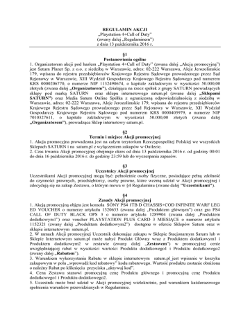 REGULAMIN AKCJI „Playstation 4+Call of Duty” (zwany dalej „Regulaminem”) z dnia 13 października 2016 r. §1 Postanowienia ogólne 1. Organizatorem akcji pod hasłem „Playstation 4+Call of Duty” (zwana dalej „Akcją promocyjną”) jest Saturn Planet Sp. z o.o. z siedzibą w Warszawie, adres: 02-222 Warszawa, Aleje Jerozolimskie 179, wpisana do rejestru przedsiębiorców Krajowego Rejestru Sądowego prowadzonego przez Sąd Rejonowy w Warszawie, XIII Wydział Gospodarczy Krajowego Rejestru Sądowego pod numerem KRS 0000206770, o numerze NIP 1132490674, o kapitale zakładowym w wysokości 50.000,00 złotych (zwana dalej „Organizatorem”), działająca na rzecz spółek z grupy SATURN prowadzących sklepy pod marką SATURN oraz sklepu internetowego saturn.pl (zwane dalej „Sklepami SATURN”) oraz Media Saturn Online Spółka z ograniczoną odpowiedzialnością z siedzibą w Warszawie, adres: 02-222 Warszawa, Aleje Jerozolimskie 179, wpisana do rejestru przedsiębiorców Krajowego Rejestru Sądowego prowadzonego przez Sąd Rejonowy w Warszawie, XII Wydział Gospodarczy Krajowego Rejestru Sądowego pod numerem KRS 0000403979, o numerze NIP 7010327611, o kapitale zakładowym w wysokości 50.000,00 złotych (zwana dalej „Organizatorem”), prowadząca Sklep internetowy saturn.pl. §2 Termin i miejsce Akcji promocyjnej 1. Akcja promocyjna prowadzona jest na całym terytorium Rzeczypospolitej Polskiej we wszystkich Sklepach SATURN i na saturn.pl z wyłączeniem zakupów w Outlecie. 2. Czas trwania Akcji promocyjnej obejmuje okres od dnia 13 października 2016 r. od godziny 00:01 do dnia 16 października 2016 r. do godziny 23:59 lub do wyczerpania zapasów. §3 Uczestnicy Akcji promocyjnej Uczestnikami Akcji promocyjnej mogą być: pełnoletnie osoby fizyczne, posiadające pełną zdolność do czynności prawnych, przedsiębiorcy, osoby prawne, które wezmą udział w Akcji promocyjnej i zdecydują się na zakup Zestawu, o którym mowa w §4 Regulaminu (zwane dalej "Uczestnikami"). §4 Zasady Akcji promocyjnej 1. Akcją promocyjną objęta jest konsola SONY PS4 1TB D CHASSIS+COD INFINITE WARF LEG ED VOUCHER o numerze artykułu 1320633 (zwana dalej „Produktem głównym”) oraz gra PS4 CALL OF DUTY BLACK OPS 3 o numerze artykułu 1289904 (zwana dalej „Produktem dodatkowym1”) oraz voucher PLAYSTATION PLUS CARD 3 MIESIĄCE o numerze artykułu 1152321 (zwany dalej „Produktem dodatkowym2”) dostępne w ofercie Sklepów Saturn oraz w sklepie internetowym saturn.pl. 2. W ramach Akcji promocyjnej Uczestnik dokonując zakupu w Sklepie Stacjonarnym Saturn lub w Sklepie Internetowym saturn.pl może nabyć Produkt Główny wraz z Produktem dodatkowym1 i Produktem dodatkowym2 w zestawie (zwany dalej „Zestawem”) w promocyjnej cenie uwzględniającej rabat w wysokości wartości Produktu dodatkowego1 i Produktu dodatkowego2 (zwany dalej „Rabatem”). 3. Warunkiem wykorzystania Rabatu w sklepie internetowym saturn.pl jest wpisanie w koszyku zakupowym w polu „wprowadź kod rabatowy” kodu rabatowego. Wartość produktu zostanie obniżona o należny Rabat po kliknięciu przycisku „aktywuj kod”. 4. Cena Zestawu stanowi promocyjną cenę Produktu głównego i promocyjną cenę Produktu dodatkowego1 i Produktu dodatkowego2. 5. Uczestnik może brać udział w Akcji promocyjnej wielokrotnie, pod warunkiem każdorazowego spełnienia warunków przewidzianych w Regulaminie. 6. W przypadku zakupu w sklepie internetowym saturn.pl o zakupie Zestawu w promocyjnej cenie decyduje data złożenia zamówienia. 7. Uczestnikom nie przysługuje prawo do zastrzeżenia szczególnych cech Zestawu objętych Akcją promocyjną. 8. Rabat odliczany jest od ceny brutto towaru i będzie naliczany jednorazowo. Rabaty nie mogą być dzielone. 9. Uczestnikom Akcji promocyjnej nie przysługuje prawo do otrzymania ekwiwalentu pieniężnego w wysokości Rabatu. 10. Akcja promocyjna nie może być łączona z innymi Akcjami promocyjnymi, w tym kodami rabatowymi otrzymanymi w ramach programu Konto Plus §5 Odpowiedzialność 1. Odpowiedzialność Organizatora wobec Uczestnika z tytułu roszczeń związanych z uprawnieniami przyznanymi Uczestnikowi w Regulaminie ograniczona jest do wysokości ceny Zestawu, w trakcie Akcji promocyjnej, którego to roszczenie dotyczy. 2. Powyższe ograniczenie nie wyłącza uprawnień przyznanych Uczestnikom na mocy odrębnych przepisów prawnych. §6 Reklamacje i wymiana towarów 1. Reklamacje Uczestników dotyczące sposobu przeprowadzenia Akcji promocyjnej powinny być zgłaszane w trakcie trwania Akcji promocyjnej oraz przez 21 (dwadzieścia jeden) dni od jej zakończenia w Sklepie Saturn, w którym Uczestnik dokonał zakupu Zestawu, lub pod adresem email: [email protected] z tematem wiadomości "Reklamacja Playstation 4+Call of Duty” lub pod numerem Infolinii : 799 37 37 37 * (* opłata zgodnie z taryfą operatora). 2. Reklamacje składane w formie pisemnej w Sklepie SATURN, w którym dokonano zakupu Zestawu powinny zawierać dopisek „Playstation 4+Call of Duty” oraz powinny zawierać imię i nazwisko Uczestnika, Jego adres zamieszkania, kopię dowodu zakupu oraz dokładny opis stanu faktycznego będącego przyczyną złożenia reklamacji. 3. Postępowanie reklamacyjne, o którym mowa w §6 ust. 1 i 2 Regulaminu, trwa 14 (czternaście) dni od daty wpłynięcia reklamacji. Uczestnik zostanie powiadomiony o rozpatrzeniu reklamacji przez Organizatora listem poleconym wysłanym na adres wskazany przez Uczestnika, telefonicznie lub za pośrednictwem drogi elektronicznej w zależności od formy, w jakiej Uczestnik złożył reklamację. Po wyczerpaniu postępowania reklamacyjnego Uczestnik jest uprawniony do dochodzenia swoich roszczeń na drodze postępowania sądowego. 4. Organizator nie ponosi odpowiedzialności za zmianę miejsca zamieszkania lub zmianę podanego przez Uczestnika adresu do korespondencji, jak również za zmiany innych danych uniemożliwiające prawid
