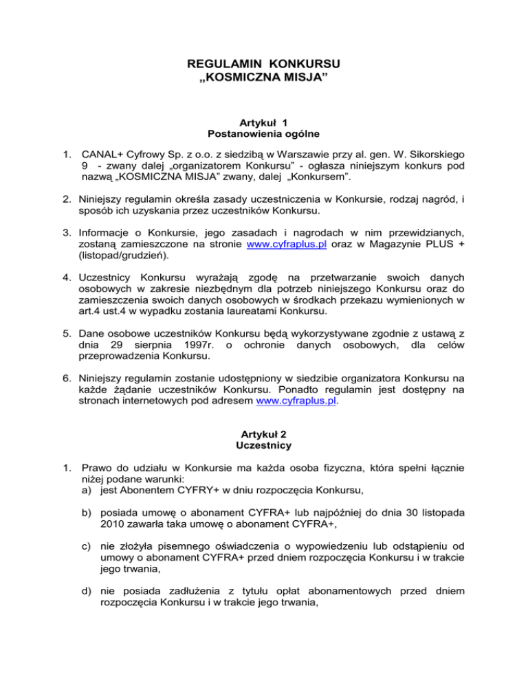 REGULAMIN KONKURSU „KOSMICZNA MISJA” Artykuł 1 Postanowienia ogólne 1. CANAL+ Cyfrowy Sp. z o.o. z siedzibą w Warszawie przy al. gen. W. Sikorskiego 9 - zwany dalej „organizatorem Konkursu” - ogłasza niniejszym konkurs pod nazwą „KOSMICZNA MISJA” zwany, dalej „Konkursem”. 2. Niniejszy regulamin określa zasady uczestniczenia w Konkursie, rodzaj nagród, i sposób ich uzyskania przez uczestników Konkursu. 3. Informacje o Konkursie, jego zasadach i nagrodach w nim przewidzianych, zostaną zamieszczone na stronie www.cyfraplus.pl oraz w Magazynie PLUS + (listopad/grudzień). 4. Uczestnicy Konkursu wyrażają zgodę na przetwarzanie swoich danych osobowych w zakresie niezbędnym dla potrzeb niniejszego Konkursu oraz do zamieszczenia swoich danych osobowych w środkach przekazu wymienionych w art.4 ust.4 w wypadku zostania laureatami Konkursu. 5. Dane osobowe uczestników Konkursu będą wykorzystywane zgodnie z ustawą z dnia 29 sierpnia 1997r. o ochronie danych osobowych, dla celów przeprowadzenia Konkursu. 6. Niniejszy regulamin zostanie udostępniony w siedzibie organizatora Konkursu na każde żądanie uczestników Konkursu. Ponadto regulamin jest dostępny na stronach internetowych pod adresem www.cyfraplus.pl. Artykuł 2 Uczestnicy 1. Prawo do udziału w Konkursie ma każda osoba fizyczna, która spełni łącznie niżej podane warunki: a) jest Abonentem CYFRY+ w dniu rozpoczęcia Konkursu, b) posiada umowę o abonament CYFRA+ lub najpóźniej do dnia 30 listopada 2010 zawarła taka umowę o abonament CYFRA+, c) nie złożyła pisemnego oświadczenia o wypowiedzeniu lub odstąpieniu od umowy o abonament CYFRA+ przed dniem rozpoczęcia Konkursu i w trakcie jego trwania, d) nie posiada zadłużenia z tytułu opłat abonamentowych przed dniem rozpoczęcia Konkursu i w trakcie jego trwania, e) posiada telefon komórkowy wyposażony w funkcje wysyłania i odbierania krótkich wiadomości tekstowych (SMS). 2. Konkurs nie dotyczy Abonentów abonamentowe w formie pre-paid. CYFRY+, którzy uiszczają opłaty 3. W Konkursie nie mogą brać udziału osoby posiadające numer telefonu komórkowego z aktywną funkcją CLIR, uniemożliwiającą identyfikację numeru. Artykuł 3 Zasady konkursu 1. Osoby chcące wziąć udział w Konkursie i spełniające warunki określone w art. 2, zwane dalej „Uczestnikami Konkursu” muszą w terminie od dnia 8 listopada 2010r. do 14 grudnia 2010r. do godziny 23:59 odpowiedzieć prawidłowo na 3 pytania z trzema możliwościami odpowiedzi do wyboru. 2. Aby odpowiedzieć na pierwsze pytanie należy wysłać SMS pod numer 72611, w treści wpisując. – hasło: NASA1 – symbol (A, B lub C), jako odpowiedź na pytanie zamieszczone w magazynie PLUS+ (listopad/grudzień) oraz na www.cyfraplus.pl oddzielone kropką, według wzoru: NASA1.symbol A, B lub C np. NASA1.A SMS nie może zawierać spacji. 3. W SMS-ie zwrotnym „Uczestnik Konkursu”, który odpowiedział prawidłowo na pytanie zgodnie z ust.2, otrzyma drugie pytanie. Aby na nie odpowiedzieć, należy wysłać SMS pod numer 72611, w treści wpisując: – hasło: NASA2 – symbol (A, B lub C), jako odpowiedź na pytanie podane w SMS-ie oddzielone kropką, według wzoru: NASA2.symbol A, B lub C np. NASA2.A SMS nie może zawierać spacji. 4. W SMS-ie zwrotnym Uczestnik Konkursu, który odpowiedział prawidłowo na drugie pytanie zgodnie z ust.3, otrzyma trzecie pytanie. Aby na nie odpowiedzieć, należy wysłać SMS pod numer 72611, w treści wpisując: – hasło: NASA3 – symbol (A, B lub C), jako odpowiedź na pytanie podane w SMS-ie oddzielone kropką, według wzoru: NASA3.symbol A, B lub C np. NASA3.A SMS nie może zawierać spacji. 5. W SMS-ie zwrotnym Uczestnik Konkursu, który odpowiedział prawidłowo na trzecie pytanie, zgodnie z ust. 4, otrzyma informację o awansie do Finału. 6. Jeżeli uczestnik odpowie nieprawidłowo na którekolwiek z pytań, otrzyma odpowiednią informację. 7. Do Uczestnika Konkursu, który awansował do Finału, wyślemy w dniu 15 grudnia 2010r. SMS z informacją o godzinie, od której należy przesłać SMS finałowy. 8. SMS finałowy należy wysłać 15 grudnia 2010r. od godziny podanej w SMS-ie zwrotnym, zgodnie z ust. 7, w treści wpisując: – hasło: NASA – numer Abonenta CYFRY+ oddzielone kropką, według wzoru: NASA.1234567 SMS nie może zawierać spacji. 9. W SMS-ie zwrotnym do Uczestnika Finału, który prześle SMS finałowy od podanej godziny, zgodnie z ust. 8, zostanie wysłany SMS: Dziekujemy za udzial w konkursie „Kosmiczna misja”! Wyniki zamiescimy dnia 20.12.2010r. na stronie www.cyfraplus.pl. 10. SMS finałowy oraz odpowiedzi na wszystkie 3 pytania muszą być wysłane z tego samego numeru telefonu. SMS-y finałowe z innego numeru telefonu nie będą brane pod uwagę przy wyborze Laureatów Konkursu. 11. Koszt każdego SMS-a wysłanego pod numer 72611 wynosi 2 zł netto/2,44 zł brutto. 12. W Konkursie nie mogą brać udziału pracownicy i współpracownicy CANAL+ Cyfrowy sp. z o.o., pracownicy i współpracownicy MNI oraz pracownicy i współpracownicy Discovery . Artykuł 4 Nagrody 1. Spośród wszystkich nadesłanych - zgodnie z procedura opisaną w art. 3 regulaminu - SMS-ów finałowych, zostanie wyłonionych pierwszych 21 (spełniających warunki z art. 2-3), które zostały zarejestrowane w systemie przyjmującym SMS-y od godziny podanej w SMS-ie zwrotnym, zgodnie z art. 3 ust. 8, do godziny 23:59 dnia 15 grudnia 2010 r. 2. Fundatorem nagród jest nadawca kanału Discovery Science to jest Discovery Polska Sp. z o.o. 3. Laureaci Konkursu otrzymają Nagrody w zależności od zajętego miejsca: – 1 miejsce: wyjazd dla 2 osób na Florydę - szczegóły dotyczące nagrody stanowi załącznik nr. 1. – 2-21 miejsce: zestawy nagród od Discovery Science (w skład zestawu wchodzi: plecak, czapka z daszkiem, układanka, kredki, ogrzewacze). 4. Wyłonienie Laureatów na zasadach określonych w ust. 1 odbędzie się w dniu 17 gr
