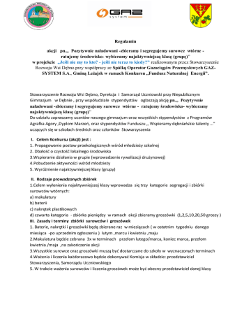 Regulamin akcji pn.,, Pozytywnie naładowani -zbieramy i segregujemy surowce wtórne ratujemy środowisko- wybieramy najaktywniejszą klasę (grupę)” w projekcie „Jeśli nie my to kto? - jeśli nie teraz to kiedy?” realizowanym przez Stowarzyszenie Rozwoju Wsi Dębno przy współpracy ze Spółką Operator Gazociągów Przemysłowych GAZSYSTEM S.A., Gminą Leżajsk w ramach Konkursu ,,Fundusz Naturalnej Energii”. Stowarzyszenie Rozwoju Wsi Dębno, Dyrekcja i Samorząd Uczniowski przy Niepublicznym Gimnazjum w Dębnie , przy współudziale stypendystów ogłaszają akcję pn.,, Pozytywnie naładowani -zbieramy i segregujemy surowce wtórne - ratujemy środowisko- wybieramy najaktywniejszą klasę (grupę)” Do udziału zapraszamy uczniów naszego gimnazjum oraz wszystkich stypendystów z Programów Agrafka Agory ,Dyplom Marzeo, oraz stypendystów Funduszu ,, Wspieramy dębniaoskie talenty …” uczących się w szkołach średnich oraz członków Stowarzyszenia I. Celem Konkursu (akcji) jest : 1. Propagowanie postaw proekologicznych wśród młodzieży szkolnej 2. Dbałośd o czystośd lokalnego środowiska 3.Wspieranie działania w grupie (wprowadzenie rywalizacji drużynowej) 4.Pobudzenie aktywności wśród młodzieży 5. Wyróżnienie najaktywniejszej klasy (grupy) II. Rodzaje prowadzonych zbiórek 1.Celem wyłonienia najaktywniejszej klasy wprowadza się trzy kategorie segregacji i zbiórki surowców wtórnych: a) makulatury b) baterii c) nakrętek plastikowych d) czwarta kategoria - zbiórka pieniędzy w ramach akcji zbieramy groszówki (1,2,5,10,20,50 groszy ) III. Zasady i terminy zbiórki surowców i groszówek 1. Baterie, nakrętki i groszówki będą zbierane raz w miesiącach ( w ostatnim tygodniu danego miesiąca -po uprzednim ogłoszeniu ) lutym ,marcu i kwietniu ,maju 2.Makulatura będzie zebrana 3x w terminach przełom lutego/marca, koniec marca, przełom kwietnia /maja ,na zakooczenie akcji 3.Wszystkie surowce oraz groszówki muszą byd dostarczane do szkoły w wyznaczonych terminach 4.Ważenia i liczenia każdorazowo będzie dokonywad Komisja w składzie: przedstawiciel Stowarzyszenia, Samorządu Uczniowskiego 5. W trakcie ważenia surowców i liczenia groszówek może byd obecny przedstawiciel danej klasy IV. Zasady punktacji Ustala się następującą punktację w zależności od ilości dostarczonych surowców i groszówek: 1. 1 kg makulatury - 1 punkt w przeliczeniu 100 kg - 100 pkt 2. 1 kg baterii - 10 punktów w przeliczeniu 10 kg - 100 pkt 3. 100 nakrętek - 4 punkty w przeliczeniu 2500 nakrętek - 100 pkt 4. 1 złoty w bilonie – 5 punktów w przeliczeniu 20 zł w bilonie - 100 pkt V. Pozostałe zasady Regulaminu 1. Czas trwania konkursu - 15 luty 2016 – 15 maja 2016 2. W konkursie może brad udział (po zgłoszeniu ) pięd klas gimnazjalnych ,szósta drużyna składająca się ze stypendystów Programu Agrafka Agory ,Dyplomu Marzeo ,Funduszu Wspieramy dębniaoskie talentów- śladami naszych absolwentów ” uczących się w szkołach średnich oraz siódma grupa składająca się z członków Stowarzyszenie Rozwoju Wsi Dębno. 3.Stroną organizacyjną Konkursu zajmowad się będzie Stowarzyszenie Rozwoju Wsi Dębno ,Samorząd Uczniowski , stypendyści oraz przedstawiciele poszczególnych klas . 4.Organizatorzy zobowiązują się do zabezpieczenia pomieszczeo do składowania surowców, zapewnienia prawidłowego i rzetelnego odbioru ilościowego surowców i bilonu ( ważenie, liczenie) 5.Organizatorzy zapewnią bieżącą informację o wynikach konkursu na tablicach ogłoszeniowych i stronach internetowych szkoły i Stowarzyszenia VI. Nagrody i wyróżnienia 1.Tytuł najaktywniejszej zdobędzie klasa (grupa),która po podsumowaniu wszystkich czterech zbiórek otrzyma największą ilośd punktów. W przypadku równej ilości punktów o pierwszeostwie decydowad będzie większa ilośd zebranej makulatury 2. Główną nagrodą Konkursu (akcji) za zajęcie I miejsca drużynowo – jest sponsorowany przez Stowarzyszenie wyjazd dla zwycięskiej klasy na jednodniowa wycieczkę 3.Dodatkowo klasy , które zdobyły pierwsze miejsca w poszczególnych kategoriach zbiórek zostaną wyróżnione nagrodami pocieszenia: 3.a .I miejsce w ilości zdobytych punktów w przeliczeniu na 1 osobę z grupy - grupa będzie mogła wytypowad 10 osób na wycieczkę 3.b. I miejsce w zbiórce makulatury - klasa będzie mogła wytypowad 5 osób na wycieczkę - I miejsce w zbiórce baterii - klasa będzie mogła wytypowad 5 osób na wycieczkę - I miejsce w zbiórce nakrętek - klasa będzie mogła wytypowad 5 osób na wycieczkę - I miejsce w zbiórce bilonu - klasa będzie mogła wytypowad 5 osób na wycieczkę 4.Klasa ,która uzyska tytuł najaktywniejszej ( pkt.2) lub zwycięży w klasyfikacji wymienionej w pkt.3.a nie może korzystad z bonusów wymienionych w pkt. 3.b. (dublowanie miejsc) 5.W przypadku wolnych miejsc na wycieczkę ( o ich przydziale zadecyduje Organizator Konkursu) VII. Postanowienia koocowe 1.Regulamin został zatwierdzony przez Organizatorów Konkursu i obowiązuje od 15 lutego do jego zakooczenia 2.W przypadku zaistnienia sytuacji nieopisanych w Regulaminie decyzję podejmuje Komisja w składzie przedstawiciele zarządu Stowarzyszenia oraz Samorządu Uczniowskiego Dyrektor Stowarzyszenie Samorząd szkolny Niepublicznego Gimnazjum Rozwoju Wsi Dębno
