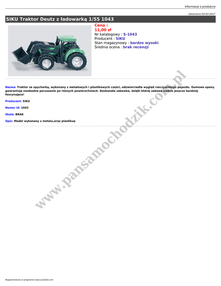 Informacje o produkcie Utworzono 03-03-2017 SIKU Traktor Deutz z ładowarką 1/55 1043 Cena : 11,00 zł .p l Nr katalogowy : S-1043 Producent : SIKU Stan magazynowy : bardzo wysoki Średnia ocena : brak recenzji om Nazwa: Traktor ze spycharką, wykonany z metalowych i plastikowych części, odzwierciedla wygląd rzeczywistego pojazdu. Gumowe opony gwarantują swobodne poruszanie po różnych powierzchniach. Doskonała zabawka, dzięki której zabawa będzie jeszcze bardziej fascynująca! .c Producent: SIKU dz ik Numer id: 1043 Skala: BRAK w w w .p an sa m oc ho Opis: Model wykonany z metalu,oraz plastikuę Wygenerowano w programie www.oscGold.com
