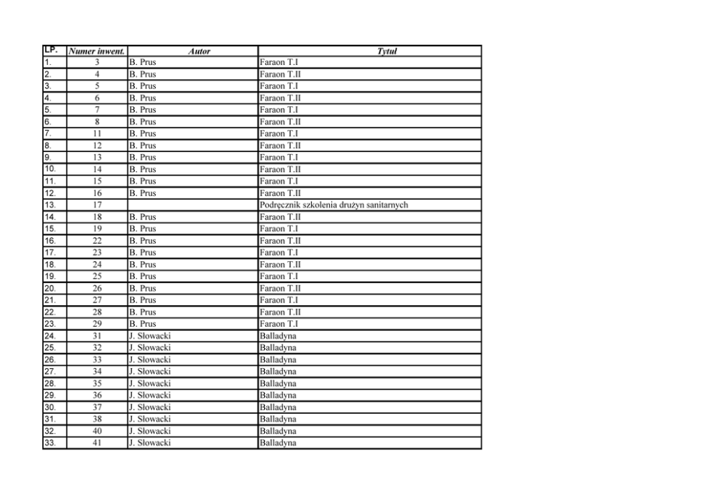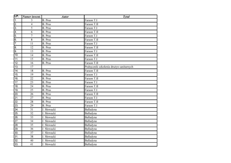 LP. 1. 2. 3. 4. 5. 6. 7. 8. 9. 10. 11. 12. 13. 14. 15. 16. 17. 18. 19. 20. 21. 22. 23. 24. 25. 26. 27. 28. 29. 30. 31. 32. 33. Numer inwent. 3 4 5 6 7 8 11 12 13 14 15 16 17 18 19 22 23 24 25 26 27 28 29 31 32 33 34 35 36 37 38 40 41 Autor B. Prus B. Prus B. Prus B. Prus B. Prus B. Prus B. Prus B. Prus B. Prus B. Prus B. Prus B. Prus B. Prus B. Prus B. Prus B. Prus B. Prus B. Prus B. Prus B. Prus B. Prus B. Prus J. Słowacki J. Słowacki J. Słowacki J. Słowacki J. Słowacki J. Słowacki J. Słowacki J. Słowacki J. Słowacki J. Słowacki Tytuł Faraon T.I Faraon T.II Faraon T.I Faraon T.II Faraon T.I Faraon T.II Faraon T.I Faraon T.II Faraon T.I Faraon T.II Faraon T.I Faraon T.II Podręcznik szkolenia drużyn sanitarnych Faraon T.II Faraon T.I Faraon T.II Faraon T.I Faraon T.II Faraon T.I Faraon T.II Faraon T.I Faraon T.II Faraon T.I Balladyna Balladyna Balladyna Balladyna Balladyna Balladyna Balladyna Balladyna Balladyna Balladyna 34. 35. 36. 37. 38. 39. 40. 41. 42. 43. 44. 45. 46. 47. 48. 49. 50. 51. 52. 53. 54. 55. 56. 57. 58. 59. 60. 61. 62. 63. 64. 65. 66. 67. 42 43 44 45 46 47 48 49 50 51 52 54 55 56 60 61 66 68 69 70 72 77 78 79 81 82 83 85 86 87 88 90 91 92 J. Słowacki J. Słowacki J. Słowacki J. Słowacki J. Słowacki J. Słowacki J. Słowacki J. Słowacki J. Słowacki B. Prus B. Prus B. Prus B. Prus B. Prus A. Mackiewicz A. Mickiewicz H. Balzak L. Kruczkowski L. Kruczkowski L. Kruczkowski L. Kruczkowski G. Zapolska G. Zapolska G. Zapolska G. Zapolska G. Zapolska G. Zapolska G. Zapolska Sofokles Sofokles Sofokles Sofokles Sofokles Sofokles Balladyna Balladyna Balladyna Balladyna Balladyna Balladyna Balladyna Balladyna Balladyna Lalka T.I Lalka T.II Lalka T.II Lalka T.I Lalka T.II Powieści poetyckie Dzieła poetyckie Ojcec Goriot Niemcy Niemcy Niemcy Niemcy Moralność pani Dulskiej Moralność pani Dulskiej Moralność pani Dulskiej Moralność pani Dulskiej Moralność pani Dulskiej Moralność pani Dulskiej Moralność pani Dulskiej Antygona Antygona Antygona Antygona Antygona Antygona 68. 69. 70. 71. 72. 73. 74. 75. 76. 77. 78. 79. 80. 81. 82. 83. 84. 85. 86. 87. 88. 89. 90. 91. 92. 93. 94. 95. 96. 97. 98. 99. 100. 101. 93 95 96 97 98 99 100 100 101 102 104 105 106 107 108 110 113 114 119 120 121 122 123 124 125 129 135 136 137 138 139 140 141 142 Sofokles Sofokles Sofokles Sofokles Sofokles Sofokles Sofokles H.Mortkowicz Sofokles Sofokles Sofokles Sofokles Sofokles Sofokles Sofokles Sofokles Wł. ST.Reymont Wł. ST. Reymont M. Twain M. Twain M. Twain M. Twain M. Twain M. Twain M. Twain M. Twain A. Tołstoj Stendhal Stendhal Stendhal Stendhal Stendhal Stendhal Stendhal Antygona Antygona Antygona Antygona Antygona Antygona Antygona O Stefanie Żeromskim Antygona Antygona Antygona Antygona Antygona Antygona Antygona Antygona Chłopi T. III Chłopi T. IV Nieszczęsny narzeczony Aurelii Nieszczęsny narzeczony Aurelii Nieszczęsny narzeczony Aurelii Nieszczęsny narzeczony Aurelii Nieszczęsny narzeczony Aurelii Nieszczęsny narzeczony Aurelii Nieszczęsny narzeczony Aurelii Nieszczęsny narzeczony Aurelii Hadżi-Murat i opowiad. Czerwone i czarne T.I Czerwone i czarne T II Czerwone i czarne T.I Czerwone i czarne T II Czerwone i czarne T.I Czerwone i czarne T II Czerwone i czarne T.I 102. 103. 104. 105. 106. 107. 108. 109. 110. 111. 112. 113. 114. 115. 116. 117. 118. 119. 120. 121. 122. 123. 124. 125. 126. 127. 128. 129. 130. 131. 132. 133. 134. 135. 143 144 148 149 151 152 161 169 173 174 177 178 180 181 182 183 184 186 187 188 189 191 192 196 202 203 210 211 212 213 215 217 218 222 Stendhal Stendhal Stendhal Stendhal Stendhal Stendhal J. Dziarnowska J. Dziarnowska A. Fredro A. Fredro A. Fredro A. Fredro A. Fredro A. Fredro A. Fredro A. Fredro A. Fredro A. Fredro A. Fredro A. Fredro A. Fredro E. Orzeszkowa E. Orzeszkowa Molier Molier Molier W. Szekspir W. Szekspir W. Szekspir W. Szekspir W. Szekspir W. Szekspir W. Szekspir W. Szekspir Czerwone i czarne T II Czerwone i czarne T.I Czerwone i czarne T.I Czerwone i czarne T II Czerwone i czarne T.II Czerwone i czarne T.I …gdy inni dziećmi są …gdy inni dziećmi są Śluby panieńskie Śluby panieńskie Śluby panieńskie Śluby panieńskie Śluby panieńskie Śluby panieńskie Śluby panieńskie Śluby panieńskie Śluby panieńskie Śluby panieńskie Śluby panieńskie Śluby panieńskie Śluby panieńskie Marta Cham Skąpiec Skąpiec Skąpiec Makbet Makbet Makbet Makbet Makbet Makbet Makbet Makbet 136. 137. 138. 139. 140. 141. 142. 143. 144. 145. 146. 147. 148. 149. 150. 151. 152. 153. 154. 155. 156. 157. 158. 159. 160. 161. 162. 163. 164. 165. 166. 167. 168. 169. 223 224 225 226 227 228 229 230 231 233 234 235 236 237 238 239 240 241 242 243 244 246 247 248 251 255 256 258 259 260 261 262 263 264 W. Szekspir W. Szekspir J. Steinbeck J. Steinbeck J. Steinbeck J. Steinbeck J. Steinbeck J. Steinbeck J. Steinbeck J. Steinbeck J. Steinbeck J. Steinbeck J. Steinbeck J. Steinbeck J. Steinbeck J. Steinbeck J. Steinbeck J. Steinbeck J. Steinbeck J. Steinbeck J. Steinbeck J. Steinbeck J. Steinbeck H. Balzac H. Balzac H. Balzak H. Balzac K. Paustowski K. Paustowski K. Paustowski K. Paustowski K. Paustowski K. Paustowski K. Paustowski Makbet Makbet Kasztanek. Perła Kasztanek. Perła Kasztanek. Perła Kasztanek. Perła Kasztanek. Perła Kasztanek. Perła Kasztanek. Perła Kasztanek. Perła Kasztanek. Perła Kasztanek. Perła Kasztanek. Perła Kasztanek. Perła Kasztanek. Perła Kasztanek. Perła Kasztanek. Perła Kasztanek. Perła Kasztanek. Perła Kasztanek. Perła Kasztanek. Perła Kasztanek. Perła Kasztanek. Perła Ojciec Goriot Ojciec Goriot Ojciec Balzac Ojciec Goriot Opowieść północna Opowieść północna Opowieść północna Opowieść północna Opowieść północna Opowieść północna Opowieść północna 170. 171. 172. 173. 174. 175. 176. 177. 178. 179. 180. 181. 182. 183. 184. 185. 186. 187. 188. 189. 190. 191. 192. 193. 194. 195. 196. 197. 198. 199. 200. 201. 202. 203. 265 266 267 270 271 273 278 279 280 282 