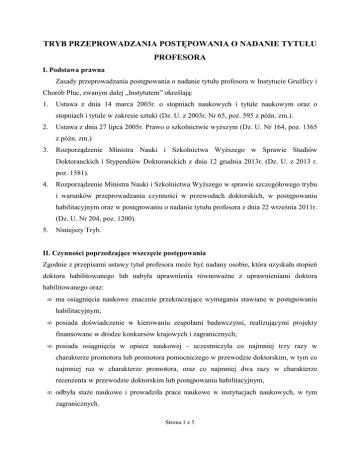 TRYB PRZEPROWADZANIA POSTĘPOWANIA O NADANIE TYTUŁU PROFESORA I. Podstawa prawna Zasady przeprowadzania postępowania o nadanie tytułu profesora w Instytucie Gruźlicy i Chorób Płuc, zwanym dalej „Instytutem” określają: 1. Ustawa z dnia 14 marca 2003r. o stopniach naukowych i tytule naukowym oraz o stopniach i tytule w zakresie sztuki (Dz. U. z 2003r. Nr 65, poz. 595 z późn. zm.). 2. Ustawa z dnia 27 lipca 2005r. Prawo o szkolnictwie wyższym (Dz. U. Nr 164, poz. 1365 z późn. zm.) 3. Rozporządzenie Ministra Nauki i Szkolnictwa Wyższego w Sprawie Studiów Doktoranckich i Stypendiów Doktoranckich z dnia 12 grudnia 2013r. (Dz. U. z 2013 r. poz. 1581). 4. Rozporządzenie Ministra Nauki i Szkolnictwa Wyższego w sprawie szczegółowego trybu i warunków przeprowadzania czynności w przewodach doktorskich, w postępowaniu habilitacyjnym oraz w postępowaniu o nadanie tytułu profesora z dnia 22 września 2011r. (Dz. U. Nr 204, poz. 1200). 5. Niniejszy Tryb. II. Czynności poprzedzające wszczęcie postępowania Zgodnie z przepisami ustawy tytuł profesora może być nadany osobie, która uzyskała stopień doktora habilitowanego lub nabyła uprawnienia równoważne z uprawnieniami doktora habilitowanego oraz: • ma osiągnięcia naukowe znacznie przekraczające wymagania stawiane w postępowaniu habilitacyjnym; • posiada doświadczenie w kierowaniu zespołami badawczymi, realizującymi projekty finansowane w drodze konkursów krajowych i zagranicznych; • posiada osiągnięcia w opiece naukowej - uczestniczyła co najmniej trzy razy w charakterze promotora lub promotora pomocniczego w przewodzie doktorskim, w tym co najmniej raz w charakterze promotora, oraz co najmniej dwa razy w charakterze recenzenta w przewodzie doktorskim lub postępowaniu habilitacyjnym, • odbyła staże naukowe i prowadziła prace naukowe w instytucjach naukowych, w tym zagranicznych. Strona 1 z 5 Centralna Komisja może, w szczególnych przypadkach, na wniosek Rady Naukowej Instytutu, dopuścić do wszczęcia postępowania o nadanie tytułu profesora osobie, która uzyskała stopień doktora i posiada wybitne osiągnięcia naukowe lub artystyczne. Wszczęcie postępowania o nadanie tytułu profesora następuje na wniosek osoby ubiegającej się o uzyskanie tytułu. Osoba, wobec której wszczyna się przed Radą Naukową Instytutu postępowanie o nadanie tytułu profesora, składa Dyrektorowi Instytutu wniosek o nadanie tytułu profesora wraz z następującymi dokumentami: 1) oryginały albo poświadczone kopie dokumentów stwierdzających posiadanie stopni doktora i doktora habilitowanego albo kwalifikacji I i II stopnia w zakresie sztuki i dyscypliny artystycznej albo decyzji o nabyciu uprawnień równoważnych z uprawnieniami doktora habilitowanego; 2) autoreferat przedstawiający osiągnięcia naukowe, informację o osiągnięciach w zakresie opieki naukowej i kształcenia młodej kadry, w tym o ukończonych przewodach doktorskich, w których osoba ta pełniła funkcję promotora lub promotora pomocniczego, oraz o działalności popularyzującej naukę, w języku polskim i angielskim; 3) ankietę oceny osiągnięć naukowych po uzyskaniu stopnia doktora habilitowanego, ze wskazaniem, które z tych osiągnięć uznaje za najważniejsze, sporządzoną według wzoru określonego w załączniku nr 2 do Rozporządzenia MNiSW w sprawie szczegółowego trybu i warunków przeprowadzania czynności w przewodach doktorskich, w postępowaniu habilitacyjnym oraz w postępowaniu o nadanie tytułu profesora z dnia 22.09.2011, Dz. U. Nr 204, poz. 1200) w języku polskim i angielskim. Wniosek o nadanie tytułu profesora wraz z załącznikami przedkłada się w formie elektronicznej i w formie papierowej. Po dokonaniu oceny formalnej wniosku osobie ubiegającej się o nadanie tytułu profesora zwraca się oryginały w.w. dokumentów. Dokumentację wymaganą do wszczęcia postępowania o nadanie tytułu naukowego zainteresowany sporządza w siedmiu egzemplarzach i przekazuje osobiście do Działu Strona 2 z 5 Planowania Naukowego, najpóźniej na dwa tygodnie przed planowanym posiedzeniem Rady Naukowej Instytutu, która ma rozpatrywać wniosek: • pięć kompletów dokumentów kandydata jest wysyłanych do recenzentów dorobku kandydata powołanych przez Centralną Komisję; • jeden z pozostałych kompletów dokumentów jest przechowywany w archiwum; • jeden jest wysyłany do Centralnej Komisji. III. Wszczęcie postępowania o nadanie tytułu profesora; wyznaczenie kandydatów na recenzentów Na posiedzeniu Rady Naukowej Instytutu Dyrektor Instytutu przedstawia sylwetkę i dorobek naukowy kandydata. Rada Naukowa Instytutu podejmuje uchwały o: • wszczęciu postępowania o nadanie tytułu profesora, • wyznaczeniu kandydatów na recenzentów, Uchwały są podejmowane w głosowaniu tajnym i zapadają bezwzględną większością głosów przy obecności przynajmniej połowy ogólnej liczby osób uprawnionych do głosowania. W głosowaniu mogą brać udział członkowie Rady Naukowej Instytutu posiadający tytuł naukowy profesora lub stopień naukowy doktora habilitowanego, Dyrektor Instytutu, Zastępcy Dyrektora, Główny Księgowy posiadający stopień naukowy doktora habilitowanego lub tytuł naukowy, zatrudnieni w pełnym wymiarze czasu pracy w Instytucie oraz, od momentu ich powołania recenzenci dorobku naukowego kandydata. Rada Naukowa Instytutu przekazuje Centralnej Komisji listę co najmniej dziesięciu kandydatów na recenzentów, spośród osób nie będących pracownikami Instytutu ani członkami Rady Naukowej Instytutu. W postępowaniu o nadanie tytułu profesora Centralna Komisja powołuje pięciu recenzentów o renomie międzynarodowej spośród osób zaproponowanych przez Radę Naukową Instytutu lub spośród innych osób. Dyrektor Instytutu, po otrzymaniu z Centralnej Komisji powiadomienia o powołaniu pięciu recenzentów, niezwłocznie zleca im sporządzenie, w terminie nie dłuższym 