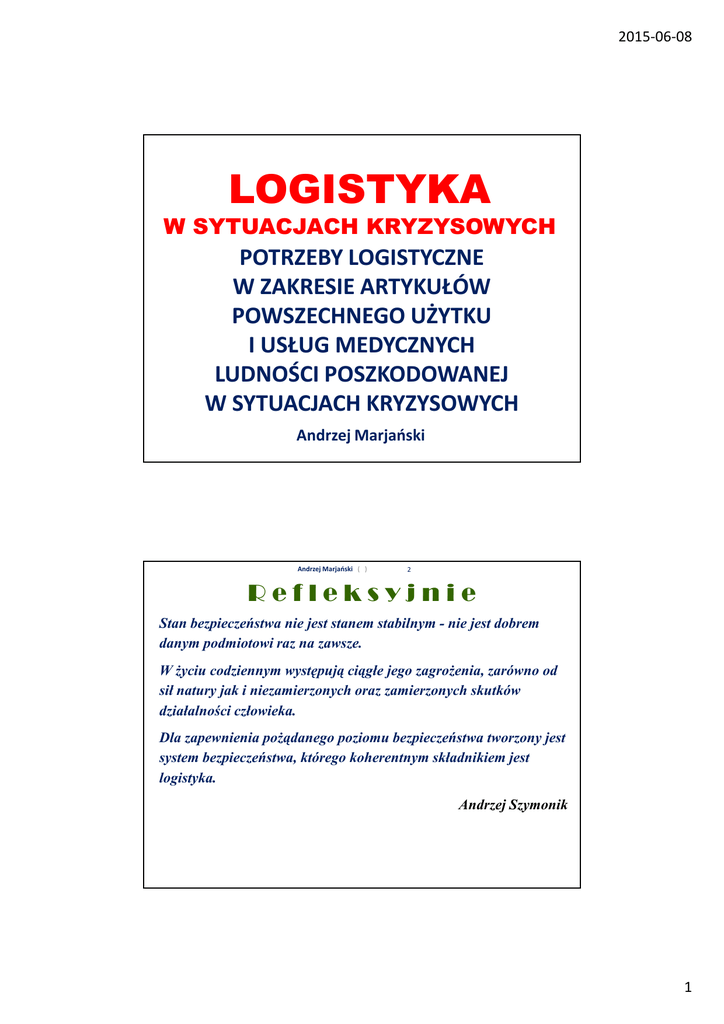 2015-06-08 LOGISTYKA W SYTUACJACH KRYZYSOWYCH POTRZEBY LOGISTYCZNE W ZAKRESIE ARTYKUŁÓW POWSZECHNEGO UŻYTKU I USŁUG MEDYCZNYCH LUDNOŚCI POSZKODOWANEJ W SYTUACJACH KRYZYSOWYCH Andrzej Marjański Andrzej Marjański ( ) 2 Refleksyjnie Stan bezpieczeństwa nie jest stanem stabilnym - nie jest dobrem danym podmiotowi raz na zawsze. W życiu codziennym występują ciągłe jego zagrożenia, zarówno od sił natury jak i niezamierzonych oraz zamierzonych skutków działalności człowieka. Dla zapewnienia pożądanego poziomu bezpieczeństwa tworzony jest system bezpieczeństwa, którego koherentnym składnikiem jest logistyka. Andrzej Szymonik 1 2015-06-08 Andrzej Marjański ( 43 ) 3 Agenda Zapotrzebowanie na artykuły powszechne użytku Dostarczanie potrzebnych artykułów Nośniki energii Paliwa Usługi logistyczne Pomoc medyczna Andrzej Marjański ( 43 ) 4 Zapotrzebowanie na dostawy artykułów powszechnego użytku Do artykułów powszechnego użytku zalicza się zwykle sprzęt (przedmioty) gospodarstwa domowego , środki higieny osobistej, środki czystości, zastępcze źródła światła (latarki, lampy naftowe, świece, zapałki) itp. W sytuacjach kryzysowych ludność czasami traci cały swój dobytek i mogą być konieczne również dostawy ubrań, obuwia, pościeli itp. 2 2015-06-08 Andrzej Marjański ( 43 ) 5 Zapotrzebowanie na dostawy artykułów powszechnego użytku Sytuacjom kryzysowym towarzyszą często ekstremalne zjawiska pogodowe, takie jak np. bardzo niskie lub bardzo wysokie temperatury, bardzo intensywne opady deszczu – latem, a śniegu – zimą, silne nasłonecznienie. W takich przypadkach, w zależności od występujących czynników pogodowych, mogą być potrzebne dodatkowe dostawy innych artykułów. Andrzej Marjański ( 43 ) 6 Zapotrzebowanie na dostawy artykułów powszechnego użytku Przy niskich temperaturach będzie to ciepła odzież, ciepła pościel (kołdry, śpiwory, dodatkowe koce), ciepłe obuwie, a ponadto środki (kremy)przeciw odmrożeniowe; Podczas upałów (silnego nasłonecznienia) – okulary przeciwsłoneczne oraz letnie (ochronne) nakrycia głowy Podczas intensywnych opadów deszczu – obuwie gumowe oraz ubrania (okrycia) przeciwdeszczowe, parasole itp. Zawsze występuje zapotrzebowanie na ogólnodostępne (bez recepty) leki i materiały opatrunkowe. 3 2015-06-08 Andrzej Marjański ( 43 ) 7 Dostarczenie przedmiotów powszechnego użytku Nie można wykluczyć dostaw takich przedmiotów jak np. nart i sanek – zimą, pontonów i łódek – podczas powodzi, ręcznych narzędzi (łopat, grabi, siekier, młotków), indywidualnych środków transportu (rowerów, wózków, taczek), drobnego sprzętu kwaterunkowego (namiotów, łóżek polowych, taboretów, stołów, szafek) itp. Andrzej Marjański ( 43 ) 8 Zapotrzebowanie na dostawy innych rodzajów zaopatrzenia Do innych rodzajów zaopatrzenia, które może okazać się niezbędne do zapewnienia warunków przetrwania ludności poszkodowanej w sytuacjach kryzysowych zalicza się: sprzęt i nośniki energii, paliwa płynne do pojazdów mechanicznych, sprzęt przeciwpożarowy, środki i sprzęt przeciwpowodziowy; środki (worki) do gromadzenia i wywozu śmieci (odpadów), sprzęt i środki do prowadzenia dezynfekcji. 4 2015-06-08 Andrzej Marjański ( 43 ) 9 Nośniki energii Sprzęt i nośniki energii niezbędne w sytuacjach kryzysowych: piecyki polowe, nagrzewnice, koksowniki, agregaty prądotwórcze, butle gazowe, opał (drewno, węgiel, koks, brykiety, olej opałowy). Andrzej Marjański ( 43 ) 10 Paliwa Paliwa płynne to przede wszystkim: benzyna samochodowa, olej napędowy, gaz oleje techniczne do pojazdów mechanicznych ludności poszkodowanej. 5 2015-06-08 Andrzej Marjański ( 43 ) 11 Sprzęt przeciwpożarowy Sprzęt przeciwpożarowy to przede wszystkim różnego rodzaju: gaśnice, drabiny, bosaki, topory. Andrzej Marjański ( 43 ) 12 Sprzęt przeciwpowodziowy Środki i sprzęt przeciwpowodziowy: łodzie, pontony, worki z piaskiem (worki do napełniania piaskiem) koła ratunkowe, kamizelki i kapoki itp 6 2015-06-08 Andrzej Marjański ( 43 ) 13 Usuwanie śmieci i dezynfekcja Środki (worki) do gromadzenia i wywozu śmieci (odpadów) są jednym z lepszych rozwiązań stosowanych dla utrzymania czystości w sytuacjach kryzysowych. Sprzęt i środki do dezynfekcji w sytuacjach kryzysowych wydawane są ludności poszkodowanej do indywidualnego prowadzenia zabiegów odkażających. Oprócz sprzętu (np. spryskiwaczy) oraz środków dezynfekcyjnych, wydawane są również środki osobistej ochrony (maski, respiratory). Andrzej Marjański ( 43 ) 14 Usługi logistyczne świadczone ludności poszkodowanej Do usług specjalistycznych świadczonych ludności poszkodowanej w sytuacjach kryzysowych należą usługi transportowe i przeładunkowe oraz usługi remontowe 7 2015-06-08 Andrzej Marjański ( 43 ) 15 Usługi logistyczne świadczone ludności poszkodowanej Usługi transportowe związane są przede wszystkim z realizacją: dostaw zaopatrzenia, ewakuacją ludności poszkodowanej do tymczasowych miejsc (rejonów) zakwaterowania, ewakuacją jej mienia (dobytku), ewakuacją zasobów (zapasów); materiałowych, technicznych, kulturowych innych. Specyficzną usługą transportową jest ewakuacja medyczna. Andrzej Marjański ( 43 ) 16 Transport W zależności od rodzaju usługi przewozowej, jej zakresu (skali, wielkości), odległości przewozu oraz dostępności środków transportowych i infrastruktury transportowej (dróg, linii, obiektów transportowych), w sytuacjach kryzysowych może być wykorzystywany transport: Samochodowy (drogowy), kolejowy, powietrzny wodny (morski i śródlądowy). 8 2015-06-08 Andrzej Marjański ( 43 ) 17 Transport – ewakuacja piesza W wypadku konieczności ewakuacji ludzi z rejonów zagrożonych bądź dotkniętych klęską żywiołową może być zarządzona również ewakuacji piesza dotyczy ona osób dorosłych i zdrowych Andrzej Marjański ( 43 ) 18 Usługi przeładu