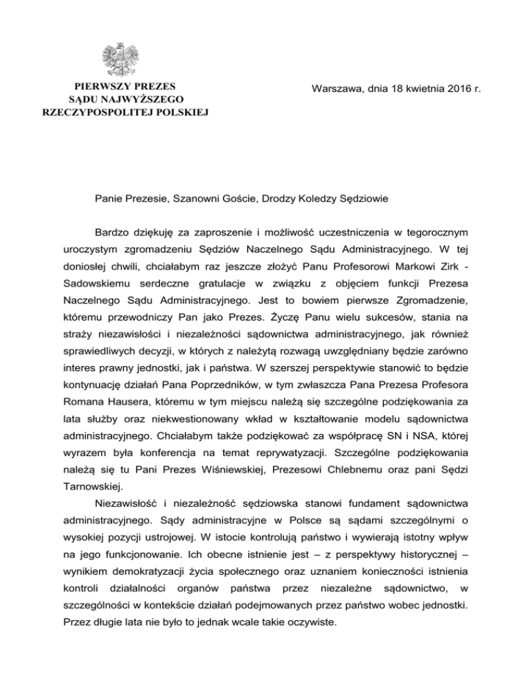 arszawa, dnia PIERWSZY PREZES SĄDU NAJWYŻSZEGO RZECZYPOSPOLITEJ POLSKIEJ Warszawa, dnia 18 kwietnia 2016 r. Panie Prezesie, Szanowni Goście, Drodzy Koledzy Sędziowie Bardzo dziękuję za zaproszenie i możliwość uczestniczenia w tegorocznym uroczystym zgromadzeniu Sędziów Naczelnego Sądu Administracyjnego. W tej doniosłej chwili, chciałabym raz jeszcze złożyć Panu Profesorowi Markowi Zirk Sadowskiemu serdeczne gratulacje w związku z objęciem funkcji Prezesa Naczelnego Sądu Administracyjnego. Jest to bowiem pierwsze Zgromadzenie, któremu przewodniczy Pan jako Prezes. Życzę Panu wielu sukcesów, stania na straży niezawisłości i niezależności sądownictwa administracyjnego, jak również sprawiedliwych decyzji, w których z należytą rozwagą uwzględniany będzie zarówno interes prawny jednostki, jak i państwa. W szerszej perspektywie stanowić to będzie kontynuację działań Pana Poprzedników, w tym zwłaszcza Pana Prezesa Profesora Romana Hausera, któremu w tym miejscu należą się szczególne podziękowania za lata służby oraz niekwestionowany wkład w kształtowanie modelu sądownictwa administracyjnego. Chciałabym także podziękować za współpracę SN i NSA, której wyrazem była konferencja na temat reprywatyzacji. Szczególne podziękowania należą się tu Pani Prezes Wiśniewskiej, Prezesowi Chlebnemu oraz pani Sędzi Tarnowskiej. Niezawisłość i niezależność sędziowska stanowi fundament sądownictwa administracyjnego. Sądy administracyjne w Polsce są sądami szczególnymi o wysokiej pozycji ustrojowej. W istocie kontrolują państwo i wywierają istotny wpływ na jego funkcjonowanie. Ich obecne istnienie jest – z perspektywy historycznej – wynikiem demokratyzacji życia społecznego oraz uznaniem konieczności istnienia kontroli działalności organów państwa przez niezależne sądownictwo, w szczególności w kontekście działań podejmowanych przez państwo wobec jednostki. Przez długie lata nie było to jednak wcale takie oczywiste. 2 Warto szczególnie dziś pamiętać, że samodzielność i niezależność sądownictwa administracyjnego stanowi olbrzymie osiągnięcie, które zwieńczyło długoletnią drogę kształtowania relacji pomiędzy władzą sądowniczą i wykonawczą wpisaną w konstytucyjną zasadę trójpodziału władz. Zasadę, która obecnie wystawiona została na ciężką próbę. Nie zapominajmy jednak, że wyposażenie władzy sądowniczej w atrybut niezależności oraz niezawisłości związane jest z olbrzymią odpowiedzialnością, jaka ciąży na władzy sądowniczej, w tym również sądownictwie administracyjnym. Często w bardzo uproszczony sposób spogląda się na te podstawy ustrojowe sądownictwa administracyjnego, upatrując w nich tylko przywilejów przysługujących sędziom. Nic bardziej mylnego. Służą one przede wszystkim ochronie praw jednostki, ponieważ to ona domaga się ochrony w zaistniałym sporze. Brak wspomnianych atrybutów prowadzi do tego, że sprawowanie wymiaru sprawiedliwości staje się pozorne. Sam sąd nie korzysta bowiem z instrumentów ochrony, które pozwalają mu na samodzielne i w pełni niezawisłe podejmowanie rozstrzygnięć. Problem ten widać w szczególności w relacji jednostka – państwo i działająca w jego imieniu administracja publiczna. To jednostka jest niewątpliwie słabszą stroną tego sporu. Nie posiada ani aparatu władzy, ani nie może jej w żadnym stopniu wykonywać. Warto zatem podkreślić, że gwarancje niezawisłości sędziowskiej znajdujące wyraz w szeregu szczególnych uprawnień sędziów nie stanowi osobistych przywilejów, ale jest wyrazem dążenia do zagwarantowania efektywnej ochrony jednostki. Chodzi zwłaszcza o zapewnienie każdemu prawa do sądu, przez co rozumie się uprawnienie do rozpatrzenia sprawy w sposób sprawiedliwy, jawny i bez nieuzasadnionej zwłoki przez właściwy, niezależny, bezstronny i niezawisły sąd (art. 45 ust. 1 Konstytucji). Podstawowym założeniem (…) nie może tu więc być dobro pojmowanego wąsko wymiaru sprawiedliwości ani ochrona interesów osób zatrudnionych w organach władzy sądowniczej, ale dążenie do sprawnego i rzetelnego wykonywania zadań publicznych, do których sądy zostały powołane.” W tym zakresie, ze względu na jego ustrojową funkcję, szczególna rola przypada sądownictwu administracyjnemu, w którym niejednokrotnie na przestrzeni ostatnich lat dawano wyraz dbałości o prawa jednostek w relacji do działań administracji publicznej. Dyrektywy płynące z zasad zawartych w art. 7 i 8 k.pa. są ciągle obecne w orzecznictwie sądów administracyjnych, stanowiąc jedno z wielu kryteriów oceny działań administracji publicznej. Wynika to wprost ze sprawozdań 3 z działalności Naczelnego Sądu Administracyjnego oraz wojewódzkich sądów administracyjnych. Obecnie, powszechne jest w orzecznictwie odwoływanie się - w celu poszukiwania ochrony jednostki - do regulacji prawa międzynarodowego, jak i przepisów Konstytucji RP. Z drugiej jednak strony nadmierne uwzględnienie interesu jednostki niesie za sobą określone ryzyka dla organów administracji publicznej, władzy wykonawczej a szerzej państwa. Nie można zatem tracić z pola widzenia, że również ochrona jednostki, jak i realizacja jej interesu ma swoje granice. W pierwszej kolejności wyznacza je konieczność dbałości o państwo. Mówiąc o tej kwestii mam przede wszystkim na myśli orzecznictwo dotyczące dostępu do informacji publicznej. Jest faktem powszechnie znanym, że od dłuższego czasu czeka w Trybunale Konstytucyjnym na rozpoznanie wniosek Pierwszego Prezesa Sądu Najwyższego dotyczący zbadania zgodności z Konstytucją ustawy o dostępie do informacji publicznej. Jest również rzeczą powszechnie znaną, że wniosek ten został wywołany w głównej mierze szeregiem rozstrzygnięć sądów administracyjnych, której stroną był Sąd Najwyższy, a które w sposób bardzo nadmie