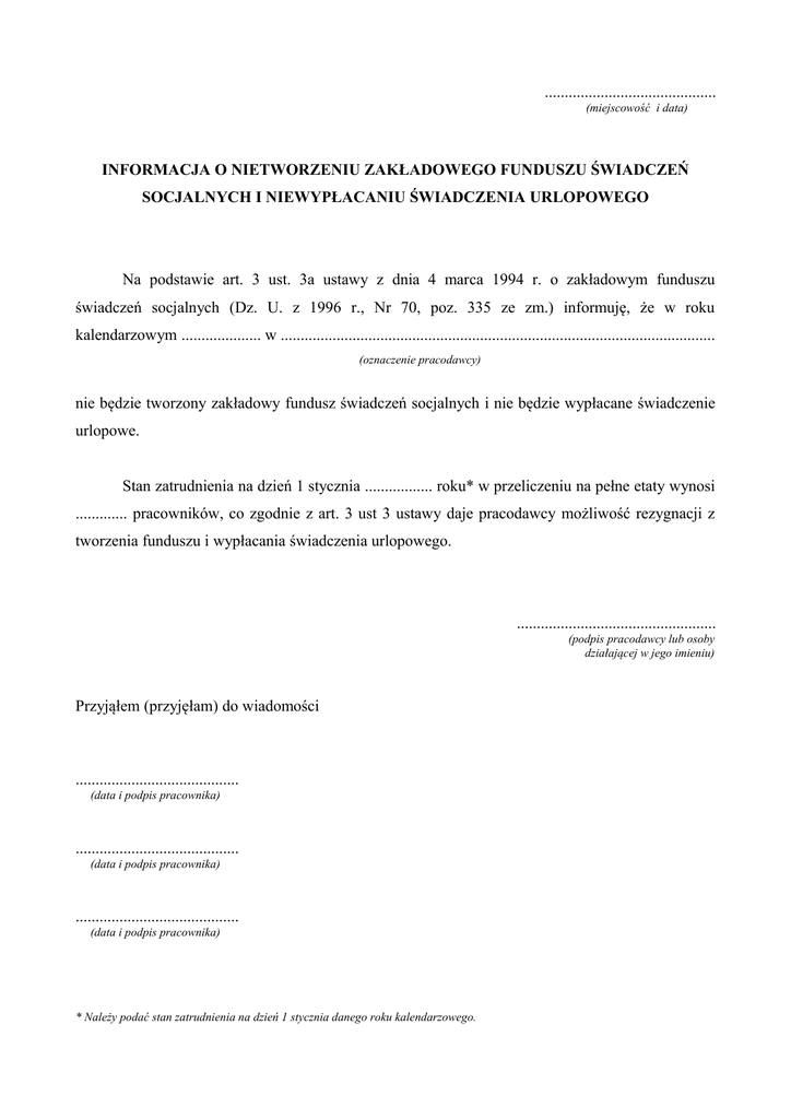 1 ........................................... (miejscowość i data) INFORMACJA O NIETWORZENIU ZAKŁADOWEGO FUNDUSZU ŚWIADCZEŃ SOCJALNYCH I NIEWYPŁACANIU ŚWIADCZENIA URLOPOWEGO Na podstawie art. 3 ust. 3a ustawy z dnia 4 marca 1994 r. o zakładowym funduszu świadczeń socjalnych (Dz. U. z 1996 r., Nr 70, poz. 335 ze zm.) informuję, że w roku kalendarzowym .................... w ............................................................................................................. (oznaczenie pracodawcy) nie będzie tworzony zakładowy fundusz świadczeń socjalnych i nie będzie wypłacane świadczenie urlopowe. Stan zatrudnienia na dzień 1 stycznia ................. roku* w przeliczeniu na pełne etaty wynosi ............. pracowników, co zgodnie z art. 3 ust 3 ustawy daje pracodawcy możliwość rezygnacji z tworzenia funduszu i wypłacania świadczenia urlopowego. .................................................. (podpis pracodawcy lub osoby działającej w jego imieniu) Przyjąłem (przyjęłam) do wiadomości ......................................... (data i podpis pracownika) ......................................... (data i podpis pracownika) ......................................... (data i podpis pracownika) * Należy podać stan zatrudnienia na dzień 1 stycznia danego roku kalendarzowego.