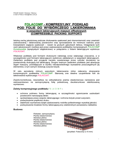 FOLEX GmbH / Kolonia / Niemcy e-mail w Polsce: [email protected] FOLACOMP - KOMPRESYJNY PODK AD POD FOLIE DO WYBIÓRCZEGO LAKIEROWANI A w zespo ach lakieruj cych masz yn offsetow ych [COMPRESSIBLE PACKING SUPPORT] Istotn cech jako ciow podczas drukowania opakowa jest równomierno oraz zwarto zadrukowanej i lakierowanej powierzchni oraz sprowadzenie do minimum nadruku poza kraw dziami zagi cia opakowa – nawet na grubych gatunkach tektury. Osi gni cie tych cech jako ciowych mo liwe jest przez zastosowanie podk adów kompresyjnych FOLACOMP Kompressible (spr ystych obj to ciowo) w po czeniu z foliami lakieruj cymi wybiórczo FOLACOAT. ciwe podk ady pod formami drukowymi nabieraj coraz wi kszego znaczenia, a w szczególno ci pod formami lakieruj cymi wybiórczo zak adanym w zespo ach lakieruj cych. Zadaniem podk adu jest przyj cie nacisku wywieranego przez cylinder dociskowy na powierzchni drukuj lub lakieruj . Drugim wa nym zadaniem podk adu jest absorpcja drga maszyny, powstaj cych w wyniku nieodpowiedniego wywa enia poszczególnych jej elementów, a tym samym redukcj zu ycia ysk. W celu sprostania ró nym warunkom lakierowania inline zalecamy stosowanie kompresyjnych podk adów FOLACOMP. Stanowi one idealne uzupe nienie folii do lakierowania wybiórczego FOLACOAT. Zwarto-komórkowa, niewra liwa na odkszta cenia pianka elastomerowa naniesiona jest wielowarstwowo na samoprzylepn foli poliestrow , dwukierunkowo stabilizowan wymiarowo. Zalety kompresyjnego podk adu FOLACOMP: ochrona polimeru formy lakieruj cej, w szczególno ci ograniczenie uszkodze powierzchni nanosz cej lakier; spokojniejsza praca zespo u lakieruj cego i ochrona ysk przed zu yciem; podwy szenie pr dko ci druku; stabilno wymiarowa dzi ki zastosowaniu no nika poliestrowego wysokiej jako ci; podwy szenie trwa ci formy lakieruj cej przy wielokrotnym ponawianiu nak adów. Budowa: Poliester, samoprzylepny Pianka elastomerowa Warstwa p ótna Pianka elastomerowa Warstwa p ótna Pianka elastomerowa Warstwa p ótna (przyk ad: Folacomp 2,15 mm) 1 Kompresyjna folia podk adowa FOLACOMP dost pna jest w grubo ciach 1,45 mm i 2,15 mm, co pozwala na zró nicowanie wysoko ci nak adania formy lakieruj cej oraz w ciwo ci umi cych. Podczas prób osi gni to nawet dwunastomiesi czne okresy pracy w maszynie bez istotnych zmian materia u. Zaleca si jednak wymian podk adów FOLACOMP co 6 miesi cy. Nanoszenie podk adu na cylinder lakieruj cy: W celu zapewnienia pewnego umocowania folii FOLACOMP we wszystkich powszechnie stosowanych typach maszyn drukarskich, folia zosta a wyposa ona w warstw samoprzylepn . Zapewnienie odpowiedniej przyczepno ci wymaga, aby cylinder by ca kowicie oczyszczony z zabrudze i t ustych osadów. Foli podk adow nakleja si na cylinder, w zale no ci od typu maszyny, od pocz tku lub od ko ca druku. W tym celu nale y najpierw zdj pas folii os aniaj cej klej na szeroko ci oko o 30 cm. Nast pnie FOLACOMP nale y przy równolegle do kraw dzi, wyrówna po bokach, przycisn i wyg adzi . ci gaj c sukcesywnie os on foliowa, nanosi si reszt podk adu na cylinder. Pod zdj ciu folii ochronnej nie wolno dopu ci uszczem lub kurzem. Uwaga dodatkowa: W ka dym przypadku u ycia folii nale y si obs ugi maszyny drukarskiej. do zabrudzenia pow oki klejowej bezwzgl dnie stosowa do instrukcji Produkt: kompresyjna folia podk adowa FOLACOMP Kompressible (ContiAir included) Konfekcjonowanie: Arkusze (max. szer. 1270 mm lub w wersji XXL w szerok. wy cznie ponad 1260 mm) Zawarto niniejszej informacji jest wynikiem prac badawczo-rozwojowych popartych zebranymi do wiadczeniami i praktyk stosowania. Wszystkie dane i wskazówki podawane s wed ug naszej najlepszej wiedzy. Nie stanowi one jednak zapewnienia w ciwo ci i nie zwalniaj u ytkownika z obowi zku przeprowadzenia testów we asnym zakresie, równie je li chodzi o prawa ochrony osób trzecich. Odpowiedzialno w zwi zku z roszczeniami odszkodowawczymi w zwi zku z niniejszymi wskazówkami jest wykluczona, niezale nie od umotywowania prawnego. Zastrzegamy sobie prawo do zmian technicznych w ramach rozwoju produktu. Stan 04/03 wersja 2.0 Unnauer Weg 6c 50767 Kolonia / Niemcy tel. 0-0-49 221 / 97 94 79 - 0 fax. 0-0-49 (0) 221 / 97 94 79-0 e-mail [email protected] http:// www.folex.de FOLEX Coating FOLEX GmbH 2