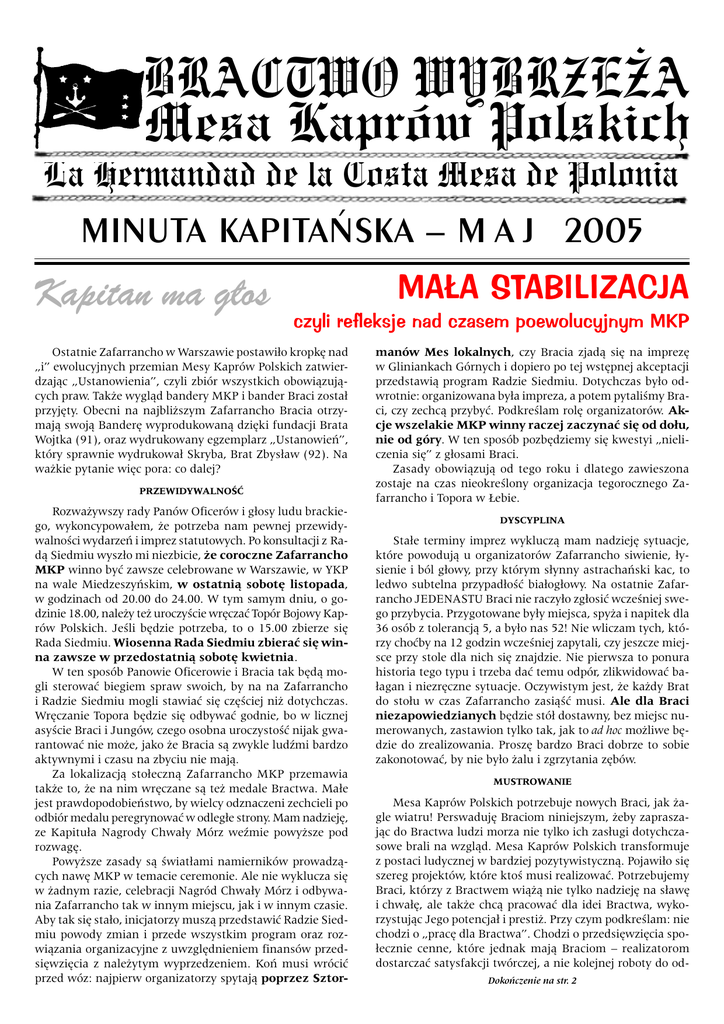 MESA KAPRÓW POLSKICH MAJ 2005 1 BRACTWO WYBRZE¯A Mesa Kaprów Polskich La Hermandad de la Costa Mesa de Polonia MINUTA KAPITAÑSKA M A J 2005 Kapitan ma g³os MA£A STABILIZACJA czyli refleksje nad czasem poewolucyjnym MKP Ostatnie Zafarrancho w Warszawie postawi³o kropkê nad i ewolucyjnych przemian Mesy Kaprów Polskich zatwierdzaj¹c Ustanowienia, czyli zbiór wszystkich obowi¹zuj¹cych praw. Tak¿e wygl¹d bandery MKP i bander Braci zosta³ przyjêty. Obecni na najbli¿szym Zafarrancho Bracia otrzymaj¹ swoj¹ Banderê wyprodukowan¹ dziêki fundacji Brata Wojtka (91), oraz wydrukowany egzemplarz Ustanowieñ, który sprawnie wydrukowa³ Skryba, Brat Zbys³aw (92). Na wa¿kie pytanie wiêc pora: co dalej? PRZEWIDYWALNOÆ Rozwa¿ywszy rady Panów Oficerów i g³osy ludu brackiego, wykoncypowa³em, ¿e potrzeba nam pewnej przewidywalnoci wydarzeñ i imprez statutowych. Po konsultacji z Rad¹ Siedmiu wysz³o mi niezbicie, ¿e coroczne Zafarrancho MKP winno byæ zawsze celebrowane w Warszawie, w YKP na wale Miedzeszyñskim, w ostatni¹ sobotê listopada, w godzinach od 20.00 do 24.00. W tym samym dniu, o godzinie 18.00, nale¿y te¿ uroczycie wrêczaæ Topór Bojowy Kaprów Polskich. Jeli bêdzie potrzeba, to o 15.00 zbierze siê Rada Siedmiu. Wiosenna Rada Siedmiu zbieraæ siê winna zawsze w przedostatni¹ sobotê kwietnia. W ten sposób Panowie Oficerowie i Bracia tak bêd¹ mogli sterowaæ biegiem spraw swoich, by na na Zafarrancho i Radzie Siedmiu mogli stawiaæ siê czêciej ni¿ dotychczas. Wrêczanie Topora bêdzie siê odbywaæ godnie, bo w licznej asycie Braci i Jungów, czego osobna uroczystoæ nijak gwarantowaæ nie mo¿e, jako ¿e Bracia s¹ zwykle ludmi bardzo aktywnymi i czasu na zbyciu nie maj¹. Za lokalizacj¹ sto³eczn¹ Zafarrancho MKP przemawia tak¿e to, ¿e na nim wrêczane s¹ te¿ medale Bractwa. Ma³e jest prawdopodobieñstwo, by wielcy odznaczeni zechcieli po odbiór medalu peregrynowaæ w odleg³e strony. Mam nadziejê, ze Kapitu³a Nagrody Chwa³y Mórz wemie powy¿sze pod rozwagê. Powy¿sze zasady s¹ wiat³ami namierników prowadz¹cych nawê MKP w temacie ceremonie. Ale nie wyklucza siê w ¿adnym razie, celebracji Nagród Chwa³y Mórz i odbywania Zafarrancho tak w innym miejscu, jak i w innym czasie. Aby tak siê sta³o, inicjatorzy musz¹ przedstawiæ Radzie Siedmiu powody zmian i przede wszystkim program oraz rozwi¹zania organizacyjne z uwzglêdnieniem finansów przedsiêwziêcia z nale¿ytym wyprzedzeniem. Koñ musi wróciæ przed wóz: najpierw organizatorzy spytaj¹ poprzez Sztor- manów Mes lokalnych, czy Bracia zjad¹ siê na imprezê w Gliniankach Górnych i dopiero po tej wstêpnej akceptacji przedstawi¹ program Radzie Siedmiu. Dotychczas by³o odwrotnie: organizowana by³a impreza, a potem pytalimy Braci, czy zechc¹ przybyæ. Podkrelam rolê organizatorów. Akcje wszelakie MKP winny raczej zaczynaæ siê od do³u, nie od góry. W ten sposób pozbêdziemy siê kwestyi nieliczenia siê z g³osami Braci. Zasady obowi¹zuj¹ od tego roku i dlatego zawieszona zostaje na czas nieokrelony organizacja tegorocznego Zafarrancho i Topora w £ebie. DYSCYPLINA Sta³e terminy imprez wyklucz¹ mam nadziejê sytuacje, które powoduj¹ u organizatorów Zafarrancho siwienie, ³ysienie i ból g³owy, przy którym s³ynny astrachañski kac, to ledwo subtelna przypad³oæ bia³og³owy. Na ostatnie Zafarrancho JEDENASTU Braci nie raczy³o zg³osiæ wczeniej swego przybycia. Przygotowane by³y miejsca, spy¿a i napitek dla 36 osób z tolerancj¹ 5, a by³o nas 52! Nie wliczam tych, którzy choæby na 12 godzin wczeniej zapytali, czy jeszcze miejsce przy stole dla nich siê znajdzie. Nie pierwsza to ponura historia tego typu i trzeba daæ temu odpór, zlikwidowaæ ba³agan i niezrêczne sytuacje. Oczywistym jest, ¿e ka¿dy Brat do sto³u w czas Zafarrancho zasi¹æ musi. Ale dla Braci niezapowiedzianych bêdzie stó³ dostawny, bez miejsc numerowanych, zastawion tylko tak, jak to ad hoc mo¿liwe bêdzie do zrealizowania. Proszê bardzo Braci dobrze to sobie zakonotowaæ, by nie by³o ¿alu i zgrzytania zêbów. MUSTROWANIE Mesa Kaprów Polskich potrzebuje nowych Braci, jak ¿agle wiatru! Perswadujê Braciom niniejszym, ¿eby zapraszaj¹c do Bractwa ludzi morza nie tylko ich zas³ugi dotychczasowe brali na wzgl¹d. Mesa Kaprów Polskich transformuje z postaci ludycznej w bardziej pozytywistyczn¹. Pojawi³o siê szereg projektów, które kto musi realizowaæ. Potrzebujemy Braci, którzy z Bractwem wi¹¿¹ nie tylko nadziejê na s³awê i chwa³ê, ale tak¿e chc¹ pracowaæ dla idei Bractwa, wykorzystuj¹c Jego potencja³ i presti¿. Przy czym podkrelam: nie chodzi o pracê dla Bractwa. Chodzi o przedsiêwziêcia spo³ecznie cenne, które jednak maj¹ Braciom realizatorom dostarczaæ satysfakcji twórczej, a nie kolejnej roboty do odDokoñczenie na str. 2 MESA KAPRÓW POLSKICH MAJ 2005 2 MA£A STABILIZACJA czyli refleksje nad czasem poewolucyjnym MKP Dokoñczenie ze str. 1 walenia. Tylko taka aktywnoæ organizacji jak nasza ma sens i warto dla niej wycisn¹æ nieco czasu z kalendarza zajêæ. NASZE DZIE£A Pod kierownictwem Brata Bolka (1) rozpocz¹³ dzia³alnoæ zespó³ wydawniczy Leksykonu Kaprów Polskich. Nie muszê wyjaniaæ jak wa¿ne to przedsiêwziêcie, którego cele s¹ ju¿ znane, a szczegó³y wy³o¿one Braciom zosta³y przez Redaktora Brata Bolka (1). Ja ze swej strony napominam o zdyscyplinowan¹ wspó³pracê Braci z zespo³em redakcyjnym. Bez tego ca³a para pójdzie w gwizdek i nic z tego nie bêdzie. Znalaz³ siê sponsor spoza Bractwa, który wesprze wydanie kolejnej pozycji Z³otej Serii Bractwa Wybrze¿a, ksi¹¿ki Andrzeja Bohomolca Wyprawa jachtu Dal. Redaktorem przedsiêwziêcia jest Brat Jerzy (2). Ksi¹¿ka jest praktycznie nieznana polskim ¿eglarzom. Brat Jerzy dysponuje wydaniem z 1936 r. Poszukujemy warszawskiego wydania z 1957 r. Poszukujemy te¿ innej pozycji dokumentuj¹cej raczkowanie polskiego ¿eglarstwa morskiego, ksi¹