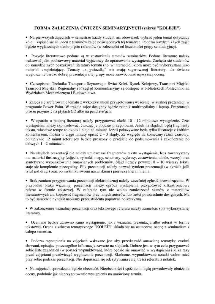FORMA ZALICZENIA ĆWICZEŃ SEMINARYJNYCH (zakres "KOLEJE") • Na pierwszych zajęciach w semestrze każdy student ma obowiązek wybrać jeden temat dotyczący kolei i zapisać się na jeden z terminów zajęć poświęconych tej tematyce. Podczas każdych z tych zajęć będzie wygłaszanych około pięciu referatów (w zależności od liczebności grupy seminaryjnej). • Pozycje literaturowe podane są w zestawieniu tematów seminariów. Podaną literaturę należy traktować jako podstawowy materiał wyjściowy do opracowania wystąpienia. Zachęca się studentów do samodzielnych poszukiwań literatury tematu (np. w internecie), która może być wykorzystana jako materiał uzupełniający. Tematy „z gwiazdką” nie mają sugerowanej literatury, ale świetne wygłoszenie bardzo dobrej prezentacji z tej grupy może zaowocować najwyższą oceną. • Czasopisma: Technika Transportu Szynowego, Świat Kolei, Rynek Kolejowy, Transport Miejski, Transport Miejski i Regionalny i Przegląd Komunikacyjny są dostępne w bibliotekach Politechniki na Wydziałach Mechanicznym i Budownictwa. • Zaleca się zreferowanie tematu z wykorzystaniem przygotowanej wcześniej wizualnej prezentacji w programie Power Point. W trakcie zajęć dostępny będzie rzutnik multimedialny i laptop. Prezentacje proszę przynosić na płytach CD albo na pendrive’ach. • W oparciu o podaną literaturę należy przygotować około 10 - 12 minutowe wystąpienie. Czas wystąpienia należy skontrolować, ćwicząc je podczas przygotowań. Jeżeli na slajdach będą fragmenty tekstu, właściwe tempo to około 1 slajd na minutę. Jeżeli pokazywane będą tylko ilustracje z krótkim komentarzem, można w ciągu minuty opisać 2 – 3 slajdy. Ze względu na konieczny reżim czasowy, po upływie 12 minut referujący będzie proszony o przejście do podsumowania i zakończenie po dalszych 1 - 2 minutach. • Na slajdach prezentacji nie należy umieszczać fragmentów tekstu wystąpienia, lecz towarzyszący mu materiał ilustracyjny (zdjęcia, rysunki, mapy, schematy, wykresy, zestawienia, tabele, wzory) oraz syntetyczne wypunktowania omawianych problemów. Slajd liczący powyżej 8 – 10 wierszy tekstu staje się kompletnie nieczytelny. Plik prezentacji należy nazwać tytułem prezentacji (w skrócie jeśli tytuł jest długi) oraz po myślniku swoim nazwiskiem i pierwszą literą imienia. • Brak zamiaru przygotowania prezentacji elektronicznej należy wcześniej zgłosić prowadzącemu. W przypadku braku wizualnej prezentacji należy oprócz wystąpienia przygotować kilkustronicowy referat w formie tekstowej. W referacie tym nie wolno zamieszczać skanów z materiałów literaturowych ani kopiować fragmentów prac innych autorów lub treści powszechnie dostępnych. Ma to być samodzielny tekst napisany przez studenta poprawną polszczyzną. • W zakończeniu wizualnej prezentacji oraz tekstowego referatu należy zamieścić spis wykorzystanej literatury. • Oceniane będzie zarówno samo wystąpienie, jak i wizualna prezentacja albo referat w formie tekstowej. Ocena z zakresu tematycznego "KOLEJE" składa się na ostateczną ocenę z seminarium z całego semestru. • Podczas wystąpienia na zajęciach wskazane jest aby przedstawić omawianą tematykę swoimi słowami, opisując poszczególne informacje zawarte na slajdach. Dobrze jest w tym celu przygotować sobie listę zagadnień (w postaci wypunktowań), które będzie się omawiać w wystąpieniu i kilka razy przed zajęciami przećwiczyć wygłaszanie prezentacji. Skrócone, wypunktowane notatki wolno mieć przy sobie podczas prezentacji. Nie dopuszcza się odczytywania całej treści referatu z notatek. • Na zajęciach sprawdzana będzie obecność. Nieobecności i spóźnienia będą powodowały obniżenie oceny, podobnie jak nieprzygotowanie wystąpienia na umówiony termin.