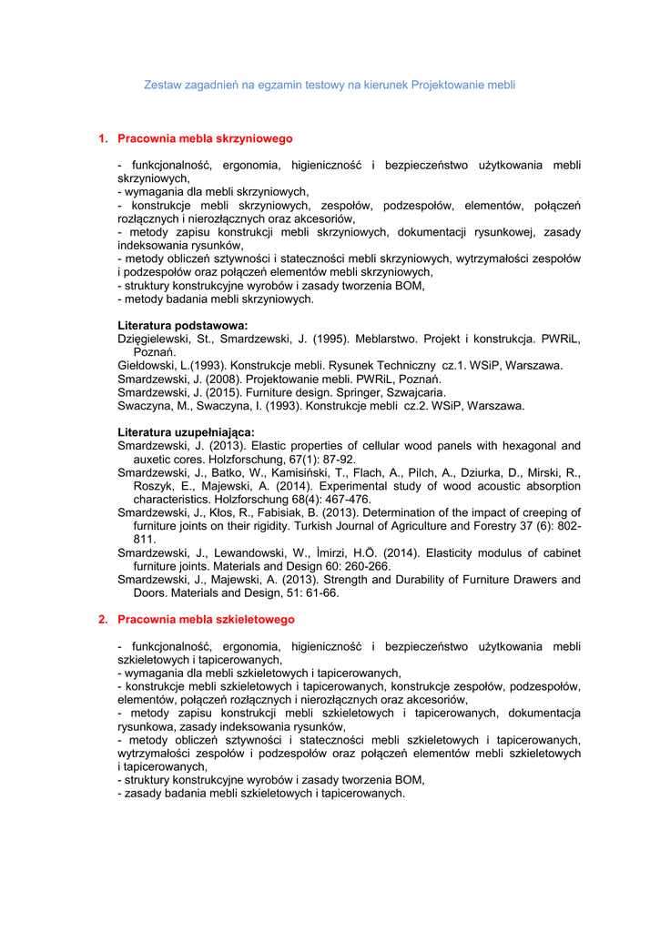 Zestaw zagadnień na egzamin testowy na kierunek Projektowanie mebli 1. Pracownia mebla skrzyniowego - funkcjonalność, ergonomia, higieniczność i bezpieczeństwo użytkowania mebli skrzyniowych, - wymagania dla mebli skrzyniowych, - konstrukcje mebli skrzyniowych, zespołów, podzespołów, elementów, połączeń rozłącznych i nierozłącznych oraz akcesoriów, - metody zapisu konstrukcji mebli skrzyniowych, dokumentacji rysunkowej, zasady indeksowania rysunków, - metody obliczeń sztywności i stateczności mebli skrzyniowych, wytrzymałości zespołów i podzespołów oraz połączeń elementów mebli skrzyniowych, - struktury konstrukcyjne wyrobów i zasady tworzenia BOM, - metody badania mebli skrzyniowych. Literatura podstawowa: Dzięgielewski, St., Smardzewski, J. (1995). Meblarstwo. Projekt i konstrukcja. PWRiL, Poznań. Giełdowski, L.(1993). Konstrukcje mebli. Rysunek Techniczny cz.1. WSiP, Warszawa. Smardzewski, J. (2008). Projektowanie mebli. PWRiL, Poznań. Smardzewski, J. (2015). Furniture design. Springer, Szwajcaria. Swaczyna, M., Swaczyna, I. (1993). Konstrukcje mebli cz.2. WSiP, Warszawa. Literatura uzupełniająca: Smardzewski, J. (2013). Elastic properties of cellular wood panels with hexagonal and auxetic cores. Holzforschung, 67(1): 87-92. Smardzewski, J., Batko, W., Kamisiński, T., Flach, A., Pilch, A., Dziurka, D., Mirski, R., Roszyk, E., Majewski, A. (2014). Experimental study of wood acoustic absorption characteristics. Holzforschung 68(4): 467-476. Smardzewski, J., Kłos, R., Fabisiak, B. (2013). Determination of the impact of creeping of furniture joints on their rigidity. Turkish Journal of Agriculture and Forestry 37 (6): 802811. Smardzewski, J., Lewandowski, W., İmirzi, H.Ö. (2014). Elasticity modulus of cabinet furniture joints. Materials and Design 60: 260-266. Smardzewski, J., Majewski, A. (2013). Strength and Durability of Furniture Drawers and Doors. Materials and Design, 51: 61-66. 2. Pracownia mebla szkieletowego - funkcjonalność, ergonomia, higieniczność i bezpieczeństwo użytkowania mebli szkieletowych i tapicerowanych, - wymagania dla mebli szkieletowych i tapicerowanych, - konstrukcje mebli szkieletowych i tapicerowanych, konstrukcje zespołów, podzespołów, elementów, połączeń rozłącznych i nierozłącznych oraz akcesoriów, - metody zapisu konstrukcji mebli szkieletowych i tapicerowanych, dokumentacja rysunkowa, zasady indeksowania rysunków, - metody obliczeń sztywności i stateczności mebli szkieletowych i tapicerowanych, wytrzymałości zespołów i podzespołów oraz połączeń elementów mebli szkieletowych i tapicerowanych, - struktury konstrukcyjne wyrobów i zasady tworzenia BOM, - zasady badania mebli szkieletowych i tapicerowanych. Literatura podstawowa: Dzięgielewski, St., Smardzewski, J. (1995). Meblarstwo. Projekt i konstrukcja. PWRiL, Poznań. Giełdowski, L.(1993). Konstrukcje mebli. Rysunek Techniczny cz.1. WSiP, Warszawa. Smardzewski, J. (2008). Projektowanie mebli. PWRiL, Poznan. Smardzewski, J. (2015). Furniture design. Springer, Szwajcaria. Swaczyna, M., Swaczyna, I. (1993). Konstrukcje mebli cz.2. WSiP, Warszawa. Literatura uzupełniająca: Smardzewski, J., Matwiej, Ł. (2013). Effects of Aging of Polyurethane Foams in the Context of Furniture Design. Drvna Industrija, 64 (3): 201-209. Smardzewski, J. (2013). New construction of mattress springs. Materials and Design, 49: 318-322. Smardzewski, J. (2013). Models of Hybrid Springs for Ergonomic Seats and Mattresses. Drvna Industrija, 64 (1): 9-18. Smardzewski, J. (2013). Auxetic springs for seating. Turk J Agric For 37: 369-376. 3. Nauka o drewnie - anatomia drewna iglastego i liściastego (pierścieniowo i rozpierzchłonaczyniowe), - podstawowe cechy budowy drewna egzotycznego, - podstawowe właściwości fizyczne i mechaniczne drewna (parametry przyrostów rocznych, gęstość drewna, odkształcenia wilgotnościowe, wytrzymałość na ściskanie, rozciąganie, zginanie, ścinanie, twardość i udarność drewna - wpływ różnych czynników na kształtowanie się tych parametrów). Literatura: Jankowska A., Kozakiewicz P., Szczęsna M. (2012). Drewno egzotyczne – Rozpoznawanie, właściwości, zastosowanie. Wyd. SGGW Warszawa. Kokociński W. (2002). Anatomia drewna. Prodruk, Poznań. Kokociński W. (2004). Drewno – Pomiary właściwości fizycznych i mechanicznych, Prodruk, Poznań. Kollmann, F., Cȏté, W.A. (1984). Principles of wood science and technology. Vol. I. Solid wood. Springer-Verlag, Berlin etc. Krzysik, F. (1978). Nauka o drewnie. PWN, Warszawa. Kubiak, M., Laurow, Z. (1994). Surowiec drzewny. Fundacja „Rozwój SGGW”, Warszawa. 4. Tworzywa drzewne - technologia tworzyw drzewnych na bazie włókien, - technologia tworzyw drzewnych na bazie wiórów, - technologia tworzyw drzewnych na bazie fornirów. Literatura: Drouet T. (1992). Technologia płyt wiórowych. Wyd. SGGW, Warszawa. Nicewicz D., Sala C. (2013). Technologiczne aspekty produkcji MDF. Wyd. SGGW, Warszawa. Nicewicz D., Sala C. (2014). Właściwości i zastosowanie płyt MDF. Wyd. SGGW, Warszawa. 5. Klejenie i uszlachetnianie drewna - składniki klejów, - kleje polioctanowinylowe i topliwe, - wyroby lakierowe rozpuszczalnikowe, wodorozcieńczalne i proszkowe , - nanoszenie kleju i okleinowanie, - technika oklejania przy użyciu pras 3D. Literatura: Proszyk S. (1999). Technologia tworzyw drzewnych. cz.2. Wykończanie powierzchni. WSiP S.A. Warszawa. Zenkteler M. 1996. Kleje i klejenie drewna. Wyd. Akademii Rolniczej w Poznaniu. 6. Narzędzia i obrabiarki - narzędzia do maszynowej obróbki drewna: budowa, przygotowanie do pracy, przeznaczenie, - geometria ostrza skrawającego, - obrabiarki do drewna: budowa i przeznaczenie technologiczne. Literatura: Bajkowski J. (1997). Maszyny i urządzenia do obróbki drewna. Cz.1. WSiP, Warszawa. Bieniek S., Duchnowski K. (1999). Obrabiarki i urządzenia w stolarstwie. WSiP, Warszawa. Staniszewska A., Zakrzewski W. (2010). Obróbka