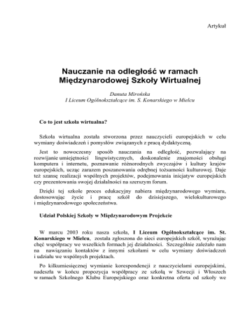 Artykuł Nauczanie na odległość w ramach Międzynarodowej Szkoły Wirtualnej Danuta Mirońska I Liceum Ogólnokształcące im. S. Konarskiego w Mielcu Co to jest szkoła wirtualna? Szkoła wirtualna została stworzona przez nauczycieli europejskich w celu wymiany doświadczeń i pomysłów związanych z pracą dydaktyczną. Jest to nowoczesny sposób nauczania na odległość, pozwalający na rozwijanie umiejętności lingwistycznych, doskonalenie znajomości obsługi komputera i internetu, poznawanie różnorodnych zwyczajów i kultury krajów europejskich, ucząc zarazem poszanowania odrębnej tożsamości kulturowej. Daje też szansę realizacji wspólnych projektów, podejmowania inicjatyw europejskich czy prezentowania swojej działalności na szerszym forum. Dzięki tej szkole proces edukacyjny nabiera międzynarodowego wymiaru, dostosowując życie i pracę szkół do dzisiejszego, wielokulturowego i międzynarodowego społeczeństwa. Udział Polskiej Szkoły w Międzynarodowym Projekcie W marcu 2003 roku nasza szkoła, I Liceum Ogólnokształcące im. St. Konarskiego w Mielcu, została zgłoszona do sieci europejskich szkół, wyrażając chęć współpracy we wszelkich formach jej działalności. Szczególnie zależało nam na nawiązaniu kontaktów z innymi szkołami w celu wymiany doświadczeń i udziału we wspólnych projektach. Po kilkumiesięcznej wymianie korespondencji z nauczycielami europejskimi, nadeszła w końcu propozycja współpracy ze szkołą w Szwecji i Włoszech w ramach Szkolnego Klubu Europejskiego oraz konkretna oferta od szkoły we Danuta Mirońska – „Nauczanie na odległość...” Francji, proponująca udział w europejskim projekcie w ramach” Międzynarodowej Szkoły Wirtualnej”. Inicjatorem pomysłu jest pan Bernard Garcin, nauczyciel ekonomii i marketingu w państwowej szkole średniej w Bourgoin- Jallieu na południowym-wschodzie Francji, pomiędzy Grenoble i Lyon. Szkoła ta, założona w 1963 roku, zatrudnia obecnie około 170 nauczycieli sprawujących opiekę dydaktyczną nad 1700 uczniami. Mają oni do dyspozycji 265 komputerów z dostępem do internetu, dzięki czemu realizacja tego projektu jest możliwa. Pan Bernard Garcin wykorzystał do tego projektu oprogramowanie opracowane przez Uniwersytet Savoie we Francji. O atrakcyjności tego modelu uczenia świadczy jego popularność wśród nauczycieli i uczniów szkół europejskich. Na początku swej działalności (wrzesień 2002) szkoła wirtualna skupiała 200 uczniów w 16 klasach, natomiast rok później (listopad 2003) już 1131 uczniów z wielu krajów, nie tylko europejskich, pracujących w 100 klasach wirtualnych pod opieką 45 nauczycieli. Kiedy nasza szkoła przystąpiła do tego programu w roku szkolnym 2003/04 realizowano jednocześnie 5 projektów międzynarodowych w kilku językach: angielskim, francuskim, włoskim, hiszpańskim i niemieckim. Ta forma nauczania zyskała też uznanie wśród państwowych instytucji edukacyjnych: PAŃSTWOWA AGENCJA SZWECJI DO SPRAW DOSKONALENIA SYSTEMU EDUKACYJNEGO PRZYZNAŁA AUTOROWI TEGO PROJEKTU TYTUŁ „NAJLEPSZEGO NAUCZYCIELA WIRTUALNEGO W ROKU 2003” ZA OPRACOWANIE I WDROŻENIE PROGRAMU EDUKACYJNEGO pt. „MIĘDZYNARODOWA SZKOŁA WIRTUALNA” KOMISJA EUROPEJSKA W BRUKSELI PRZYZNAŁA TEJ SZKOLE ”EUROPEAN LABEL” CZYLI EUROPEJSKI ZNAK JAKOŚCI W NAUCZANIU JĘZYKÓW OBCYCH W 2004 ROKU SZKOŁA TA ZDOBYŁA RÓWNIEŻ ZŁOTY MEDAL W KONKURSIE ZORGANIZOWANYM PRZEZ FRANCE TELECOM NA NAJLEPSZĄ STRONĘ INTERNETOWĄ OPRACOWANĄ DLA CELÓW EDUKACYJNYCH Ostatnio projektem zainteresowały się środowiska edukacyjne Singapuru. W marcu 2004 delegacja z tego kraju złożyła wizytę grupie koordynującej projekt CKPiDN w Mielcu – Zeszyty nauczycielskie – Nr5/2006 WKTO w ich siedzibie w Bourgoin aby zapoznać się z nowatorskimi metodami nauczania i być może wziąć udział w kolejnym projekcie w roku 2004/05. Klasa Wirtualna I LO w Mielcu Uczniowie naszej szkoły wzięli udział w roku szkolnym 2003/04 w projekcie E15 dotyczącym zagadnień z dziedziny kultury i ekonomii, realizowanym w języku angielskim przez 10 szkół z 9 krajów: Francji, Belgii, Szwecji, Danii, Włoch, Rosji, Litwy, Rumunii i Polski. Każda ze szkół miała za zadanie stworzyć klasę wirtualną składającą się z 20 lub 30 uczniów i podzielić ją na 10 grup po 2 lub 3 uczniów w każdej. Potem każda z tych grup została połączona z odpowiednią grupą z innych krajów i w ten sposób powstało 10 międzynarodowych klas wirtualnych. Na przykład grupa 41 obejmowała 2 uczniów z naszej szkoły, 2 z Zielonej Góry, 3 z Danii, 3 ze Francji, 3 z Włoch, 3 ze Szwecji, 2 Rosjan, 2 Litwinów, 2 Rumunów i 3 Belgów. O czym pisaliśmy? Największe wyzwanie stanowiły dla uczniów dwa tematy: 1) WPŁYW ROZWOJU GOSPODARCZEGO NA PRZYSZŁE POKOLENIA Raport: „Czy rozwój zrównoważony jest w stanie zaspokoić potrzeby kolejnych pokoleń?” (w aspekcie socjologicznym, ekologicznym i ekonomicznym) 2) WSPÓLNY PROJEKT – „JAK BĘDZIE WYGLĄDAŁA EUROPA W ROKU 2050?” Dodatkowo uczniowie naszej szkoły wykonali prezentację multimedialną na ten temat. Program realizowano w 12 etapach. Najbardziej pracochłonne okazały się prace w miesiącu listopadzie i lutym albowiem każdy z uczniów był zobowiązany do napisania wypracowania na powyższe tematy o objętości 200- 250 słów, przekonsultowania swoich opinii z innymi uczniami i napisania wspólnego raportu. Ponadto, uczniowie mieli okazję być “małymi ambasadorami” swojego kraju, prezentując atrakcje turystyczne swojego regionu, miasto rodzinne i osiągnięcia szkoły. Danuta Mirońska – „Nauczanie na odległość...” Oprócz konkretnych zadań wynikających z programu, uczniowie mieli też możliwość wymiany poglądów na interesujące ich tematy życia codziennego (sposobu spędzania czasu wolnego, zainteresowań, zwyczajów i tradycji w tym bożonarodzeniowych) czy podzielenia się wrażeni