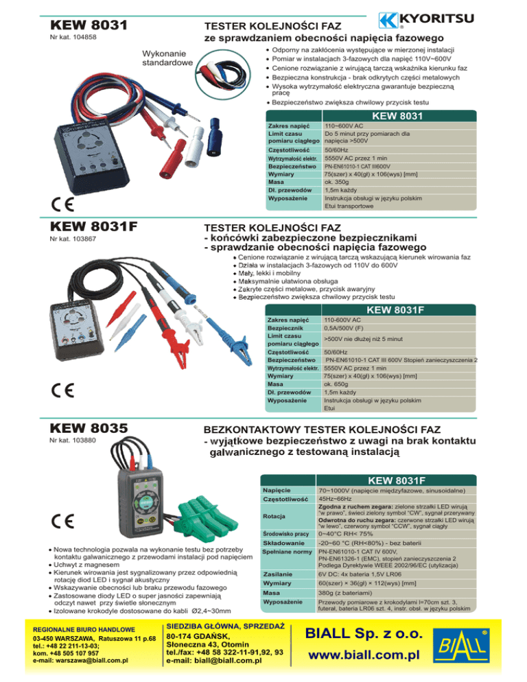 KEW 8031 TESTER KOLEJNOŚCI FAZ ze sprawdzaniem obecności napięcia fazowego Nr kat. 104858 · · · · · Wykonanie standardowe Odporny na zakłócenia występujące w mierzonej instalacji Pomiar w instalacjach 3-fazowych dla napięć 110V~600V Cenione rozwiązanie z wirującą tarczą wskaźnika kierunku faz Bezpieczna konstrukcja - brak odkrytych części metalowych Wysoka wytrzymałość elektryczna gwarantuje bezpieczną pracę · Bezpieczeństwo zwiększa chwilowy przycisk testu KEW 8031 Zakres napięć 110~600V AC Limit czasu Do 5 minut przy pomiarach dla pomiaru ciągłego napięcia >500V 50/60Hz 5550V AC przez 1 min PN-EN61010-1 CAT III600V 75(szer) x 40(gł) x 106(wys) [mm] ok. 350g 1,5m każdy Instrukcja obsługi w języku polskim Etui transportowe Częstotliwość Wytrzymałość elektr. Bezpieczeństwo Wymiary Masa Dł. przewodów Wyposażenie KEW 8031F TESTER KOLEJNOŚCI FAZ - końcówki zabezpieczone bezpiecznikami - sprawdzanie obecności napięcia fazowego Nr kat. 103867 · Cenione rozwiązanie z wirującą tarczą wskazującą kierunek wirowania faz · Działa w instalacjach 3-fazowych od 110V do 600V · Mały, lekki i mobilny · Maksymalnie ułatwiona obsługa · Zakryte części metalowe, przycisk awaryjny · Bezpieczeństwo zwiększa chwilowy przycisk testu KEW 8031F Zakres napięć Bezpiecznik Limit czasu pomiaru ciągłego Częstotliwość Bezpieczeństwo Wytrzymałość elektr. Wymiary Masa Dł. przewodów Wyposażenie KEW 8035 110-600V AC 0,5A/500V (F) >500V nie dłużej niż 5 minut 50/60Hz PN-EN61010-1 CAT III 600V Stopień zanieczyszczenia 2 5550V AC przez 1 min 75(szer) x 40(gł) x 106(wys) [mm] ok. 650g 1,5m każdy Instrukcja obsługi w języku polskim Etui BEZKONTAKTOWY TESTER KOLEJNOŚCI FAZ - wyjątkowe bezpieczeństwo z uwagi na brak kontaktu galwanicznego z testowaną instalacją Nr kat. 103880 KEW 8031F Napięcie Częstotliwość Rotacja Środowisko pracy · Nowa technologia pozwala na wykonanie testu bez potrzeby kontaktu galwanicznego z przewodami instalacji pod napięciem · Uchwyt z magnesem · Kierunek wirowania jest sygnalizowany przez odpowiednią rotację diod LED i sygnał akustyczny · Wskazywanie obecności lub braku przewodu fazowego · Zastosowane diody LED o super jasności zapewniają odczyt nawet przy świetle słonecznym · Izolowane krokodyle dostosowane do kabli Ø2,4~30mm REGIONALNE BIURO HANDLOWE 03-450 WARSZAWA, Ratuszowa 11 p.68 tel.: +48 22 211-13-03; kom. +48 505 107 957 e-mail: [email protected] . Składowanie Spełniane normy Zasilanie -20~60 °C (RH<80%) - bez baterii PN-EN61010-1 CAT IV 600V, PN-EN61326-1 (EMC), stopień zanieczyszczenia 2 Podlega Dyrektywie WEEE 2002/96/EC (utylizacja) 6V DC: 4x bateria 1,5V LR06 Wymiary 60(szer) × 36(gł) × 112(wys) [mm] Masa 380g (z bateriami) Wyposażenie Przewody pomiarowe z krokodylami l=70cm szt. 3, futerał, bateria LR06 szt. 4, instr. obsł. w języku polskim SIEDZIBA GŁÓWNA, SPRZEDAŻ 80-174 GDAŃSK, Słoneczna 43, Otomin tel./fax: +48 58 322-11-91,92, 93 e-mail: [email protected] . 70~1000V (napięcie międzyfazowe, sinusoidalne) 45Hz~66Hz Zgodna z ruchem zegara: zielone strzałki LED wirują “w prawo”, świeci zielony symbol “CW”, sygnał przerywany Odwrotna do ruchu zegara: czerwone strzałki LED wirują “w lewo”, czerwony symbol “CCW”, sygnał ciągły 0~40°C RH< 75% BIALL Sp. zOpracował o.o. S.Binder 2011-04-02 www.biall.com.pl