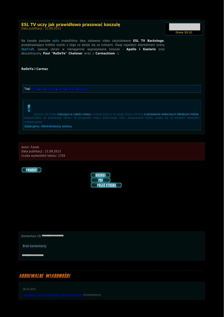 ESL TV uczy jak prawidłowo prasować koszulę Data publikacji : 21.09.2013 Ocena: 5/5 (2) Na kanale youtube esltv znaleźliśmy dwa zabawne video zatytułowane ESL TV Backstage, przedstawiające krótkie scenki z tego co dzieje się za kulisami. Dwaj najwięksi dżentelmeni sceny StarCraft, zawsze ubrani w nienagannie wyprasowane koszule - Apollo i Kaelaris oraz ekscentryczny Paul "ReDeYe" Chaloner wraz z Carmackiem :). ReDeYe i Carmac Tagi: video, ESL, Carmac, apollo, Kaelaris, RedEye Uprasza się osoby kopiujące w całości newsy z naszej witryny na swoje strony lub fora o wstawianie widocznych klikalnych linków, bezpośrednio do pobranego tekstu. W przypadku braku widocznego linku, skopiowanie tekstu uważa się za kradzież własności intelektualnej. Dziękujemy: Administratorzy serwisu. Autor: Fanek Data publikacji : 21.09.2013 Liczba wyświetleń tekstu: 1704 Komentarz (0) dodaj komentarz Brak komentarzy dodaj komentarz 08.10.2015 Kampania "Szepty o zagładzie" dostępna za darmo (0 komentarzy) 27.09.2015 Kolejni bohaterowie w trybie Sprzymierzonych Dowódców (0 komentarzy) 22.09.2015 Cyfrowe gadżety za udział w BlizzCon 2015 (0 komentarzy) 15.07.2015 Legacy of the Void dostępne w przedsprzedaży! (0 komentarzy) 17.06.2015 Informacje z E3 - prolog kampanii Legacy of the Void (0 komentarzy) 30.05.2015 WCS Europe - sobota (30 maja) 18.00 grupa G - MaNa! (0 komentarzy) 07.05.2015 DreamHack Open France 2015 - już 8 maja - MaNa! (0 komentarzy) 03.05.2015 Na wesoło: postacie E-sportu 50 (0 komentarzy) 03.05.2015 IEM Katowice 2015 - jeszcze raz! (0 komentarzy) 03.05.2015 KeSPA Cup 2015 Season 1 - live! (0 komentarzy) 26.04.2015 Proleague - Top5 gier miesiąca (0 komentarzy) 26.04.2015 CJ Entus wygrywa 2 runde Proleague! (0 komentarzy) 18.04.2015 Wersja beta Legacy of the Void – aktualizacja 2.5.1 (0 komentarzy) 18.04.2015 WCS finals 2015 - galeria (0 komentarzy) 18.04.2015 Omówienie zmian w balansie Legacy of the Void (0 komentarzy) 11.04.2015 WCS Europe kwalifikacje z Polakami - dziś (sobota) 18.00 (0 komentarzy) 11.04.2015 Aktualizacja balansu Heart of the Swarm – 9 kwietnia (0 komentarzy) 11.04.2015 GSL Season1 2015 - galeria (0 komentarzy) 11.04.2015 Zbanowane konta w StarCraft II (0 komentarzy) 04.04.2015 Red Bull Battle Grounds powraca jesienią 2015 (0 komentarzy) (zobacz wszystkie)