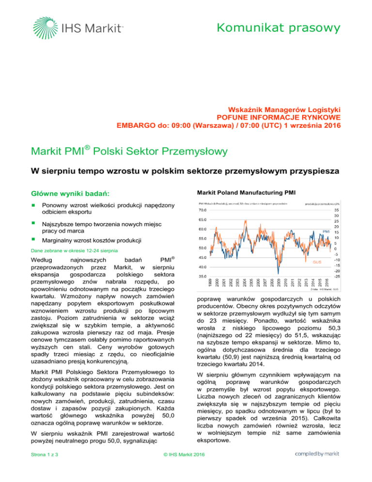 Komunikat prasowy Wskaźnik Managerów Logistyki POFUNE INFORMACJE RYNKOWE EMBARGO do: 09:00 (Warszawa) / 07:00 (UTC) 1 września 2016 Markit PMI® Polski Sektor Przemysłowy W sierpniu tempo wzrostu w polskim sektorze przemysłowym przyspiesza Główne wyniki badań: Markit Poland Manufacturing PMI Ponowny wzrost wielkości produkcji napędzony odbiciem eksportu Najszybsze tempo tworzenia nowych miejsc pracy od marca Marginalny wzrost kosztów produkcji Dane zebrane w okresie 12-24 sierpnia ® Według najnowszych badań PMI przeprowadzonych przez Markit, w sierpniu ekspansja gospodarcza polskiego sektora przemysłowego znów nabrała rozpędu, po spowolnieniu odnotowanym na początku trzeciego kwartału. Wzmożony napływ nowych zamówień napędzany popytem eksportowym poskutkował wznowieniem wzrostu produkcji po lipcowym zastoju. Poziom zatrudnienia w sektorze wciąż zwiększał się w szybkim tempie, a aktywność zakupowa wzrosła pierwszy raz od maja. Presje cenowe tymczasem osłabły pomimo raportowanych wyższych cen stali. Ceny wyrobów gotowych spadły trzeci miesiąc z rzędu, co nieoficjalnie uzasadniano presją konkurencyjną. Markit PMI Polskiego Sektora Przemysłowego to złożony wskaźnik opracowany w celu zobrazowania kondycji polskiego sektora przemysłowego. Jest on kalkulowany na podstawie pięciu subindeksów: nowych zamówień, produkcji, zatrudnienia, czasu dostaw i zapasów pozycji zakupionych. Każda wartość głównego wskaźnika powyżej 50,0 oznacza ogólną poprawę warunków w sektorze. W sierpniu wskaźnik PMI zarejestrował wartość powyżej neutralnego progu 50,0, sygnalizując Strona 1 z 3 poprawę warunków gospodarczych u polskich producentów. Obecny okres pozytywnych odczytów w sektorze przemysłowym wydłużył się tym samym do 23 miesięcy. Ponadto, wartość wskaźnika wrosła z niskiego lipcowego poziomu 50,3 (najniższego od 22 miesięcy) do 51,5, wskazując na szybsze tempo ekspansji w sektorze. Mimo to, ogólna dotychczasowa średnia dla trzeciego kwartału (50,9) jest najniższą średnią kwartalną od trzeciego kwartału 2014. W sierpniu głównym czynnikiem wpływającym na ogólną poprawę warunków gospodarczych w przemyśle był wzrost popytu eksportowego. Liczba nowych zleceń od zagranicznych klientów zwiększyła się w najszybszym tempie od pięciu miesięcy, po spadku odnotowanym w lipcu (był to pierwszy spadek od września 2015). Całkowita liczba nowych zamówień również wzrosła, lecz w wolniejszym tempie niż same zamówienia eksportowe. © IHS Markit 2016 Komunikat prasowy Sierpniowy wzmożony napływ nowych zleceń był na tyle silny, że doprowadził do ponownego zwiększenia wielkości produkcji. Tempo wzrostu wielkości produkcji umiarkowanie przyspieszyło po lipcowej stagnacji. Produkcję wspierały także prace nad zaległościami produkcyjnymi, które odnotowały dalszy spadek. Ogólną poprawę warunków gospodarczych w przemyśle odzwierciedlał także ciągły szybki wzrost poziomu zatrudnienia, który zwiększa się nieprzerwanie od trzech lat. Sierpniowe tempo tworzenia nowych miejsc pracy zarejestrowało najlepszy wynik od pięciu miesięcy. Ekspansja produkcji zmusiła polskich producentów do zwiększenia aktywności zakupowej, która wzrosła jednak tylko w marginalnym tempie. Poziom zapasów pozycji zakupionych natomiast wciąż się obniżał. Czas dostaw tymczasem ponownie nieco się wydłużył. Komentarz: Komentując wyniki badań PMI Polskiego Sektora Przemysłowego, Trevor Balchin, starszy ekonomista IHS Markit i autor raportu powiedział: „Sierpniowe odbicie wskaźnika PMI odzwierciedlało szeroko zakrojony wzrost zaobserwowany dla subindeksów: wielkości produkcji, liczby nowych zamówień oraz poziomu zatrudnienia, z eksportem jako kluczowym czynnikiem. Najnowsze dane zasugerowały, że spadek r/r oficjalnej wielkości produkcji przemysłowej zaobserwowany w lipcu, nie powtórzy się oraz zasygnalizowały pozytywną prognozą dla sektora, który w trzecim kwartale wciąż będzie wspierał wzrost PKB. W drugim kwartale wartość PKB wzrosła o 3,1% r/r za sprawą gwałtownej ekspansji sektora przemysłowego. Lipcowe prognozy IHS Markit przewidują ogólny 3,4% wzrost PKB w 2016, lecz ryzyko pogorszenia sytuacji związane z nowym podatkiem od sprzedaży detalicznej oraz niepewnością w związku z Brexitem rośnie.” W sierpniu presja inflacyjna była wciąż słaba. Średnie koszty produkcji wzrosły czwarty miesiąc z rzędu, w związku z wyższymi cenami metali i chemikaliów. Tempo inflacji zwolniło jednak po majowym 31-miesięcznym rekordzie i było nieznaczne. Ceny wyrobów gotowych natomiast spadły trzeci miesiąc z rzędu, co nieoficjalnie uzasadniano presją konkurencyjną. -Koniec- Po dalsze informacje prosimy o kontakt: IHS Markit Trevor Balchin, Senior Economist Telephone +44-1491-461-065 Email [email protected] Joanna Vickers, Corporate Communications Telephone +44207-260-2234 Email [email protected] Uwagi na temat danych: Polski Wskaźnik PMI® Sektora Przemysłowego (Wskaźnik Managerów Logistyki) opracowuje firma Markit. Raport opiera się na oryginalnych danych zebranych od reprezentatywnego panelu ponad 200 firm z polskiego sektora przemysłowego. Grupa respondentów ustalana jest w oparciu o udział branży w PKB i poziom zatrudnienia. Odpowiedzi uzyskane podczas badania odzwierciedlają ewentualne zmiany w bieżącym miesiącu w porównaniu z miesiącem poprzednim, opierając się na danych zebranych w połowie miesiąca. Dla każdego wskaźnika raport podaje procent respondentów udzielających każdą odpowiedź, różnicę netto pomiędzy ilością odpowiedzi wyższy/lepszy, a odpowiedzi niższy/gorszy oraz wskaźnik „dyfuzji”. Wskaźnik jest sumą pozytywnych odpowiedzi plus połową odpowiedzi, które są „takie same”. Wskaźniki dyfuzji mają właściwości wskaźników głównych i stanowią wygodny zbiorczy sposób określania przeważającego ki