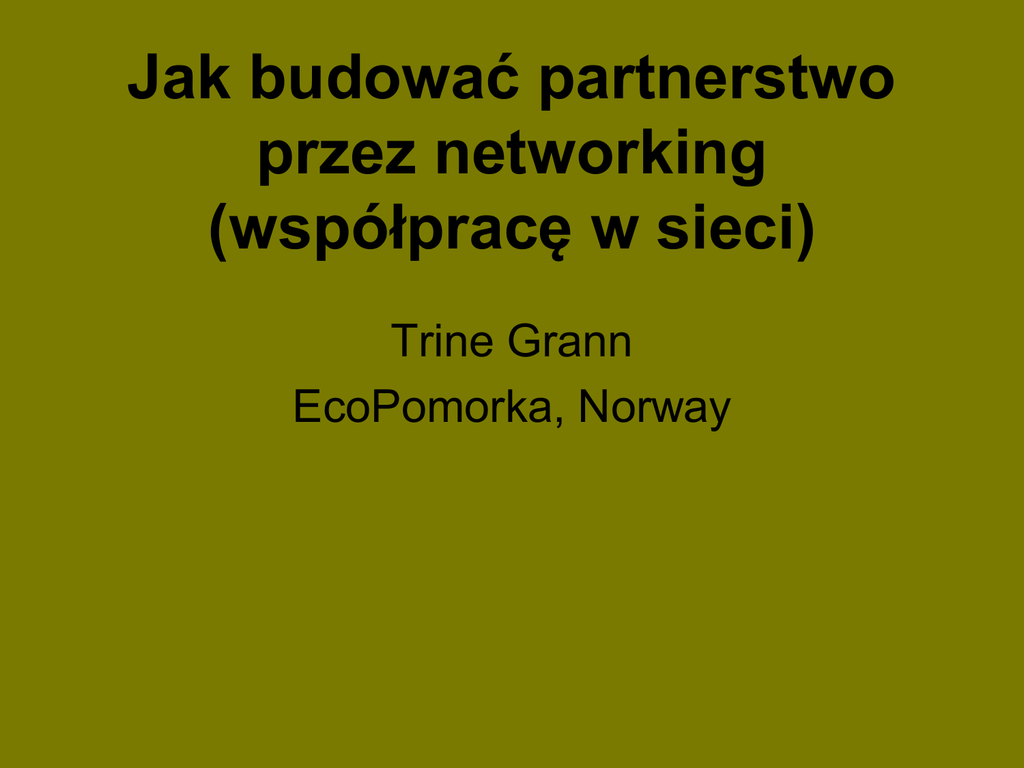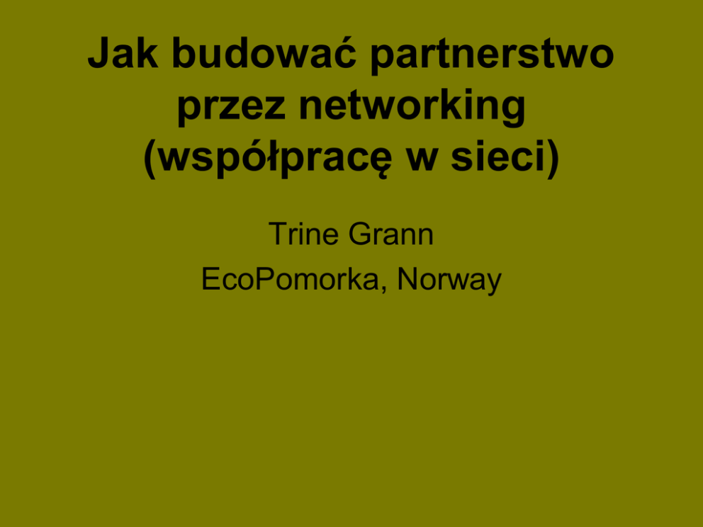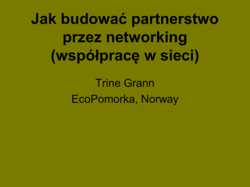 Jak budować partnerstwo przez networking (współpracę w sieci) Trine Grann EcoPomorka, Norway Plan Krótkie przypomnienie: Udane norweskie networki (sieci) The Great Life Company The Golden Route Networking w praktyce Wasza sieć i jak ją zbudować Przykład: The Golden Route • Organizacja: kooperatywa • Typ: atrakcje kulturowe, gospodarstwa rolne, różne rodzaje jakościowych usług dla turystów • Wspólne wartości – nie kryteria, każdy członek dumny z jakości produktu, marki i idei • Sprzedaż i marketing : Każdy członek sprzedaje pozostałych i idee sieci z entuzjazmem. Lokalna społeczność bierze udział. Wspólni przedstawiciele handlowi dla wszystkich. Przykład 2: The Great Life Company Organizacja: niezależni członkowie Typ: hotele i restauracje Wspólne wartości – nie kryteria: Dziedzictwo kulturowe, doświadczenia gastronomiczne, zorganizowane jakościowe zajęcia, zasady geoturystyki, dbanie o lokalną społeczność Sprzedaż i marketing: Madam Mim: The Motor In the Middleczyli nasz wewnętrzny motorek: kontaktuje się z przedsiębiorcami, firmami, agencjami podróży, jeździ na targi. Rozwija i dba o stronę www. Pani Mim opłacana jest przez członków, od niedawna na zasadzie 15% prowizji (przedtem stała pensja) Produkt: zdecydować o podstawie Wasze produkty Miejsca noclegowe, gospodarstwa, atrakcje kulturowe, producenci żywności… Wasze grupy docelowe Rodziny, młodzież, seniorzy, Polacy czy goście zagraniczni … Wynik: przegląd i opis wszystkich członków/ uczestników. Co mają do zaoferowania i jakim klientom Przykład opisu: Pokoje: 8 (5 dwójek, 3 jedynki) Wyżywienie: Styl: lokalne, domowe, tradycyjne polskie, wiejskie (zupy, schabowy…). Menu: Nie a la carte. Danie dnia. Możliwe całodzienne: śniadania, obiady, kolacje. Zajęcia: wędkowanie z przewodnikiem, sprzęt na miejscu. Wycieczki rowerowe (wynajem rowerów, organizowane trasy) Przyroda/okolica: Lasy (opisać) Rzeka (wędkowanie, kąpielisko- opisać) Unikalne na miejscu: grill z barem w ogródku, do sprzedaży suszone zioła i rzemiosło artystyczne Oczekiwania Każdy członek oczekuje x i y od sieci. Jaki jest twój cel aby wziąć udział? Jakie masz cele co do liczby gości/rozwoju biznesu itd? Wynik: jasne oczekiwania każdego członka od każdego członka i od sieci Organizacja Zdefiniować sposób zorganizowania sieci: Stowarzyszenie, spółdzielnia? Niepełen wymiar czasu? Jedna osoba czy podział obowiązków? Jak często spotkania? Formalna czy nieformalna? Wymogi dla wspólnej organizacji? Konkretne wyniki? Tylko sprzedaż i zarządzanie stroną www czy również dyżur telefoniczny (call center)? Informowanie członków? PR/ informacja do mediów? Czego potrzebujecie i kto powinien być odpowiedzialny? Co pół roku zmiana przewodniczącego/osoby odpowiedzialnej? Np. każdy członek bierze na siebie obowiązek zarządzania siecią przez pół roku. Wtedy bezkosztowo-tylko czas i wysiłek? Wynik: Opis sposobu organizacji i jak sprawić żeby członkowie wzięli odpowiedzialność za zadania do wykonania Tożsamość Nazwa, tożsamość, opis Jak “The Golden Route” (Złota Trasa) albo “The Great Life Company” (Towarzystwo Wspaniałego Życia) Profil wizualny: logo i prezentacja Wynik: Wytyczne dla grafika, żeby opracować logo i wizerunek graficzny (profil) Strona www i sprzedaż Jak i gdzie sieć może się prezentować? Jak stworzyć stronę www w oparciu o opis oferty każdego członka? Co jest potrzebne (jakie informacje, dane) żeby zacząć pracować nad stroną? Wynik: Krótki opis dla grafika/informatyka aby zaczęli opracowywać stronę Przykład: www Make your self googlish!!!!/ bądź widoczny w google! (wyszukiwarkach internetowych) Mierz, poprawiaj, rozwijaj Jak mogę zwiększyć twój dochód? Jak możesz przysporzyć mi klientów? Jak sprawić aby 1+1 = 3? Czy strona www wystarczyła? Wyniki roku pierwszego 1? Czy chcemy się rozwijać/poszerzać ofertę? Jak? Sieci które odnoszą sukcesy są dynamiczne. Nauki BNI (Biznes network international): ”Dający zyskuje” ”Pokaż gdzie jest zysk” ”Baterii nie załączono” Plan: kolejny rok i przyszłość • Plan to nic, planowanie to wszystko: • Macie organizacje wspólne kryteria i wartości • Macie cel dla siebie i cel dla networku/sieci • I co dalej??? • Co zrobić żeby się udało