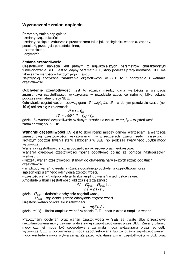 Wyznaczanie zmian napięcia Parametry zmian napięcia to : - zmiany częstotliwości, - zmiany napięcia; zaburzenia przewodzone takie jak: odchylenia, wahania, zapady, podskoki, przepięcia pozostałe i inne, - harmoniczne, - asymetria . Zmiana częstotliwości Częstotliwość napięcia jest jednym z najwaŜniejszych parametrów charakterystyki funkcjonowania SEE. Jest to jedyny parametr JEE, który podczas pracy normalnej SEE ma takie same wartości w kaŜdym jego miejscu. Najczęściej spotykane zaburzenia częstotliwości w SEE to : odchylenia i wahania częstotliwości. Odchylenie częstotliwości jest to róŜnica między daną wartością a wartością znamionową częstotliwości, wykazywana w przedziale czasu co najmniej kilku sekund podczas normalnej pracy SEE. Odchylenie częstotliwości - bezwzględne ∆f i względne ∆f* - w danym przedziale czasu (np. 10 s) oblicza się z zaleŜności: ∆f = f – fzn ∆f* = 100% (f – fzn) / fzn gdzie : f – wartość częstotliwości w danym przedziale czasu; w Hz, fzn – częstotliwość znamionowa; np. 50 Hz. Wahanie częstotliwości ∆fw jest to zbiór róŜnic między danymi wartościami a wartością znamionową częstotliwości, wykazywanych w przedziałach czasu rzędu milisekund i krótszym podczas trwania stanu zakłócenia w SEE, np. podczas awaryjnego ubytku mocy wytwórczej. Wahania częstotliwości moŜna podzielić na okresowe oraz nieokresowe. Wahania okresowe częstotliwości moŜna dodatkowo opisać za pomocą następujących wielkości : - kształtu wahań częstotliwości; stanowi go obwiednia największych róŜnic dodatnich częstotliwości, - amplitudy wahań; określa ją róŜnica dodatniego odchylenia częstotliwości oraz sąsiedniego ujemnego odchylenia częstotliwości, - częstość wahań; odpowiada jej liczba amplitud wahań w jednostce czasu. Amplitudę wahań częstotliwości oblicza się z zaleŜności δ f = ∆feks1 –∆feks2 lub δ f* = δ f / fzn gdzie : ∆feks1 – dodatnie odchylenie częstotliwości, ∆feks2 – sąsiednie ujemne odchylenie częstotliwości. Częstość wahań oblicza się z zaleŜności fv = m(δ f) / T gdzie: m(δ f) – liczba amplitud wahań w czasie T, T – czas zliczania amplitud wahań. Przyczynami odchyleń oraz wahań częstotliwości w SEE są trwałe albo przejściowe niezbilansowania mocy czynnej wytwarzanej i zapotrzebowanej przez SEE. Zmiany bilansu mocy czynnej mogą być spowodowane za małą mocą wytwarzaną przez jednostki wytwórcze SEE w porównaniu z mocą zapotrzebowaną lub za duŜym zapotrzebowaniem mocy względem mocy wytwarzanej. Za przeciwdziałanie zmian częstotliwości w SEE oraz 1 utrzymanie jej wartości znamionowej są odpowiedzialne trzy rodzaje regulacji (pierwotna, wtórna i trójna) oraz układy samoczynnego, częstotliwościowego odciąŜenia (SCO). Zmiany napięcia Są to następujące parametry zaburzenia przewodzonego nazywanego zmianami napięć: odchylenia, wahania, zapady, podskoki, przepięcia i inne. Rys. Przebiegi róŜnych zmian napięcia w czasie Odchylenia napięcia oblicza się z zaleŜności : ∆U* = 100%(U – Uzn) / Uzn * gdzie : ∆U - odchylenie napięcia; w %, U – wartość skuteczna napięcia w danym przedziale 10 minutowym; w V, Uzn – znamionowa wartość skuteczna napięcia ; w V. Rys. Przykład zmian napięć o wartościach skutecznych 10 – minutowych jako podstawy określania odchyleń napięć 2 Podstawową przyczyną odchyleń napięcia w sieciach elektroenergetycznych są niezbyt szybkie zmiany obciąŜeń elektrycznych odbiorców w czasie, powodujące zmiany spadków napięć na impedancjach elementów sieci (rys 6). I U1 R, X U1 ∆U’’ U2 P Q φ I’ U2 I’’ ∆U jXI . ∆U’ RI I Rys. Uproszczony schemat sieci elektroenergetycznej oraz wykres fazorowy napięć i spadku napięcia ZaleŜności na spadki napięć są następujące ∆U = U1 − U 2 = ∆U' = RI cos ϕ + XI sin ϕ ∆U RP + XQ = U2 U N2 Kolejna przyczyna zmian poziomów napięć (a zatem odchyleń napięć) w danym układzie elektroenergetycznym to bilans mocy biernej dostarczanej do układu (wytwarzanej) i mocy zapotrzebowanej. Przy rosnącej róŜnicy między mocą bierną zapotrzebowaną a mocy dostarczaną do układu napięcie zmniejsza się (co odpowiada większym odchyleniom napięć) i odwrotnie. Wahania napięcia Wahanie napięcia ∆Uw jest to cykliczna zmiana obwiedni amplitud napięcia lub szereg nagłych zmian napięcia w okresach sekundowych, o róŜnicach nie przekraczających 10 % względem napięcia odniesienia. Wahania napięcia moŜna podzielić na okresowe oraz nieokresowe. Amplitudę wahań napięcia oblicza się z zaleŜności δU =∆Ueks1 – ∆Ueks2 lub δ∆ U*=U / Uzn gdzie : ∆Ueks1 – dodatnie odchyłka napięcia, ∆Ueks2 – sąsiednia ujemna odchyłka napięcia. Częstość wahań napięcia oblicza się z zaleŜności Uv = m(δU) / T gdzie: m(δU) – liczba amplitud wahań napięcia w czasie T, T – czas zliczania amplitud wahań napięcia. Energetyczną dawkę wahań napięcia (dawka fickera) oblicza się z zaleŜności t +T Dv = ∫ δU *2 dt t Główny skutek cyklicznych wahań napięcia o amplitudzie nie przekraczającej ± 10 % to migotania światła (ang. flicker). Migotanie światła jest to zjawisko oscylacji strumienia świetlnego lampy lub zmiany jej widma światła w czasie, które niekorzystnie oddziaływuje na wzrok oraz psychikę człowieka. Jest to zjawisko subiektywne, zaleŜne od człowieka i jego indywidualnej reakcji na migotanie światła. Próg odczuwalności i dopuszczalna granica niekorzystnego migotania światła zaleŜą od amplitudy i częstości wahań napięcia oraz rodzaju źródła światła. W normalizacji 3 międzynarodowej przyjęto za podstawowe źródło światła Ŝarówkę o mocy 60 W, 230 V. Przykładowy przebieg napięcia powodujący migotanie światła przedstawiono na rys. Dokuczliwe są wahania o fv = 8 – 10 Hz. Wahania napięcia o modulacji 8 