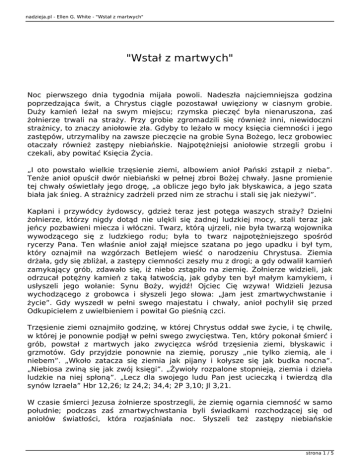 nadzieja.pl - Ellen G. White - "Wstał z martwych" "Wstał z martwych" Noc pierwszego dnia tygodnia mijała powoli. Nadeszła najciemniejsza godzina poprzedzająca świt, a Chrystus ciągle pozostawał uwięziony w ciasnym grobie. Duży kamień leżał na swym miejscu; rzymska pieczęć była nienaruszona, zaś żołnierze trwali na straży. Przy grobie zgromadzili się również inni, niewidoczni strażnicy, to znaczy aniołowie zła. Gdyby to leżało w mocy księcia ciemności i jego zastępów, utrzymaliby na zawsze pieczęcie na grobie Syna Bożego, lecz grobowiec otaczały również zastępy niebiańskie. Najpotężniejsi aniołowie strzegli grobu i czekali, aby powitać Księcia Życia. „I oto powstało wielkie trzęsienie ziemi, albowiem anioł Pański zstąpił z nieba”. Tenże anioł opuścił dwór niebiański w pełnej zbroi Bożej chwały. Jasne promienie tej chwały oświetlały jego drogę, „a oblicze jego było jak błyskawica, a jego szata biała jak śnieg. A strażnicy zadrżeli przed nim ze strachu i stali się jak nieżywi”. Kapłani i przywódcy żydowscy, gdzież teraz jest potęga waszych straży? Dzielni żołnierze, którzy nigdy dotąd nie ulękli się żadnej ludzkiej mocy, stali teraz jak jeńcy pozbawieni miecza i włóczni. Twarz, którą ujrzeli, nie była twarzą wojownika wywodzącego się z ludzkiego rodu; była to twarz najpotężniejszego spośród rycerzy Pana. Ten właśnie anioł zajął miejsce szatana po jego upadku i był tym, który oznajmił na wzgórzach Betlejem wieść o narodzeniu Chrystusa. Ziemia drżała, gdy się zbliżał, a zastępy ciemności zeszły mu z drogi; a gdy odwalił kamień zamykający grób, zdawało się, iż niebo zstąpiło na ziemię. Żołnierze widzieli, jak odrzucał potężny kamień z taką łatwością, jak gdyby ten był małym kamykiem, i usłyszeli jego wołanie: Synu Boży, wyjdź! Ojciec Cię wzywa! Widzieli Jezusa wychodzącego z grobowca i słyszeli Jego słowa: „Jam jest zmartwychwstanie i życie”. Gdy wyszedł w pełni swego majestatu i chwały, anioł pochylił się przed Odkupicielem z uwielbieniem i powitał Go pieśnią czci. Trzęsienie ziemi oznajmiło godzinę, w której Chrystus oddał swe życie, i tę chwilę, w której je ponownie podjął w pełni swego zwycięstwa. Ten, który pokonał śmierć i grób, powstał z martwych jako zwycięzca wśród trzęsienia ziemi, błyskawic i grzmotów. Gdy przyjdzie ponownie na ziemię, poruszy „nie tylko ziemią, ale i niebem”. „Wkoło zatacza się ziemia jak pijany i kołysze się jak budka nocna”. „Niebiosa zwiną się jak zwój księgi”. „Żywioły rozpalone stopnieją, ziemia i dzieła ludzkie na niej spłoną”. „Lecz dla swojego ludu Pan jest ucieczką i twierdzą dla synów Izraela” Hbr 12,26; Iz 24,2; 34,4; 2P 3,10; Jl 3,21. W czasie śmierci Jezusa żołnierze spostrzegli, że ziemię ogarnia ciemność w samo południe; podczas zaś zmartwychwstania byli świadkami rozchodzącej się od aniołów światłości, która rozjaśniała noc. Słyszeli też zastępy niebiańskie strona 1 / 5 nadzieja.pl - Ellen G. White - "Wstał z martwych" śpiewające z wielką radością: Ty zwyciężyłeś szatana i moce ciemności. Ty zwycięsko pokonałeś śmierć! Chrystus wyszedł z grobu w pełni chwały, a żołnierze rzymscy byli tego świadkami. Oczy ich były utkwione w twarzy Tego, którego jeszcze tak niedawno wyśmiewali i poniewierali. W tej przepełnionej chwałą Istocie poznali więźnia, którego widzieli na sali sądowej i któremu upletli koronę z cierni. Był to Ten, który stał nieustraszony przed Piłatem i Herodem, z ciałem okaleczonym przez biczowanie. Był to Ten, którego przybito gwoździami do krzyża, o którym pewni siebie kapłani i przywódcy kiwając głowami mówili: „Innych ratował, a siebie samego ratować nie może” Mt 27,42. Był to Ten, który został złożony w nowym grobowcu Józefa i który na mocy dekretu nieba został uwolniony. Nawet gdyby nad Jego grobem spiętrzono góry, to i tak Jego wyjściu nie mógłby nikt zapobiec. Rzymskich żołnierzy ogarnął strach i odrętwienie na widok aniołów i Zbawiciela otoczonego chwałą. Gdy niebieski pochód zniknął im z oczu, zerwali się z ziemi i tak szybko, jak na to pozwalały ich drżące nogi, pobiegli do miasta, opowiadając napotkanym po drodze o nadzwyczajnym wydarzeniu. Kierowali się do Piłata, lecz wiadomość, którą nieśli, doszła już do uszu żydowskich władz i najwyższych kapłanów. Ci natychmiast zażądali, aby uciekinierzy najpierw stawili się u nich. Dziwny widok przedstawiali żołnierze, którzy drżąc ze strachu i z pobladłymi twarzami składali swe świadectwo o zmartwychwstaniu Chrystusa. Opowiedzieli wszystko, co widzieli, ponieważ nie starczyło czasu na przygotowanie ich doświadczenia wbrew prawdzie. Z bolesnym przekonaniem żołnierze ci mówili: To był naprawdę Syn Boży, który został ukrzyżowany; słyszeliśmy, jak anioł obdarzał Go majestatem niebios i ogłaszał Królem chwały. Twarze kapłanów okryły się śmiertelną bladością. Najwyższy kapłan usiłował mówić, ale chociaż jego wargi poruszały się, to nie wydały żadnego głosu. Żołnierze zamierzali już opuścić salę posiedzeń, gdy zatrzymał ich głos Kajfasza, który wreszcie odzyskał mowę. Zaczekajcie — rzekł — nie opowiadajcie nikomu o tym, co widzieliście. Podano im fałszywą wersję wydarzeń. Mówcie — pouczali kapłani — że gdy spaliście w nocy, przyszli uczniowie Jego i ukradli Go”. Tym razem kapłani prześcignęli samych siebie. Skąd żołnierze mogli wiedzieć, że ciało ukradli uczniowie, skoro wówczas spali? A jeżeli rzeczywiście uczniowie zabrali ciało Chrystusa, to czyż kapłani nie byliby pierwszymi, którzy przygotowaliby oskarżenie? Poza tym, gdyby żołnierzom udowodniono, iż spali podczas pełnienia służby, czyżby kapłani nie omieszkali donieść o tym Pił