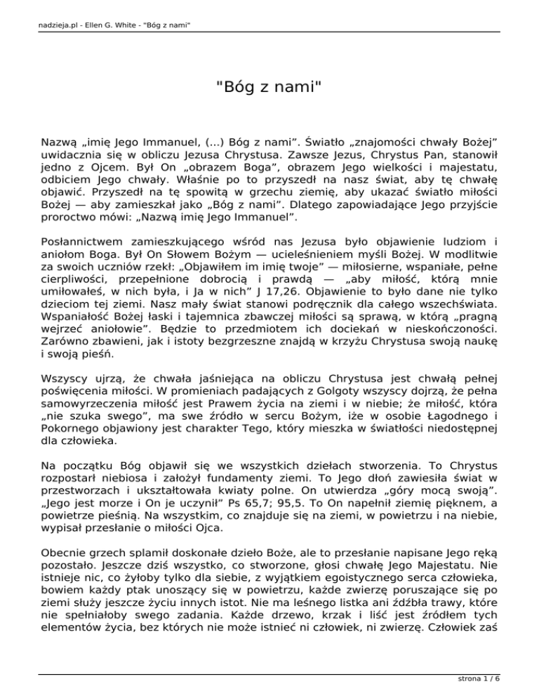 nadzieja.pl - Ellen G. White - "Bóg z nami" "Bóg z nami" Nazwą „imię Jego Immanuel, (...) Bóg z nami”. Światło „znajomości chwały Bożej” uwidacznia się w obliczu Jezusa Chrystusa. Zawsze Jezus, Chrystus Pan, stanowił jedno z Ojcem. Był On „obrazem Boga”, obrazem Jego wielkości i majestatu, odbiciem Jego chwały. Właśnie po to przyszedł na nasz świat, aby tę chwałę objawić. Przyszedł na tę spowitą w grzechu ziemię, aby ukazać światło miłości Bożej — aby zamieszkał jako „Bóg z nami”. Dlatego zapowiadające Jego przyjście proroctwo mówi: „Nazwą imię Jego Immanuel”. Posłannictwem zamieszkującego wśród nas Jezusa było objawienie ludziom i aniołom Boga. Był On Słowem Bożym — ucieleśnieniem myśli Bożej. W modlitwie za swoich uczniów rzekł: „Objawiłem im imię twoje” — miłosierne, wspaniałe, pełne cierpliwości, przepełnione dobrocią i prawdą — „aby miłość, którą mnie umiłowałeś, w nich była, i Ja w nich” J 17,26. Objawienie to było dane nie tylko dzieciom tej ziemi. Nasz mały świat stanowi podręcznik dla całego wszechświata. Wspaniałość Bożej łaski i tajemnica zbawczej miłości są sprawą, w którą „pragną wejrzeć aniołowie”. Będzie to przedmiotem ich dociekań w nieskończoności. Zarówno zbawieni, jak i istoty bezgrzeszne znajdą w krzyżu Chrystusa swoją naukę i swoją pieśń. Wszyscy ujrzą, że chwała jaśniejąca na obliczu Chrystusa jest chwałą pełnej poświęcenia miłości. W promieniach padających z Golgoty wszyscy dojrzą, że pełna samowyrzeczenia miłość jest Prawem życia na ziemi i w niebie; że miłość, która „nie szuka swego”, ma swe źródło w sercu Bożym, iże w osobie Łagodnego i Pokornego objawiony jest charakter Tego, który mieszka w światłości niedostępnej dla człowieka. Na początku Bóg objawił się we wszystkich dziełach stworzenia. To Chrystus rozpostarł niebiosa i założył fundamenty ziemi. To Jego dłoń zawiesiła świat w przestworzach i ukształtowała kwiaty polne. On utwierdza „góry mocą swoją”. „Jego jest morze i On je uczynił” Ps 65,7; 95,5. To On napełnił ziemię pięknem, a powietrze pieśnią. Na wszystkim, co znajduje się na ziemi, w powietrzu i na niebie, wypisał przesłanie o miłości Ojca. Obecnie grzech splamił doskonałe dzieło Boże, ale to przesłanie napisane Jego ręką pozostało. Jeszcze dziś wszystko, co stworzone, głosi chwałę Jego Majestatu. Nie istnieje nic, co żyłoby tylko dla siebie, z wyjątkiem egoistycznego serca człowieka, bowiem każdy ptak unoszący się w powietrzu, każde zwierzę poruszające się po ziemi służy jeszcze życiu innych istot. Nie ma leśnego listka ani źdźbła trawy, które nie spełniałoby swego zadania. Każde drzewo, krzak i liść jest źródłem tych elementów życia, bez których nie może istnieć ni człowiek, ni zwierzę. Człowiek zaś strona 1 / 6 nadzieja.pl - Ellen G. White - "Bóg z nami" i zwierzę z kolei przyczyniają się dożycia drzewa, krzewu i liścia. Kwiaty wydają woń i rozpościerają swe piękno ku błogosławieństwu świata. Słońce rozprzestrzenia swe światło ku radości rozlicznych światów. Ocean — źródło wszystkich naszych źródeł, wchłania strumienie z każdego lądu — bierze, by dawać. Mgły wyłaniające się z jego głębi spadają jako deszcze na ziemię, by mogła wydawać plon. Aniołowie chwały znajdują radość wdawaniu — obdarzają miłością i niekończącą się troską upadłe i pokalane dusze. Niebiańskie istoty zabiegają o serca ludzkie; na ten ciemny świat przynoszą światło. Poprzez łagodne i pełne cierpliwości usługiwanie wpływają na ducha ludzkiego, by przyprowadzić zagubionych do społeczności z Chrystusem, który znajduje się bliżej, niż sobie z tego zdajemy sprawę. Pominąwszy wszystkie inne źródła objawienia, dostrzegamy w Jezusie Boga. Patrząc na Jezusa widzimy, że obdarowywanie jest chwałą naszego Boga. „Nic nie czynię sam z siebie” — mówi Jezus. „Jak mię posłał Ojciec, który żyje, aja przez Ojca żyję” J 8,28; 6,57. Mówił, że szuka nie chwały swojej, ale Chwały Tego, który Go posłał J 7,18. Słowa te zawierają wielką zasadę, będącą podwaliną życia wszechświata. Chrystus wszystko otrzymał od Boga, ale wziął, aby dawać. Niebiański nadzór nad wszelkim stworzeniem wypełnia się przez umiłowanego Syna, przekazującego wszystkiemu pochodzące od Boga życie; poprzez Syna to życie powraca w pochwalnej i radosnej służbie, w postaci wielkiej fali miłości do Źródła wszechrzeczy. I tak dzięki Chrystusowi krąg błogosławieństwa zamyka się, obrazując charakter wielkiego Dawcy, prawo życia. Prawo to zostało złamane w samych niebiosach. Grzech zrodził się z egoizmu. Lucyfer, cherub nadzorujący, pragnął być w niebie pierwszym. Dążył on do opanowania istot niebiańskich, do odprowadzenia ich od Stworzyciela i pozyskania dla siebie ich hołdu. Dlatego przedstawił Boga w niewłaściwym świetle przypisując Mu pragnienie wywyższenia samego siebie. Złe przymioty swojego charakteru pragnął przypisać kochającemu Stwórcy. Tym sposobem zwiódł aniołów, a następnie ludzi. Doprowadził ich do zwątpienia w Słowo Boże i Bożą dobroć. Szatan sprawił, że ludzie patrzą na Boga jako na surowego i nieprzejednanego władcę, bo jest On Bogiem sprawiedliwości i wielkiego majestatu. W ten sposób pozyskał ludzi dla swej rebelii przeciw Bogu, a w konsekwencji noc niedoli spowiła świat. Ziemię ogarnęła ciemność wskutek niezrozumienia Boga. Należało złamać zwodniczą moc szatana, aby rozproszyć posępne ciemności, aby świat z powrotem przyprowadzić do Boga. Nie można było dokonać tego siłą. Użycie siły jest sprzeczne z zasadami boskich rządów, oczekuje On bowiem tylko służby miłości, a miłości nie można nakazać, nie można jej też wymusić si