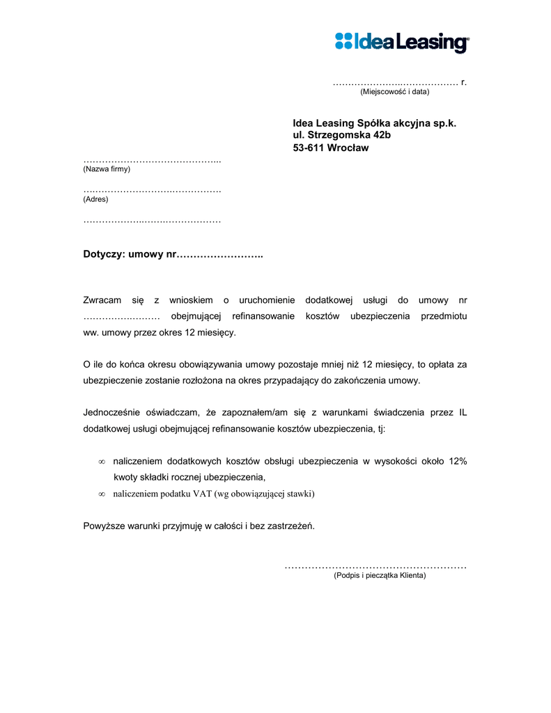 …………………..……………… r. (Miejscowość i data) Idea Leasing Spółka akcyjna sp.k. ul. Strzegomska 42b 53-611 Wrocław ……………………………………... (Nazwa firmy) ….…………………….……………. (Adres) ………………..…….……………… Dotyczy: umowy nr…………………….. Zwracam się z …………….……… wnioskiem obejmującej o uruchomienie refinansowanie dodatkowej kosztów usługi do umowy ubezpieczenia nr przedmiotu ww. umowy przez okres 12 miesięcy. O ile do końca okresu obowiązywania umowy pozostaje mniej niż 12 miesięcy, to opłata za ubezpieczenie zostanie rozłożona na okres przypadający do zakończenia umowy. Jednocześnie oświadczam, że zapoznałem/am się z warunkami świadczenia przez IL dodatkowej usługi obejmującej refinansowanie kosztów ubezpieczenia, tj: • naliczeniem dodatkowych kosztów obsługi ubezpieczenia w wysokości około 12% kwoty składki rocznej ubezpieczenia, • naliczeniem podatku VAT (wg obowiązującej stawki) Powyższe warunki przyjmuję w całości i bez zastrzeżeń. ……………………………………………… (Podpis i pieczątka Klienta)