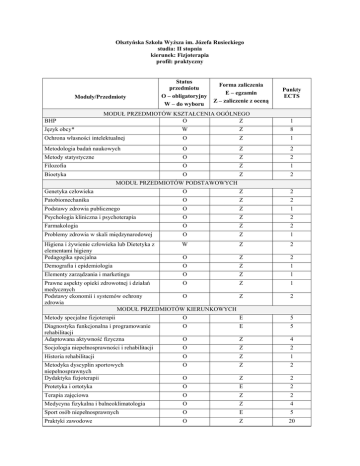 Olsztyńska Szkoła Wyższa im. Józefa Rusieckiego studia: II stopnia kierunek: Fizjoterapia profil: praktyczny Moduły/Przedmioty BHP Status przedmiotu O – obligatoryjny W – do wyboru Forma zaliczenia E – egzamin Z – zaliczenie z oceną MODUŁ PRZEDMIOTÓW KSZTAŁCENIA OGÓLNEGO O Z Punkty ECTS 1 Język obcy* W Z 8 Ochrona własności intelektualnej O Z 1 Metodologia badań naukowych O Z 2 Metody statystyczne O Z 2 Filozofia O Z 1 Bioetyka O Z 2 MODUŁ PRZEDMIOTÓW PODSTAWOWYCH Genetyka człowieka O Z 2 Patobiomechanika O Z 2 Podstawy zdrowia publicznego O Z 1 Psychologia kliniczna i psychoterapia O Z 2 Farmakologia O Z 2 Problemy zdrowia w skali międzynarodowej O Z 1 Higiena i żywienie człowieka lub Dietetyka z elementami higieny Pedagogika specjalna W Z 2 O Z 2 Demografia i epidemiologia O Z 1 Elementy zarządzania i marketingu O Z 1 Prawne aspekty opieki zdrowotnej i działań O Z medycznych Podstawy ekonomii i systemów ochrony O Z zdrowia MODUŁ PRZEDMIOTÓW KIERUNKOWYCH 1 Metody specjalne fizjoterapii O E 5 Diagnostyka funkcjonalna i programowanie rehabilitacji Adaptowana aktywność fizyczna O E 5 O Z 4 Socjologia niepełnosprawności i rehabilitacji O Z 2 Historia rehabilitacji O Z 1 Metodyka dyscyplin sportowych niepełnosprawnych Dydaktyka fizjoterapii O Z 2 O Z 2 Protetyka i ortotyka O E 2 Terapia zajęciowa O Z 2 Medycyna fizykalna i balneoklimatologia O Z 4 Sport osób niepełnosprawnych O E 5 Praktyki zawodowe O Z 20 2 MODUŁ PRZEDMIOTÓW SPECJALNOŚCIOWYCH Neurofizjologia kliniczna lub Fizjologia starzenia się Anatomia radiologiczna lub Anatomia palpacyjna Elementy edukacji i terapii seksualnej osób niepełnosprawnych Seminarium dyplomowe W Z 2 W Z 2 O Z 2 W Z 2 Praca dyplomowa** W E 20 *Język obcy – do wyboru język angielski, niemiecki, hiszpański, francuski, rosyjski z uwzględnieniem poziomu zaawansowania. **Praca dyplomowa – moduł obejmujący przygotowanie pracy dyplomowej i egzamin dyplomowy (obronę pracy).