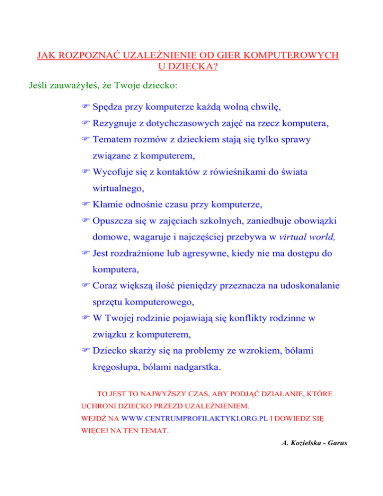 JAK ROZPOZNAĆ UZALEŻNIENIE OD GIER KOMPUTEROWYCH U DZIECKA? Jeśli zauważyłeś, że Twoje dziecko: Spędza przy komputerze każdą wolną chwilę, Rezygnuje z dotychczasowych zajęć na rzecz komputera, Tematem rozmów z dzieckiem stają się tylko sprawy związane z komputerem, Wycofuje się z kontaktów z rówieśnikami do świata wirtualnego, Kłamie odnośnie czasu przy komputerze, Opuszcza się w zajęciach szkolnych, zaniedbuje obowiązki domowe, wagaruje i najczęściej przebywa w virtual world, Jest rozdrażnione lub agresywne, kiedy nie ma dostępu do komputera, Coraz większą ilość pieniędzy przeznacza na udoskonalanie sprzętu komputerowego, W Twojej rodzinie pojawiają się konflikty rodzinne w związku z komputerem, Dziecko skarży się na problemy ze wzrokiem, bólami kręgosłupa, bólami nadgarstka. TO JEST TO NAJWYŻSZY CZAS, ABY PODJĄĆ DZIAŁANIE, KTÓRE UCHRONI DZIECKO PRZEZD UZALEŻNIENIEM. WEJDŹ NA WWW.CENTRUMPROFILAKTYKI.ORG.PL I DOWIEDZ SIĘ WIĘCEJ NA TEN TEMAT. A. Kozielska - Garus