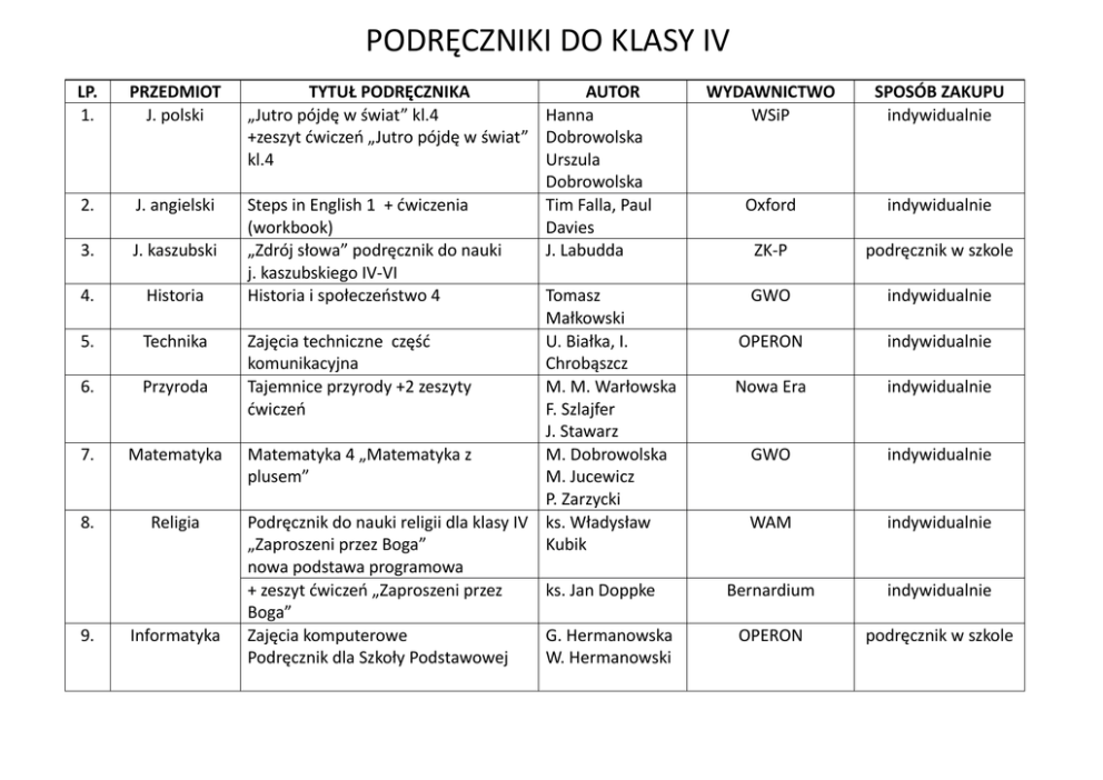 PODRĘCZNIKI DO KLASY IV LP. 1. PRZEDMIOT J. polski 2. J. angielski 3. J. kaszubski 4. Historia 5. Technika 6. Przyroda 7. Matematyka 8. Religia 9. Informatyka TYTUŁ PODRĘCZNIKA AUTOR „Jutro pójdę w świat” kl.4 Hanna +zeszyt ćwiczeń „Jutro pójdę w świat” Dobrowolska kl.4 Urszula Dobrowolska Steps in English 1 + ćwiczenia Tim Falla, Paul (workbook) Davies „Zdrój słowa” podręcznik do nauki J. Labudda j. kaszubskiego IV-VI Historia i społeczeństwo 4 Tomasz Małkowski Zajęcia techniczne część U. Białka, I. komunikacyjna Chrobąszcz Tajemnice przyrody +2 zeszyty M. M. Warłowska ćwiczeń F. Szlajfer J. Stawarz Matematyka 4 „Matematyka z M. Dobrowolska plusem” M. Jucewicz P. Zarzycki Podręcznik do nauki religii dla klasy IV ks. Władysław „Zaproszeni przez Boga” Kubik nowa podstawa programowa + zeszyt ćwiczeń „Zaproszeni przez ks. Jan Doppke Boga” Zajęcia komputerowe G. Hermanowska Podręcznik dla Szkoły Podstawowej W. Hermanowski WYDAWNICTWO WSiP SPOSÓB ZAKUPU indywidualnie Oxford indywidualnie ZK-P podręcznik w szkole GWO indywidualnie OPERON indywidualnie Nowa Era indywidualnie GWO indywidualnie WAM indywidualnie Bernardium indywidualnie OPERON podręcznik w szkole 10. Muzyka Klucz do muzyki 4 11. Plastyka Plastyka 4-6 Katarzyna JakóbczakDrążek, Urszula Smoczyńska, Agnieszka Sołtysik Stanisław Krzysztof Stopczyk, J.Chołasińska WSiP indywidualnie WSiP indywidualnie PODRĘCZNIKI DO KLASY V LP. 1. PRZEDMIOT J. polski 2. J. angielski 3. J. kaszubski 4. 5. Historia Przyroda 6. Matematyka 7. Religia 8. Muzyka 9. Plastyka TYTUŁ PODRĘCZNIKA „Jutro pójdę w świat” kl.5 +zeszyt ćwiczeń „Jutro pójdę w świat” kl.5 Steps in English 2 + ćwiczenia (workbook) „Zdrój słowa” podręcznik do nauki j. kaszubskiego IV-VI Historia i społeczeństwo 5 Tajemnice przyrody +2 zeszyty ćwiczeń AUTOR Hanna Dobrowolska Urszula Dobrowolska Tim Falla, Paul Davies J. Labudda Tomasz Małkowski J. Slosarczyk F. Szlajfer R. Kozik Matematyka 5+ M. Dobrowolska zbiór zadań 5 klasa M. Jucewicz P. Zarzycki M. Karpiński Podręcznik do nauki religii dla klasy V ks. Władysław „Obdarowani przez Boga” Kubik nowa podstawa programowa + zeszyt ćwiczeń dla klasy V ks. Jan Doppke Klucz do muzyki 5 Katarzyna Jakóbczak-Drążek, I inni Plastyka 4-6 Stanisław Krzysztof Stopczyk, Joanna Chołasińska WYDAWNICTWO WSiP SPOSÓB ZAKUPU indywidualnie Oxford indywidualnie ZK-P podręcznik w szkole GWO Nowa Era indywidualnie indywidualnie GWO indywidualnie WAM indywidualnie Bernardium WSiP indywidualnie indywidualnie WSiP indywidualnie PODRĘCZNIKI DO KLASY VI LP. 1. PRZEDMIOT J. polski 2. J. angielski 3. J. kaszubski 4. 5. Historia Przyroda 6. Matematyka 7. Religia TYTUŁ PODRĘCZNIKA „Jutro pójdę w świat” +zeszyt ćwiczeń „Jutro pójdę w świat” Steps in English 3 + ćwiczenia (workbook) „Zdrój słowa” podręcznik do nauki j. kaszubskiego IV-VI Historia i społeczeństwo Tajemnice przyrody +2 zeszyty ćwiczeń Matematyka z plusem 8. Muzyka Podręcznik do nauki religii dla klasy 6 „Przemienieni przez Boga” + zeszyt ćwiczeń „Przemienieni przez Boga” nowa podstawa programowa Klucz do muzyki 6 9. Plastyka Plastyka 4-6 AUTOR Hanna Dobrowolska Urszula Dobrowolska Tim Falla, Paul Davies J. Labuda Tomasz Małkowski F. Szlajfer A. Sfawarz M. Dobrowolska Z. Marek Katarzyna JakóbczakDrążek, Urszula Smoczyńska, Agnieszka Sołtysik Stanisław Krzysztof Stopczyk, Joanna Chołasińska WYDAWNICTWO WSiP SPOSÓB ZAKUPU indywidualnie Oxford indywidualnie ZK-P podręcznik w szkole GWO Nowa Era indywidualnie indywidualnie GWO wyd. 2014 WAM indywidualnie WAM indywidualnie WSiP indywidualnie WSiP indywidualnie indywidualnie