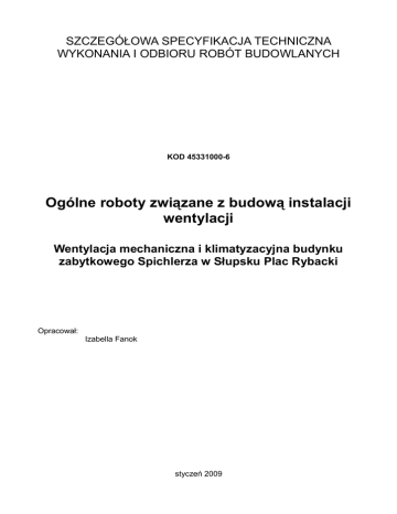 SZCZEGÓŁOWA SPECYFIKACJA TECHNICZNA WYKONANIA I ODBIORU ROBÓT BUDOWLANYCH KOD 45331000-6 Ogólne roboty związane z budową instalacji wentylacji Wentylacja mechaniczna i klimatyzacyjna budynku zabytkowego Spichlerza w Słupsku Plac Rybacki Opracował: Izabella Fanok styczeń 2009 1. WSTĘP 1.1 Przedmiot specyfikacji Przedmiotem niniejszej Szczegółowej Specyfikacji Technicznej są wymagania dotyczące wykonania i odbioru robót w zakresie instalacji wentylacji w istniejącej wentylatorowni 1.2 Zakres stosowania Specyfikacji Szczegółowa specyfikacja techniczna jest stosowana jako dokument przetargowy i kontraktowy przy zlecaniu i realizacji robót wymienionych w punkcie 1.1 1.3 Zakres robót objętych Specyfikacją Roboty, których dotyczy specyfikacja, obejmują wszystkie czynności umoŜliwiające i mające na celu częściowy demontaŜ istniejącej instalacji oraz montaŜ nowej instalacji wentylacji. 1.4 Określenia podstawowe: Określenia podane w niniejszej SST są zgodne z obowiązującymi normami oraz przepisami i oznaczają: - Specyfikacja techniczna - dokument określający cechy, które powinien posiadać wyrób lub proces wytwarzania w zakresie jakości, parametrów technicznych, bezpieczeństwa lub wymiarów, w tym w odniesieniu do nazewnictwa, symboli, badań i metodologii badań, opakowania, oznakowania i oznaczenia wyrobu. - Dokumentacja techniczna wykonawcza – zgodnie z prawem budowlanym, odrębnym przepisem (Rozporządzenie Ministra Infrastruktury z dnia 03.07.2003 w sprawie szczegółowego zakresu i formy projektu budowlanego (Dz.U.Nr 120/03 poz.1133) regulowane są jedynie zakres i zawartość dokumentacji budowlanej, niezbędnej do uzyskania pozwolenia na budowę. - roboty wentylacyjne – wszystkie prace związane z wykonanie instalacji wentylacyjnej zgodnie z ustaleniami dokumentacji projektowej. – wentylacja pomieszczenia - wymiana powietrza w pomieszczeniu lub jego części, mająca na celu usunięcie powietrza zuŜytego i zanieczyszczonego oraz wprowadzenie powietrza zewnętrznego. – Instalacja wentylacji – zestaw urządzeń, zespołów i elementów wentylacyjnych słuŜących do uzdatniania i rozprowadzania powietrza 1.5 Ogólne wymagania dotyczące robót: Wykonawca robót jest odpowiedzialny za jakość ich wykonania oraz za ich zgodność z dokumentacją projektową, SST i poleceniami Inspektora nadzoru. 2. MATERIAŁY 2.1 Ogólne wymagania dotyczące materiałów - do wykonania instalacji wentylacji mogą mogą być stosowane wyroby producentów krajowych i zagranicznych. - wszystkie materiały uŜyte do wykonania instalacji muszą posiadać aktualne polskie aprobaty techniczne lub odpowiadać Polskim Normom. Do kaŜdej partii materiałów dostarczanych na budowę producent (dostawca) dołączy deklarację zgodności materiałów ze stosowanymi Polskimi Normami lub Aprobatami Technicznymi. Wykonawca uzyska przed zastosowaniem wyrobu akceptację Inspektora nadzoru. Odbiór techniczny materiałów powinien być dokonywany według wymagań i w sposób określony aktualnymi normami. – Sposób transportu i składowania powinien być zgodny z warunkami i wymaganiami podanymi przez producenta. Wykonawca zobowiązany jest posiadać na budowie pełną dokumentację dotyczącą składowanych na budowie materiałów przeznaczonych do wykonania instalacji wentylacji. 2.2 Rodzaje materiałów: Przewody wentylacyjne - przewody wentylacyjne – blacha stalowa ocynkowana, płyty z prasowanej wełny mineralnej TOP-AIR/CLV 248 Urządzenia – centrala klimatyzacyjna nawiewno-wywiewna typ GOLEM-G-3-L-S z nawilŜaczem parowym – agregat chłodniczy PUHY-P300YHM 3. SPRZĘT I NARZĘDZIA Wykonawca jest zobowiązany do uŜywania jedynie takiego sprzętu, który nie spowoduje niekorzystnego wpływu na jakość robót, zarówno w miejscu tych robót, jak teŜ przy wykonywaniu czynności pomocniczych oraz w czasie transportu, załadunku i wyładunku materiałów. 4. TRANSPORT MATERIAŁÓW Kanały wentylacyjne i urządzenia muszą być transportowane na samochodach o odpowiedniej długości. Przewóz kształtek o osprzętu wentylacyjnego moŜe się odbywać wyłącznie samochodami skrzyniowymi. Pozostałe materiały powinny być przewoŜone dowolnymi zakrytymi środkami transportu. 5. WYKONANIE ROBÓT – – – Zapewnić dostęp do przepustnic regulacyjnych Zdemontować kanały wentylacyjne w pomieszczeniu wentylatorowni Powierzchnie przewodów wentylacyjnych powinny być gładkie, bez załamań i – – – – – – – – – – – – wgnieceń. Materiał powinien być jednorodny, bez wŜerów, wad walcowniczych itp. Wymiary przewodów o przekroju prostokątnym i kołowym powinny odpowiadać wymaganiom norm PN-EN 1505 i PN-EN 1506. Szczelność przewodów wentylacyjnych powinna odpowiadać wymaganiom normy PNB-76001. Wykonanie przewodów prostych i kształtek z blachy powinno odpowiadać wymaganiom normy PN-B-03434. Połączenia przewodów wentylacyjnych z blachy powinno odpowiadać wymaganiom normy PN-B-76002. Przewody wentylacyjne powinny być zamocowane do elementów konstrukcyjnych budynku w odległości umoŜliwiającej szczelne wykonanie połączeń poprzecznych. Zawieszenia i podparcia kanałów wykonać zgodnie z BN-67/8865-25 oraz BN-67886526. Przewody wentylacyjne o przekroju prostokątnym wykonać naleŜy z blachy stalowej ocynkowanej. Kanały mocować za pomocą systemowych uchwytów/wieszaków z wkładką antywibracyjną. Przy przejściach przewodów przez przegrody budowlane kanały omurować stosując przekładki dylatacyjne z płyt pianki poliuretanowej lub podobne. MontaŜ urządzeń dokonać zgodnie z dokumentacjami techniczno-rozruchowymi. Centralę i agregat posadowić na fundamencie ZaaranŜować czerpnie i wyrzutnie zgodnie z charakterem budynku w uzgodnieniu z konserwatorem zabytków. Badania i uruchomienie instalacji Rozruch instalacji wentylacji Całość instalacji wentylacyjnych naleŜy poddać badaniom rozruchowym i regulacji. Reg