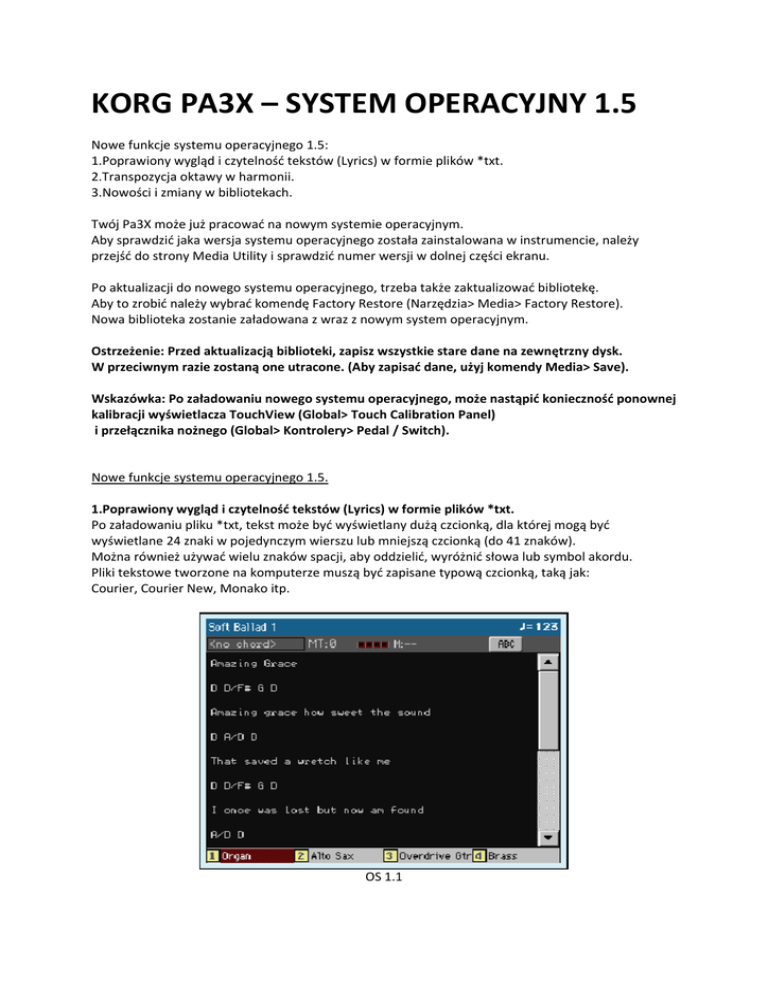 KORG PA3X – SYSTEM OPERACYJNY 1.5 Nowe funkcje systemu operacyjnego 1.5: 1.Poprawiony wygląd i czytelność tekstów (Lyrics) w formie plików *txt. 2.Transpozycja oktawy w harmonii. 3.Nowości i zmiany w bibliotekach. Twój Pa3X może już pracować na nowym systemie operacyjnym. Aby sprawdzić jaka wersja systemu operacyjnego została zainstalowana w instrumencie, należy przejść do strony Media Utility i sprawdzić numer wersji w dolnej części ekranu. Po aktualizacji do nowego systemu operacyjnego, trzeba także zaktualizować bibliotekę. Aby to zrobić należy wybrać komendę Factory Restore (Narzędzia> Media> Factory Restore). Nowa biblioteka zostanie załadowana z wraz z nowym system operacyjnym. Ostrzeżenie: Przed aktualizacją biblioteki, zapisz wszystkie stare dane na zewnętrzny dysk. W przeciwnym razie zostaną one utracone. (Aby zapisać dane, użyj komendy Media> Save). Wskazówka: Po załadowaniu nowego systemu operacyjnego, może nastąpić konieczność ponownej kalibracji wyświetlacza TouchView (Global> Touch Calibration Panel) i przełącznika nożnego (Global> Kontrolery> Pedal / Switch). Nowe funkcje systemu operacyjnego 1.5. 1.Poprawiony wygląd i czytelność tekstów (Lyrics) w formie plików *txt. Po załadowaniu pliku *txt, tekst może być wyświetlany dużą czcionką, dla której mogą być wyświetlane 24 znaki w pojedynczym wierszu lub mniejszą czcionką (do 41 znaków). Można również używać wielu znaków spacji, aby oddzielić, wyróżnić słowa lub symbol akordu. Pliki tekstowe tworzone na komputerze muszą być zapisane typową czcionką, taką jak: Courier, Courier New, Monako itp. OS 1.1 OS 1.5 2.Transpozycja oktawy w harmonii. Dostępna tylko w trybie „Notes”. Parametr „Octave Transpose” transponuje nuty grane na klawiaturze lub z pliku Standard MIDI. Aby transponować nuty otrzymane z pliku MIDI, możesz wykorzystać parametr "Octave Transpose In” znajdujący się w zakładce "MIDI: MIDI In Control”. 3.Nowości i zmiany w bibliotekach. Nowe Style, brzmienia, performance i SongBook zostały dodane do OS 1.5. Proszę sprawdzić dodatek Appendix, aby zobaczyć listę dodatków. SongBook teraz zawiera ponad 600 pozycji.