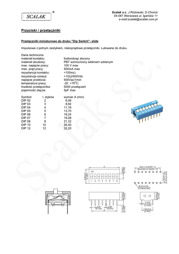 Scalak s.c. J.Różowski, D.Choroś 04-087 Warszawa ul. Igańska 11 e-mail:[email protected] Przyciski / przełączniki Przełączniki miniaturowe do druku "Dip Switch"- slide Impulsowe z jednym zestykiem, niskoprądowe przełączniki. Lutowane do druku. Dane techniczne materiał kontaktu: materiał obudowy: max. napięcie pracy: max. prąd pracy: rezystancja kontaktu: rezystancja izolacji: napięcie przebicia: temperatura pracy: trwałość przełącznika: pojemność złącza: Symbol: DIP 02 DIP 03 DIP 04 DIP 05 DIP 06 DIP 07 DIP 08 DIP 10 DIP 12 l. styków 2 3 4 5 6 7 8 10 12 fosforobrąz złocony PBT wzmocniony włóknem szklanym 100 V max 500mA max <100m >1G /500Vdc 500Vac/1min 0 -20 +70 C: 5000 przełączeń 5pF max wymiar A (mm) 6,06 8,92 11,16 13,70 16,24 19,08 21,32 26,40 32,20 Scalak s.c. J.Różowski, D.Choroś 04-087 Warszawa ul. Igańska 11 e-mail:[email protected] Przełączniki subminiaturowe do druku "Dip Switch"- low profile Impulsowe z jednym zestykiem, niskoprądowe przełączniki. Lutowane do druku. Dane techniczne materiał kontaktu: materiał obudowy: max. napięcie pracy: max. prąd pracy: rezystancja kontaktu: rezystancja izolacji: napięcie przebicia: temperatura pracy: trwałość przełącznika: pojemność złącza: Symbol: DIP 02 DIP 04 DIP 06 DIP 08 DIP 10 l. styków 2 4 6 8 10 fosforobrąz złocony PBT wzmocniony włóknem szklanym 24 V max 100mA max <50m >10M /500Vdc 500Vac/1min 0 0 +70 C: 2000 5pF max wymiar A(mm) 6,02 11,10 16,18 21,26 26,34 Przełączniki subminiaturowe do druku "Dip Switch"- SMD 2,54 Impulsowe z jednym zestykiem, niskoprądowe przełączniki. Montaż SMD Dane techniczne materiał kontaktu: materiał obudowy: max. napięcie pracy: max. prąd pracy: rezystancja kontaktu: rezystancja izolacji: napięcie przebicia: temperatura pracy: trwałość przełącznika: pojemność złącza: Symbol: DIP 04SMD DIP 06SMD DIP 08SMD DIP 10SMD l. styków 4 6 8 10 fosforobrąz złocony PBT wzmocniony włóknem szklanym 24 V max 100mA max <30m >10M /500Vdc 500Vac/1min 0 0 +70 C: 5000 5pF max wymiar A(mm) 10,90 15,98 21,06 26,14