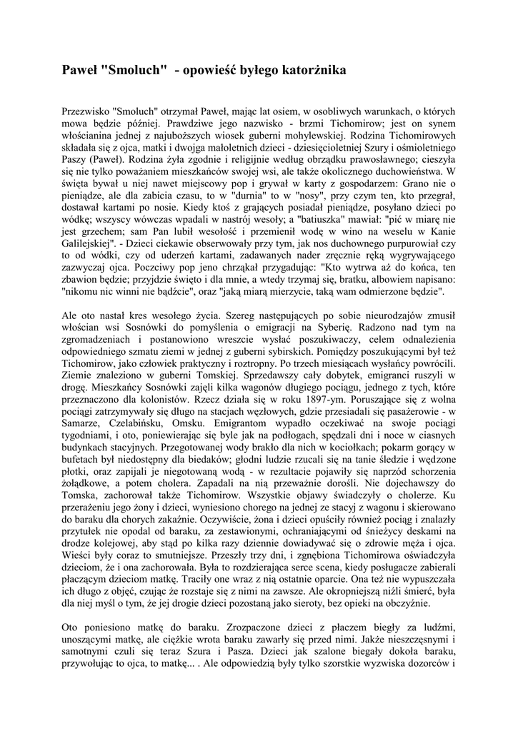 Paweł "Smoluch" - opowieść byłego katorżnika Przezwisko "Smoluch" otrzymał Paweł, mając lat osiem, w osobliwych warunkach, o których mowa będzie później. Prawdziwe jego nazwisko - brzmi Tichomirow; jest on synem włościanina jednej z najuboższych wiosek guberni mohylewskiej. Rodzina Tichomirowych składała się z ojca, matki i dwojga małoletnich dzieci - dziesięcioletniej Szury i ośmioletniego Paszy (Paweł). Rodzina żyła zgodnie i religijnie według obrządku prawosławnego; cieszyła się nie tylko poważaniem mieszkańców swojej wsi, ale także okolicznego duchowieństwa. W święta bywał u niej nawet miejscowy pop i grywał w karty z gospodarzem: Grano nie o pieniądze, ale dla zabicia czasu, to w "durnia" to w "nosy", przy czym ten, kto przegrał, dostawał kartami po nosie. Kiedy ktoś z grających posiadał pieniądze, posyłano dzieci po wódkę; wszyscy wówczas wpadali w nastrój wesoły; a "batiuszka" mawiał: "pić w miarę nie jest grzechem; sam Pan lubił wesołość i przemienił wodę w wino na weselu w Kanie Galilejskiej". - Dzieci ciekawie obserwowały przy tym, jak nos duchownego purpurowiał czy to od wódki, czy od uderzeń kartami, zadawanych nader zręcznie ręką wygrywającego zazwyczaj ojca. Poczciwy pop jeno chrząkał przygadując: "Kto wytrwa aż do końca, ten zbawion będzie; przyjdzie święto i dla mnie, a wtedy trzymaj się, bratku, albowiem napisano: "nikomu nic winni nie bądźcie", oraz "jaką miarą mierzycie, taką wam odmierzone będzie". Ale oto nastał kres wesołego życia. Szereg następujących po sobie nieurodzajów zmusił włościan wsi Sosnówki do pomyślenia o emigracji na Syberię. Radzono nad tym na zgromadzeniach i postanowiono wreszcie wysłać poszukiwaczy, celem odnalezienia odpowiedniego szmatu ziemi w jednej z guberni sybirskich. Pomiędzy poszukującymi był też Tichomirow, jako człowiek praktyczny i roztropny. Po trzech miesiącach wysłańcy powrócili. Ziemie znaleziono w guberni Tomskiej. Sprzedawszy cały dobytek, emigranci ruszyli w drogę. Mieszkańcy Sosnówki zajęli kilka wagonów długiego pociągu, jednego z tych, które przeznaczono dla kolonistów. Rzecz działa się w roku 1897-ym. Poruszające się z wolna pociągi zatrzymywały się długo na stacjach węzłowych, gdzie przesiadali się pasażerowie - w Samarze, Czelabińsku, Omsku. Emigrantom wypadło oczekiwać na swoje pociągi tygodniami, i oto, poniewierając się byle jak na podłogach, spędzali dni i noce w ciasnych budynkach stacyjnych. Przegotowanej wody brakło dla nich w kociołkach; pokarm gorący w bufetach był niedostępny dla biedaków; głodni ludzie rzucali się na tanie śledzie i wędzone płotki, oraz zapijali je niegotowaną wodą - w rezultacie pojawiły się naprzód schorzenia żołądkowe, a potem cholera. Zapadali na nią przeważnie dorośli. Nie dojechawszy do Tomska, zachorował także Tichomirow. Wszystkie objawy świadczyły o cholerze. Ku przerażeniu jego żony i dzieci, wyniesiono chorego na jednej ze stacyj z wagonu i skierowano do baraku dla chorych zakaźnie. Oczywiście, żona i dzieci opuściły również pociąg i znalazły przytułek nie opodal od baraku, za zestawionymi, ochraniającymi od śnieżycy deskami na drodze kolejowej, aby stąd po kilka razy dziennie dowiadywać się o zdrowie męża i ojca. Wieści były coraz to smutniejsze. Przeszły trzy dni, i zgnębiona Tichomirowa oświadczyła dzieciom, że i ona zachorowała. Była to rozdzierająca serce scena, kiedy posługacze zabierali płaczącym dzieciom matkę. Traciły one wraz z nią ostatnie oparcie. Ona też nie wypuszczała ich długo z objęć, czując że rozstaje się z nimi na zawsze. Ale okropniejszą niźli śmierć, była dla niej myśl o tym, że jej drogie dzieci pozostaną jako sieroty, bez opieki na obczyźnie. Oto poniesiono matkę do baraku. Zrozpaczone dzieci z płaczem biegły za ludźmi, unoszącymi matkę, ale ciężkie wrota baraku zawarły się przed nimi. Jakże nieszczęsnymi i samotnymi czuli się teraz Szura i Pasza. Dzieci jak szalone biegały dokoła baraku, przywołując to ojca, to matkę... . Ale odpowiedzią były tylko szorstkie wyzwiska dozorców i groźby pobicia, o ile nie odejdą. Jednakże dzieci nie przestawały krzyczeć i prosić o wpuszczenie ich do baraku, aby umrzeć mogły wraz z rodzicami, bez których - jak powiadały - nie chcą i nie mogą żyć. Tak biegały biedactwa do późnej nocy i dopiero chłód nocy zmusił je do pomyślenia o odzieży, którą wraz z innymi rzeczami pozostawiły gdzie indziej. Przybywszy na miejsce, gdzie siedziały wprzód z matką przed jej zasłabnięciem, nie znalazły ani śladu swego bagażu: ktoś widać złakomił się na nędzny dobytek emigrantów... Wcisnąwszy się pomiędzy deski, dzieci mocno przytuliły się do siebie, aby się cokolwiek ogrzać. Szura, jako starsza, troszczyła się bardzo o swojego braciszka, aż do świtu nie zmrużyła oczu i noc ta wydawała jej się wiecznością. Zaledwie Pasza się obudził, pobiegli oboje do baraku. Pierwszy dozorca, jakiego napotkali, powiedział im: "Nie przychodźcie więcej: rankiem wynieśliśmy trupa waszego ojca, a matka wasza także pewno umrze dzisiaj". Trudno było przekonać dzieci, aby nie zbliżały się do baraku. Zaglądały wciąż przez okna i przywoływały mamę. Czyliż naprawdę zmilknie dla nich jej słodki głos; czy w istocie i ona na wieczór będzie zimnym trupem? Tak, wieczorem dowiedziały się, że matka umarła. Objąwszy się, siedziały przy ścianie i gorzko płakały. Nocy tej Pasza nie spał ani chwili, ciągle płakał i tęsknił. Wsparty o ścianę, spoglądał na uchodzący w dal szlak drogi żelaznej i przeżywał dziecięcą wyobraźnią okrutne zdarzenia ostatnich dni. Wreszcie, zauważywszy nadchodzący pociąg, rzekł: "Szura; nie chcę żyć bez taty i mamy; pójdźmy, połóżmy się na szynach; niechaj lokomotywa nas zgniecie na śmierć. Po co mamy żyć?