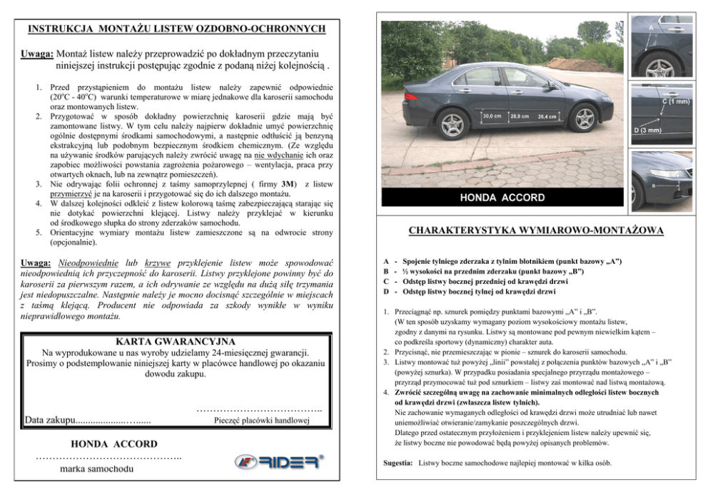 INSTRUKCJA MONTAŻU LISTEW OZDOBNO-OCHRONNYCH Uwaga: Montaż listew należy przeprowadzić po dokładnym przeczytaniu niniejszej instrukcji postępując zgodnie z podaną niżej kolejnością . 1. Przed przystąpieniem do montażu listew należy zapewnić odpowiednie (20oC - 40oC) warunki temperaturowe w miarę jednakowe dla karoserii samochodu oraz montowanych listew. 2. Przygotować w sposób dokładny powierzchnię karoserii gdzie mają być zamontowane listwy. W tym celu należy najpierw dokładnie umyć powierzchnię ogólnie dostępnymi środkami samochodowymi, a następnie odtłuścić ją benzyną ekstrakcyjną lub podobnym bezpiecznym środkiem chemicznym. (Ze względu na używanie środków parujących należy zwrócić uwagę na nie wdychanie ich oraz zapobiec możliwości powstania zagrożenia pożarowego – wentylacja, praca przy otwartych oknach, lub na zewnątrz pomieszczeń). 3. Nie odrywając folii ochronnej z taśmy samoprzylepnej ( firmy 3M) z listew przymierzyć je na karoserii i przygotować się do ich dalszego montażu. 4. W dalszej kolejności odkleić z listew kolorową taśmę zabezpieczającą starając się nie dotykać powierzchni klejącej. Listwy należy przyklejać w kierunku od środkowego słupka do strony zderzaków samochodu. 5. Orientacyjne wymiary montażu listew zamieszczone są na odwrocie strony (opcjonalnie). Uwaga: Nieodpowiednie lub krzywe przyklejenie listew może spowodować nieodpowiednią ich przyczepność do karoserii. Listwy przyklejone powinny być do karoserii za pierwszym razem, a ich odrywanie ze względu na dużą siłę trzymania jest niedopuszczalne. Następnie należy je mocno docisnąć szczególnie w miejscach z taśmą klejącą. Producent nie odpowiada za szkody wynikłe w wyniku nieprawidłowego montażu. KARTA GWARANCYJNA Na wyprodukowane u nas wyroby udzielamy 24-miesięcznej gwarancji. Prosimy o podstemplowanie niniejszej karty w placówce handlowej po okazaniu dowodu zakupu. ……………………………….. Data zakupu....................…...... HONDA ACCORD …………………………………….. . marka samochodu Pieczęć placówki handlowej CHARAKTERYSTYKA WYMIAROWO-MONTAŻOWA A B C D - Spojenie tylniego zderzaka z tylnim błotnikiem (punkt bazowy „A”) ½ wysokości na przednim zderzaku (punkt bazowy „B”) Odstęp listwy bocznej przedniej od krawędzi drzwi Odstęp listwy bocznej tylnej od krawędzi drzwi 1. Przeciągnąć np. sznurek pomiędzy punktami bazowymi „A” i „B”. (W ten sposób uzyskamy wymagany poziom wysokościowy montażu listew, zgodny z danymi na rysunku. Listwy są montowane pod pewnym niewielkim kątem – co podkreśla sportowy (dynamiczny) charakter auta. 2. Przycisnąć, nie przemieszczając w pionie – sznurek do karoserii samochodu. 3. Listwy montować tuż powyżej „linii” powstałej z połączenia punktów bazowych „A” i „B” (powyżej sznurka). W przypadku posiadania specjalnego przyrządu montażowego – przyrząd przymocować tuż pod sznurkiem – listwy zaś montować nad listwą montażową. 4. Zwrócić szczególną uwagę na zachowanie minimalnych odległości listew bocznych od krawędzi drzwi (zwłaszcza listew tylnich). Nie zachowanie wymaganych odległości od krawędzi drzwi może utrudniać lub nawet uniemożliwiać otwieranie/zamykanie poszczególnych drzwi. Dlatego przed ostatecznym przyłożeniem i przyklejeniem listew należy upewnić się, że listwy boczne nie powodować będą powyżej opisanych problemów. Sugestia: Listwy boczne samochodowe najlepiej montować w kilka osób.