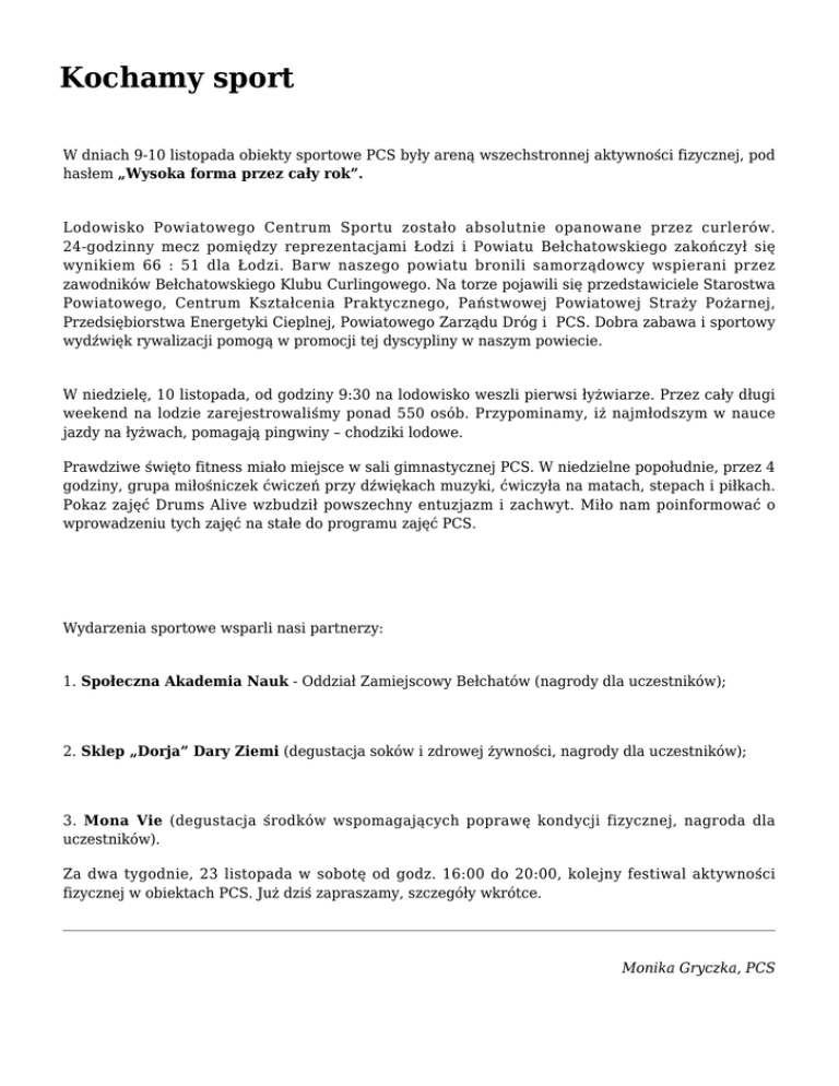 Kochamy sport W dniach 9-10 listopada obiekty sportowe PCS były areną wszechstronnej aktywności fizycznej, pod hasłem „Wysoka forma przez cały rok”. Lodowisko Powiatowego Centrum Sportu zostało absolutnie opanowane przez curlerów. 24-godzinny mecz pomiędzy reprezentacjami Łodzi i Powiatu Bełchatowskiego zakończył się wynikiem 66 : 51 dla Łodzi. Barw naszego powiatu bronili samorządowcy wspierani przez zawodników Bełchatowskiego Klubu Curlingowego. Na torze pojawili się przedstawiciele Starostwa Powiatowego, Centrum Kształcenia Praktycznego, Państwowej Powiatowej Straży Pożarnej, Przedsiębiorstwa Energetyki Cieplnej, Powiatowego Zarządu Dróg i PCS. Dobra zabawa i sportowy wydźwięk rywalizacji pomogą w promocji tej dyscypliny w naszym powiecie. W niedzielę, 10 listopada, od godziny 9:30 na lodowisko weszli pierwsi łyżwiarze. Przez cały długi weekend na lodzie zarejestrowaliśmy ponad 550 osób. Przypominamy, iż najmłodszym w nauce jazdy na łyżwach, pomagają pingwiny – chodziki lodowe. Prawdziwe święto fitness miało miejsce w sali gimnastycznej PCS. W niedzielne popołudnie, przez 4 godziny, grupa miłośniczek ćwiczeń przy dźwiękach muzyki, ćwiczyła na matach, stepach i piłkach. Pokaz zajęć Drums Alive wzbudził powszechny entuzjazm i zachwyt. Miło nam poinformować o wprowadzeniu tych zajęć na stałe do programu zajęć PCS. Wydarzenia sportowe wsparli nasi partnerzy: 1. Społeczna Akademia Nauk - Oddział Zamiejscowy Bełchatów (nagrody dla uczestników); 2. Sklep „Dorja” Dary Ziemi (degustacja soków i zdrowej żywności, nagrody dla uczestników); 3. Mona Vie (degustacja środków wspomagających poprawę kondycji fizycznej, nagroda dla uczestników). Za dwa tygodnie, 23 listopada w sobotę od godz. 16:00 do 20:00, kolejny festiwal aktywności fizycznej w obiektach PCS. Już dziś zapraszamy, szczegóły wkrótce. Monika Gryczka, PCS