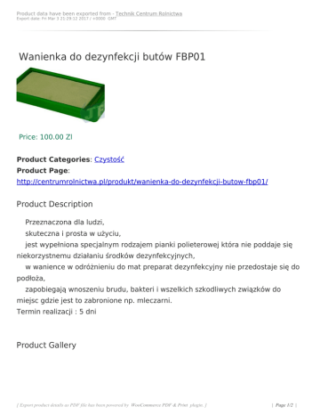 Product data have been exported from - Technik Centrum Rolnictwa Export date: Fri Mar 3 21:29:12 2017 / +0000 GMT Wanienka do dezynfekcji butów FBP01 Price: 100.00 Zl Product Categories: Czystość Product Page: http://centrumrolnictwa.pl/produkt/wanienka-do-dezynfekcji-butow-fbp01/ Product Description Przeznaczona dla ludzi, skuteczna i prosta w użyciu, jest wypełniona specjalnym rodzajem pianki polieterowej która nie poddaje się niekorzystnemu działaniu środków dezynfekcyjnych, w wanience w odróżnieniu do mat preparat dezynfekcyjny nie przedostaje się do podłoża, zapobiegają wnoszeniu brudu, bakteri i wszelkich szkodliwych związków do miejsc gdzie jest to zabronione np. mleczarni. Termin realizacji : 5 dni Product Gallery [ Export product details as PDF file has been powered by WooCommerce PDF & Print plugin. ] | Page 1/2 | Product data have been exported from - Technik Centrum Rolnictwa Export date: Fri Mar 3 21:29:12 2017 / +0000 GMT [ Export product details as PDF file has been powered by WooCommerce PDF & Print plugin. ] | Page 2/2 |