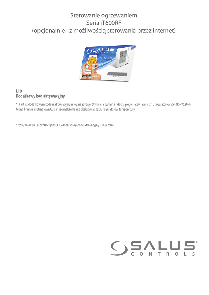 Sterowanie ogrzewaniem Seria iT600RF (opcjonalnie - z możliwością sterowania przez Internet) L10 Dodatkowy kod aktywacyjny * Karta z dodatkowym kodem aktywacyjnym wymagana jest tylko dla systemu składającego się z więcej niż 10 regulatorów VS10RF/VS20RF. Jedna bramka inetrnetowa G30 może maksymalnie obsługiwać aż 30 regulatorów temperatury. http://www.salus-controls.pl/pl,l10-dodatkowy-kod-aktywacyjny,514,p.html