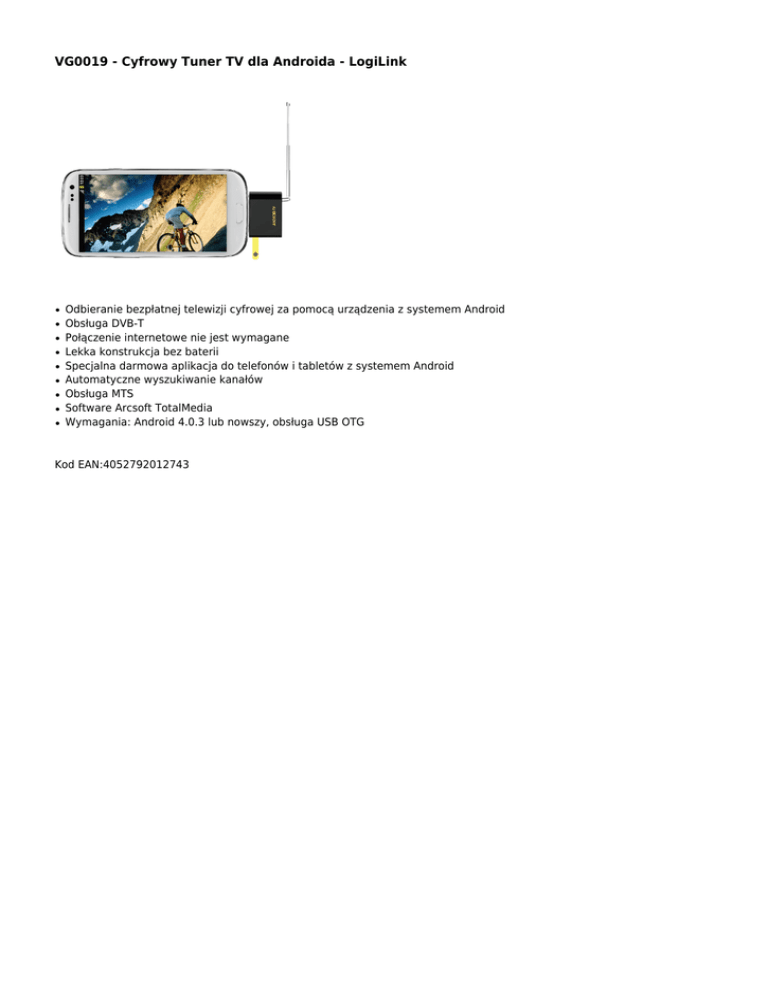 VG0019 - Cyfrowy Tuner TV dla Androida - LogiLink ● ● ● ● ● ● ● ● ● Odbieranie bezpłatnej telewizji cyfrowej za pomocą urządzenia z systemem Android Obsługa DVB-T Połączenie internetowe nie jest wymagane Lekka konstrukcja bez baterii Specjalna darmowa aplikacja do telefonów i tabletów z systemem Android Automatyczne wyszukiwanie kanałów Obsługa MTS Software Arcsoft TotalMedia Wymagania: Android 4.0.3 lub nowszy, obsługa USB OTG Kod EAN:4052792012743