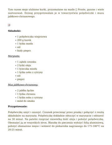 Tym razem moje ulubione kurki, przysmażane na maśle Proste, pyszne i wiele zastosowań. Dzisiaj przygotowałam je w towarzystwie polędwiczki i musu jabłkowo-chrzanowego. Składniki: 1 polędwiczka wieprzowa 200 g kurek 1 łyżka masła sól biały pieprz Marynata: 1 ząbek czosnku 2 łyżki oleju 1 łyżeczka miodu 1 łyżka soku z cytryny sól pieprz Mus jabłkowo-chrzanowy: 2 jabłka łąckie 1 łyżka chrzanu 1 łyżka soku z cytryny miód do smaku Przygotowanie: Polędwiczkę umyć i osuszyć. Czosnek przecisnąć przez praskę i połączyć z resztą składników na marynatę. Polędwiczkę dokładnie obtoczyć w marynacie i odstawić na 30 minut. Na patelni rozgrzać niewielką ilość oleju i położyć polędwiczkę. Obsmażyć ją ze wszystkich stron. Blaszkę do pieczenia wyłożyć folią aluminiową, położyć obsmażone mięso i wstawić do piekarnika nagrzanego do 175-180°C na 20-25 minut. Kurki oczyścić i umyć, większe pokroić. Na patelni rozgrzać łyżkę masła i wrzucić kurki. Doprawić solą i pieprzem. Smażyć przez około 3-4 minuty, od czasu do czasu mieszając. Mus jabłkowo-chrzanowy: Jabłka umyć, osuszyć, przekroić na pół i wstawić do piekarnika nagrzanego do 170°C na około 30 minut. Mają być miękkie. Upieczone obrać i zmiksować z chrzanem i sokiem z cytryny. W razie potrzeby dodać odrobinę miodu. Smacznego Pikantna zapiekanka ziemniaczana z mięsem mielonym, papryką, pomidorami, czerwoną fasolą i kukurydzą, pod warstwą cheddara. Przepyszna i sycąca. Polecam ! Składniki: 1 kg ziemniaków 400g mielonej wieprzowiny 1 cebula 2 ząbki czosnku 2 puszki rozdrobnionych pomidorów (po 400g) 1 puszka czerwonej fasoli (400g) 100g kukurydzy z puszki 1 średnia czerwona papryka 1 papryczka chilli 1 płaska łyżka koncentratu pomidorowego „Pudliszki” 1/2 łyżeczki rozmarynu 1 łyżeczka kminu rzymskiego 1/3 łyżeczki cynamonu 1/2 szklanki bulionu 1/2 pęczka natki pietruszki 3 łyżki startego cheddara około 3-4 łyżek oliwy z oliwek sól Przygotowanie: Na patelni rozgrzewamy oliwę, wrzucamy mięso, drobno pokrojoną cebulę, rozmaryn, rozgnieciony kmin rzymski, cynamon, trochę soli i mieszamy. Wszystko lekko rumienimy i dodajemy posiekany czosnek. Mieszamy i podsmażamy. Następnie wlewamy bulion, pomidory (razem z zalewą), koncentrat pomidorowy, pokrojoną paprykę i drobno posiekaną chilli. Mieszamy. Gotujemy na małym ogniu, bez przykrycia, aż sos się zredukuje i zgęstnieje. Fasolę i kukurydzę odsączamy z zalewy i dodajemy do sosu. Wrzucamy posiekaną natkę pietruszki i mieszamy. Doprawiamy solą. Ziemniaki obieramy i kroimy w cienkie plasterki. Naczynie żaroodporne smarujemy delikatnie masłem i układamy w nim na przemian ziemniaki i sos. Przykrywamy pokrywką lub folią aluminiową i wstawiamy do nagrzanego do 170-180 stopni piekarnika. Pieczemy około 1 godziny (do miękkości ziemniaków). Po około 45 minutach pieczenia, zdejmujemy pokrywkę i posypujemy wierzch zapiekanki startym serem (już nie przykrywamy). Smacznego W zasadzie to moja wariacja na temat gulaszu… Chudziutkie mięso z szynki wieprzowej w sosie pomidorowym, podane z kaszą kuskus. Prosty i smaczny pomysł na obiad Składniki: 600 g szynki wieprzowej 1 duża cebula 3 ząbki czosnku 1/2 łyżeczki kminu rzymskiego 1 łyżeczka oregano 1 łyżeczka pieprzu ziołowego 1/2 łyżeczki bazylii 1/2 łyżeczki tymianku 1/2 papryczki chilli 2 puszki pomidorów (po 400 g) 1,5 łyżki koncentratu pomidorowego „Pudliszki” około 1 szklanki bulionu 3 łyżki suszonej słodkiej papryki 7 suszonych pomidorów (w oleju) szczypta cukru oliwa z oliwek sól Przygotowanie: Szynkę kroimy w kostkę i przekładamy do miseczki. Dodajemy 2 łyżki oliwy z oliwek, rozgnieciony kmin rzymski, oregano, pieprz ziołowy, bazylię, tymianek i delikatnie solimy. Dokładnie mieszamy i odstawiamy na godzinę do lodówki. Na patelni rozgrzewamy trochę oliwy, wrzucamy mięso i chwilę smażymy. Następnie dodajemy drobno pokrojoną cebulę, papryczkę chilli, czosnek i smażymy, aż lekko się zrumienią. Dokładamy pomidory z puszki (razem z zalewą), koncentrat pomidorowy, suszoną paprykę, szczyptę cukru i wlewamy bulion. Mieszamy. Dusimy do miękkości mięsa, w razie potrzeby dolewamy trochę bulionu. Gdy sos odparuje i zgęstnieje, dodajemy pokrojone suszone pomidory, mieszamy i doprawiamy solą. Podajemy z kaszą kuskus. Smacznego Moussaka to sztandarowe danie kuchni greckiej, przygotowywane na bazie bakłażana, mielonego mięsa i sosu pomidorowego. W zależności od wersji, dodawane są też ziemniaki lub cukinia. Zapiekanka składa się z warstw przykrytych beszamelową pierzynką i rumianym serem… Prawdziwa eksplozja smaku. Składniki: 2 bakłażany 400 g mieszanego mielonego mięsa (jagnięciny, wieprzowiny i cielęciny) 1 cebula 3 ząbki czosnku 2 puszki pomidorów (po 400 g) 3 łyżeczki koncentratu pomidorowego 2 duże ziemniaki 1 laska cynamonu 1 łyżeczka oregano 1 łyżeczka tymianku 1 łyżeczka rozmarynu starty parmezan oliwa z oliwek sól, pieprz Sos beszamelowy: 1 duża łyżka masła 2 łyżki mąki 2 szklanki mleka 1 łyżka parmezanu sól biały pieprz Przygotowanie: Bakłażany kroimy w plastry (wzdłuż), solimy i odstawiamy na około 25 minut. Na patelni rozgrzewamy oliwę z oliwek, wrzucamy mięso, drobno posiekaną cebulę i czosnek. Smażymy do uzyskania złotego koloru, od czasu do czasu mieszając. Dodajemy pomidory (jeżeli są całe to rozgniatamy widelcem), koncentrat pomidorowy, laskę cynamonu, tymianek, oregano, rozmaryn. Mieszamy i gotujemy aż sos odparuje i zrobi się gęsty. Doprawiamy solą i pieprzem, wyjmujemy laskę cynamonu. Bakłażana płuczemy z soli, osuszamy i smażymy na dosyć mocno rozgrzanej patelni z niewielką ilością oliwy z oliwek (im mniej oliwy tym lepiej, bo zapiekanka będzie za tłusta) przez 2 minuty z każdej strony. Ziemniaki obieramy, kroimy w plasterki i smażymy tak samo jak bakłażana. Sos be