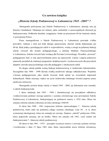 Co zawiera książka „Historia Szkoły Podstawowej w Lubomierzu 1945 –2005” ? Monografia poświęcona jest Szkole Podstawowej w Lubomierzu, ukazuje ona jej historię i działalność. Obejmuje też zmiany, jakie zachodziły w poszczególnych okresach jej funkcjonowania. Podkreśla dorobek, osiągnięcia i braki na przestrzeni 60 lat istnienia szkoły w powojennej Polsce. Praca monograficzna o Szkole Podstawowej w Lubomierzu powstała z kilku powodów. Jednym z nich jest brak takiego opracowania, chociaż szkoła funkcjonuje już 60 lat. Była jedną z przodujących szkół w województwie, ważną z uwagi na pełnioną funkcję szkoły ćwiczeń dla liceum pedagogicznego, a później Studium Nauczycielskiego w Lubomierzu. Szkoła ćwiczeń była wiodącą dla Powiatu Lwóweckiego. Wszelkie „nowości” pedagogiczne były w niej upowszechniane przez jej nauczycieli. Lekcje i zajęcia pokazowe stanowiły przykład do realizacji programów dydaktycznych i wychowawczych dla przyszłych adeptów zawodu nauczycielskiego oraz dla pedagogów z okolicznych szkół. Po drugie szkoła pełniła ważną funkcję kulturotwórczą w środowisku lubomierskim. Szczególnie lata 1960 – 1990 dawały wielką możliwość takiego oddziaływania. Wspólnie z liceum pedagogicznym, jako szkoła ćwiczeń, brała udział we wszystkich imprezach kulturalnych. Miała znaczący wpływ na życie środowiska lokalnego również poprzez prace społeczno-użyteczne. Monografia zawiera dzieje szkoły w latach 1945 – 2005, jej dokonania oraz warunki, w jakich funkcjonowała. I okres obejmuje lata 1945 - 1948 i charakteryzuje się początkiem odbudowy i reaktywowania podstaw nowego państwa i systemu oświatowego oraz powstaniem Szkoły Podstawowej w Lubomierzu, funkcjonującej na podstawie ustawy z 1932 roku. Okres ten zamyka reforma szkolna wdrożona od roku szkolnego 1948/49. II okres lata 1948 - 1961 rozpoczyna reforma wprowadzająca 7 - klasową szkołę podstawową, która stała się podstawą całego systemu szkolnego. Lata 50 - te to okres wzmożonej ideologizacji, która nie ominęła też oświaty. Dopiero „odwilż” polityczna 1956r. nieco poprawiła sytuację, ale na krótko. Okres ten zamyka rok 1961, czyli ostatni rok funkcjonowania 7 - klasowej szkoły podstawowej. III okres to lata 1961 - 1973 – początek wyznacza ustawa o rozwoju systemu oświaty i wychowania z dnia 15 lipca 1961 roku, która wprowadziła nową reformę oświatową, wydłużając naukę szkolną do 8 lat. Ośmioklasowa szkoła stała się podstawą całego systemu kształcenia. Okres ten kończy Zarządzenie Ministra Oświaty i Wychowania z dnia 17 marca 1973 roku powołujące zbiorcze szkoły gminne, w celu wyrównania poziomu kształcenia w mieście i na wsi. IV okres 1973 - 1989 rozpoczyna się wprowadzeniem uchwały o systemie edukacji narodowej z dnia 17 października 1973. Zapowiedziano utworzenie 10 - letniej powszechnej szkoły średniej. W konsekwencji odstąpiono od realizacji założeń reformy. W tym czasie pogorszyła się sytuacja polityczna w kraju, załamała się gospodarka narodowa, nasilały się niepokoje społeczne, które w latach 80 - tych przerodziły się w falę strajków. Powstał związek „NSZZ Solidarność”, konsekwencją jego działalności było wprowadzenie przez ówczesne władze - stanu wojennego. Okres zamyka rok 1989, jest to początek przemian politycznych, a także koniec władzy komunistów. V okres 1989 - 1999 to wielkie zmiany ustrojowe zapoczątkowane obradami „Okrągłego Stołu”, które doprowadziły do powstania III Rzeczypospolitej. Nastąpiła demokratyzacja życia społecznego i gospodarczego. We wrześniu 1989 r. uchwalono ustawę o systemie oświaty, która kończyła etap szkolnictwa opartego na ośmioklasowej szkole podstawowej. VI okres 1999-2005 to czas realizacji reformy systemu szkolnego wprowadzającej nową strukturę systemu edukacji: sześcioletnie szkoły podstawowe, trzyletnie gimnazja, trzyletnie licea profilowane, szkoły policealne i zawodowe1. Niniejsza praca jest próbą monograficznego ujęcia rozwoju i działalności Szkoły Podstawowej w Lubomierzu w latach 1945 – 2005. Pozwala ona zrozumieć różne problemy, na jakie napotykało szkolnictwo podstawowe. Ukazuje miejsce i rolę szkoły w środowisku lokalnym w wymiarze społecznym i kulturowym oraz umożliwia spojrzenie na nią z perspektywy minionych lat i teraźniejszości. Ostatni rozdział monografii Szkoły Podstawowej w Lubomierzu zawiera opis głównych założeń reformy ustroju szkolnego i tylko najbardziej znaczące fakty z dziejów placówki w latach 1999 - 2005. Opisuje bazę szkoły, prezentuje kadrę i przedstawia szeroką ofertę edukacyjną dla uczniów oraz najważniejsze sukcesy szkoły. Ponadto podane są informacje dotyczące przygotowań do uroczystości 60 lecia placówki, przyjęcia sztandaru i patrona szkoły, które odbyły się 5 listopada 2005 r. autor książki Leszk Telega 1 J. Pielachowski, Organizacja i zarządzanie oświatą i szkołą. EMPI, Poznań 2000, s. 12. 2 Książkę „Historia Szkoły Podstawowej w Lubomierzu 1945 –2005” można zakupić w sekretariacie Szkoły Podstawowej im. Jana Pawła II w Lubomierzu ul. Kościuszki 5. OKŁADKA KSIĄŻKI – 1 STRONA OKŁADKA KSIĄŻKI – 2 STRONA 3