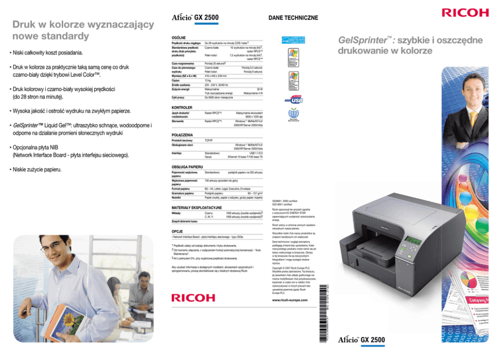 • Druk w kolorze za praktycznie taką samą cenę co druk czarno-biały dzięki trybowi Level Color™. • Druk kolorowy i czarno-biały wysokiej prędkości (do 28 stron na minutę). • Wysoka jakość i ostrość wydruku na zwykłym papierze. • GelSprinter ™ Liquid Gel™: ultraszybko schnące, wodoodporne i odporne na działanie promieni słonecznych wydruki • Niskie zużycie papieru. GelSprinter™: szybkie i oszczędne drukowanie w kolorze OGÓLNE Prędkość druku ciągłego: Do 28 wydruków na minutę CZ/B i kolor1 Standardowa prędkość druku (tryb priorytetu prędkości): Czarno-białe: Pełen kolor: Czas rozgrzewania: Poniżej 35 sekund2 10 wydruków na minutę (A4)1, raster RPCS™ 7,5 wydruków na minutę (A4)1, raster RPCS™ Czas do pierwszego: wydruku Czarno-białe: Pełen kolor: Wymiary (SZ x G x W): 416 x 440 x 249 mm Ciężar: 13 kg Źródło zasilania: Poniżej 6.5 sekund. Poniżej 9 sekund. 220 - 240 V, 50/60 Hz Zużycie energii: Maksymalnie: Tryb oszczędzania energii: Cykl pracy: Do 6000 stron miesięcznie 35 W Maksymalnie 4 W KONTROLER Język drukarki/ rozdzielczość: Raster RPCS™: Maksymalnie ekwiwalent 3600 x 1200 dpi Sterownik: Raster RPCS™: Windows® 98/Me/NT4.0/ 2000/XP/Server 2003/Vista POŁĄCZENIA Protokół sieciowy: • Opcjonalna płyta NIB (Network Interface Board - płyta interfejsu sieciowego). DANE TECHNICZNE TCP/IP Obsługiwane sieci: Interfejs: Windows® 98/Me/NT4.0/ 2000/XP/Server 2003/Vista Standardowo: Opcja: USB 1.1/2.0 Ethernet 10 base-T/100 base-TX Pojemność wejściowa papieru: Standardowo: podajnik papieru na 250 arkuszy Wyjściowa pojemność papieru: 100 arkuszy (przodem do góry) OBSŁUGA PAPIERU Format papieru: B5 – A4, Letter, Legal, Executive, Envelope Gramatura papieru: Podajnik papieru: Nośniki: Papier zwykły, papier z odzysku, gruby papier, koperty 60 – 157 g/m² ISO9001: 2000 certified ISO14001 certified MATERIAŁY EKSPLOATACYJNE Wkłady: Czarny: C, M, Y: 1500 arkuszy (zwykła wydajność)3 1000 arkuszy (zwykła wydajność)3 Zespół zbierania tuszu Ricoh opracował ten produkt zgodnie z wytycznymi EC ENERGY STAR zapewniającymi wydajność wykorzystania energii. Ricoh wierzy w ochronę cennych zasobów naturalnych naszej planety. OPCJE • Network Interface Board - płyta interfejsu sieciowego - typu GX3a 1 Prędkość zależy od rodzaju dokumentu i trybu drukowania. 2 Od momentu włączenia, z wyłączeniem funkcji automatycznej konserwacji - “Auto Maintenance”. 3 A4 z pokryciem 5%, przy wyjściowej prędkości drukowania. Aby uzyskać informacje o dostępnych modelach, akcesoriach opcjonalnych i oprogramowaniu, proszę skontaktować się z lokalnym dostawcą Ricoh. Wszystkie marki i/lub nazwy produktów są znakami handlowymi ich właścicieli. Dane techniczne i wygląd zewnętrzny podlegają zmianie bez uprzedzenia. Kolor rzeczywistego produktu może różnić się od koloru widocznego w broszurze. Obrazy w tej broszurze nie są rzeczywistymi fotografiami i mogą wystąpić drobne różnice. Copyright © 2007 Ricoh Europe PLC. Wszelkie prawa zastrzeżone. Tej broszury, jej zawartości i/lub układu graficznego nie można modyfikować i/lub przystosowywać, kopiować w części ani w całości i/lub wykorzystywać w innych pracach bez uprzedniej pisemnej zgody Ricoh Europe PLC. www.ricoh-europe.com RPO - B1107N - 271323 • Niski całkowity koszt posiadania. GX 2500 *RIGX25000006PLN* Druk w kolorze wyznaczający nowe standardy GX 2500 Innowacyjna technologia druku kolorowego GelSprinter™ Proponując Aficio™GX 2500 Ricoh oferuje użytkownikom indywidualnym i małym biurom nową perspektywę opłacalnego biurowego druku w kolorze. Korzystając z rewolucyjnej technologii GelSprinter™, GX2500 dostarcza dokumenty z prędkością do 28 stron na minutę. Dzięki stabilnej metodzie transportu papieru i szybkiemu utrwalaniu obrazu, ta kolorowa drukarka zapewnia wydruki o intensywnych kolorach. Wykorzystaj ogromne możliwości druku w kolorze oferowane przez GX 2500 do łatwego tworzenia profesjonalnych dokumentów biznesowych. Wysoka wydajność druku • Wysoka prędkość pierwszego wydruku: 6.5/9 sekund (czarnobiałe/kolor). Zaawansowana technologia GelSprinter™ • Krótki czas rozgrzewania: poniżej 35 sekund. • Szybko schnący żel Liquid Gel™ zapewniający trwałe wydruki o intensywnych kolorach z rozdzielczością 1200 dpi. • Imponująca prędkość ciągłego druku wynosząca do 28 wydruków na minutę. • Tryb GelSprinter ™ Level Color™: szybkie wydruki w kolorze za cenę zbliżoną do wydruków czarno-białych. • Możliwość podłączenia do sieci poprzez opcjonalną płytę NIB. • Wysoka jakość przy wysokiej prędkości: dodatkowo poszerzona głowica drukująca, ultraszybko schnący żel Liquid Gel™ i taśmowy układ przenoszenia. • Dodatkowe oszczędności, ponieważ nie trzeba stosować specjalnego papieru. Łatwość użytkowania i oszczędność GX 2500 ułatwia życie i nie rujnuje budżetu: • Prosta instalacja i prosta obsługa poprzez przedni panel. • Proste w obsłudze narzędzia do zarządzania i przydatna funkcja powiadomień e-mail. • Bezpieczne drukowanie poprzez sterownik RPCS™. • Konstrukcja właściwie nie wymagająca konserwacji. 28 PPM • Praktyczny licznik pozwalający na kontrolowanie ilości wydruków.
