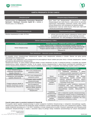 KARTA PRODUKTU ŻYCIE CASCO Ubezpieczyciel Ubezpieczający/Ubezpieczony Ubezpieczycielem jest Wielkopolskie Towarzystwo Ubezpieczeń Życiowych i Rentowych Concordia Capital SA z siedzibą w Poznaniu przy ul. św. Michała 43. Życie Casco jest ubezpieczeniem indywidualnym, w którym Ubezpieczającym jest osoba fizyczna, osoba prawna lub jednostka organizacyjna nieposiadająca osobowości prawnej, która zawiera Umowę ubezpieczenia i jest zobowiązana do opłacania składek. Ubezpieczonym może być osoba fizyczna, której życie, bądź życie i zdrowie jest przedmiotem ubezpieczenia. Produkt kierowany do: Zastosowanie produktu: Klientów indywidualnych w wieku 16-70 lat. ochrona życia dla osób chcących zabezpieczyć dochód rodziny na wypadek sytuacji losowej (np. śmierci głównego żywiciela) zabezpieczenie dla osób posiadających zobowiązania (kredyty) Zakres ubezpieczenia § 7 OWU Ryzyko obowiązkowe Ryzyka dobrowolne – możliwość wyboru wszystkich Śmierć Ubezpieczonego Śmierć Ubezpieczonego w następstwie nieszczęśliwego wypadku (Klauzula 1) Inwalidztwo Ubezpieczonego w następstwie nieszczęśliwego wypadku (Klauzula 28) Przejęcie opłacania składki na wypadek niezdolności do pracy Ubezpieczonego (Klauzula 44) Opis świadczeń – klauzule (ryzyka dodatkowe) W przypadku śmierci Ubezpieczonego Ubezpieczyciel wypłaca sumę ubezpieczenia wskazaną w Umowie. Stanowi ona górną granicę odpowiedzialności Ubezpieczyciela. W przypadku ryzyk dodatkowych: suma ubezpieczenia dla poszczególnych klauzul ustalana jest przez strony w Umowie ubezpieczenia i stanowi górną granicę odpowiedzialności Ubezpieczyciela. Ubezpieczyciel stosuje, na ryzyko przejęcia opłacania składki w wyniku niezdolności do pracy, 6 miesięczną karencję, w przypadku gdy wypadek ubezpieczeniowy będzie następstwem choroby. W tym okresie, ochrona ubezpieczeniowa w danej klauzuli automatycznie przekształca się w ochronę ubezpieczeniową udzielaną w ramach klauzuli Inwalidztwa Ubezpieczonego w następstwie nieszczęśliwego wypadku (zobacz § 15 OWU). Klauzula Śmierć Ubezpieczonego w następstwie nieszczęśliwego wypadku (Klauzula 1) Inwalidztwo Ubezpieczonego w następstwie nieszczęśliwego wypadku (Klauzula 28) Przejęcie opłacania składki na wypadek niezdolności do pracy Ubezpieczonego (Klauzula 44) Świadczenie Klauzula Świadczenie dodatkowe Śmierć Ubezpieczonego w następstwie nieszczęśliwego wypadku (Klauzula 1) Jeżeli wypadek ubezpieczeniowy nastąpił: 1) w następstwie postrzelenia w trakcie strzelaniny pomiędzy napastnikami i policją lub 2) w następstwie pogryzienia przez psa, lub 3) śmierć w następstwie tego samego nieszczęśliwego wypadku poniosło oboje rodziców (prawnych opiekunów), których wszystkie dzieci są od nich finansowo zależne i są poniżej 18 roku życia, Ubezpieczyciel wypłaci dodatkowe świadczenie w wysokości 50% sumy ubezpieczenia na wypadek śmierci Ubezpieczonego w następstwie nieszczęśliwego wypadku. Maksymalnie do 30 000 zł. Inwalidztwo Ubezpieczonego w następstwie nieszczęśliwego wypadku (Klauzula 28) Jeśli w następstwie wypadku ubezpieczeniowego, Ubezpieczony zostanie uznany za niezdolnego do samodzielnej egzystencji, Ubezpieczyciel wypłaci świadczenie dodatkowe w wysokości 75% sumy ubezpieczenia określonej w polisie. 100 % sumy ubezpieczenia wskazanej w polisie do 100 % sumy ubezpieczenia wskazanej w polisie w przypadku zajścia wypadku ubezpieczeniowego Ubezpieczyciel zobowiązany jest do przejęcia po Ubezpieczającym obowiązku opłacania składki regularnej wskazanej w Umowie ubezpieczenia Czynniki mające wpływ na wysokość świadczeń § 3 klauzuli 28 W przypadku zajścia wypadku ubezpieczeniowego w postaci wystąpienia inwalidztwa Ubezpieczonego w następstwie nieszczęśliwego wypadku, Ubezpieczyciel wypłaci świadczenie dla określonego rodzaju inwalidztwa w postaci odpowiedniego procentu sumy ubezpieczenia (zgodnie z Tabelą rodzaju inwalidztwa stanowiącą zał. nr 3 do OWU ) określonej w Umowie ubezpieczenia lub polisie. Wysokość wypłacanego przez Ubezpieczyciela świadczenia ubezpieczeniowego w związku z doznaniem więcej niż jednego rodzaju inwalidztwa spowodowanego tym samym nieszczęśliwym WTUŻiR Concordia Capital Spółka Akcyjna ul. Św. Michała 43, 61-119 Poznań tel. (+48) 61 858 48 00, fax (+48) 61 858 48 01 www.concordiaubezpieczenia.pl 1/3 ŻC/KP/16/02 KARTA PRODUKTU ŻYCIE CASCO wypadkiem nie może przekroczyć wysokości sumy ubezpieczenia. W przypadku, gdy dany rodzaj inwalidztwa będzie uwzględniać w sobie doznanie innego rodzaju inwalidztwa w wyniku zajścia tego samego nieszczęśliwego wypadku, Ubezpieczyciel wypłaci świadczenie ubezpieczeniowe za doznanie tego rodzaju inwalidztwa, za które świadczenie ubezpieczeniowe będzie najwyższe. Okres ochrony ubezpieczeniowej / Rozwiązanie Umowy § 3, § 5, § 12 OWU Ochrona ubezpieczeniowa udzielana jest w okresie ubezpieczenia, dotyczy wyłącznie zdarzeń, które miały miejsce w okresie ubezpieczenia. Okres ubezpieczenia wskazany jest w dokumencie ubezpieczenia. Standardowo Umowa zawierana jest na okres 12 miesięcy i ulega automatycznemu przedłużeniu na kolejny okres, pod warunkiem opłacenia składki za kolejny okres udzielania ochrony ubezpieczeniowej oraz braku pisemnego oświadczenia woli o nieprzedłużeniu Umowy wystosowanego przez którąkolwiek ze stron Umowy na 30 dni przed rocznicą Umowy. Umowa ubezpieczenia ulega rozwiązaniu m.in. wskutek: odstąpienia od Umowy przez Ubezpieczającego, wypowiedzenia Umowy, śmierci Ubezpieczonego, nieopłacenia przez Ubezpieczającego składki - w dniu wskazanym na wezwaniu do zapłaty. Pełen katalog przyczyn rozwiązania lub wypowiedzenia Umowy szczegóły zawarto w § 5 ust. 1 OWU. Indeksacja świadczeń ubezpieczeniowych § 10 OWU Ubezpieczający, z chwilą zawierania Umowy ubezpieczenia może wskazać, w jakiej wysokości procentowej: 0%, 10% lub 20% Ubezpieczyc