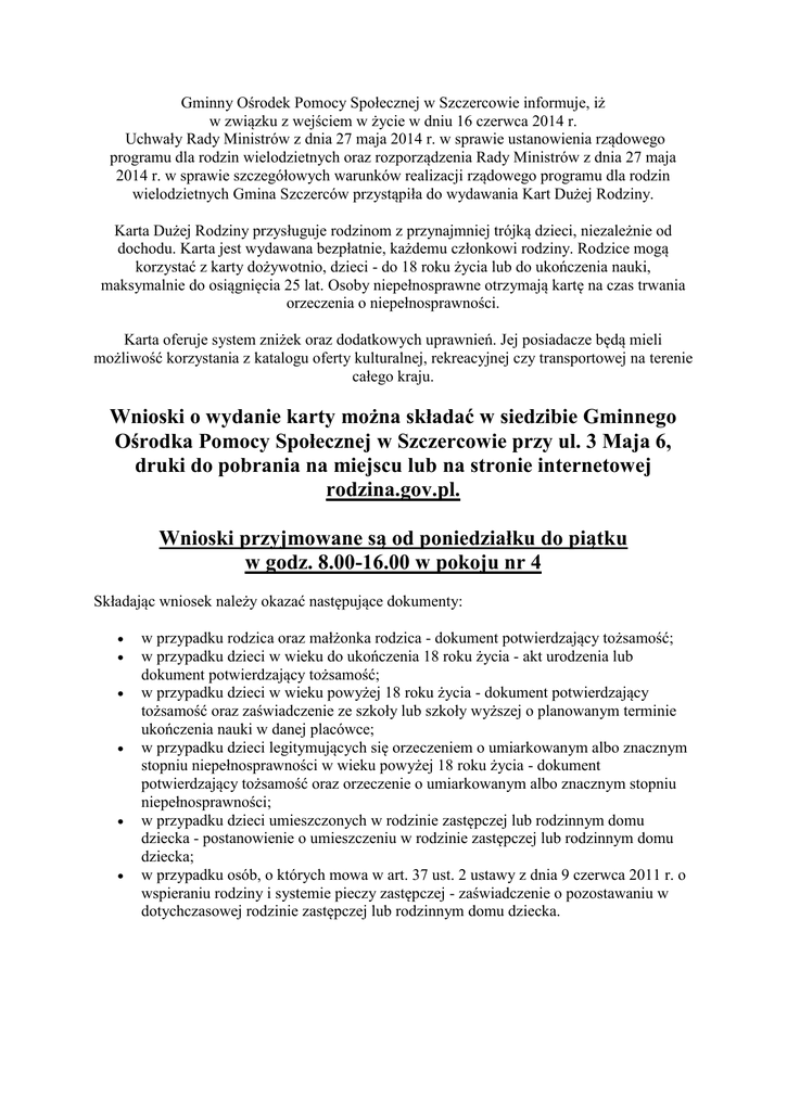 Gminny Ośrodek Pomocy Społecznej w Szczercowie informuje, iż w związku z wejściem w życie w dniu 16 czerwca 2014 r. Uchwały Rady Ministrów z dnia 27 maja 2014 r. w sprawie ustanowienia rządowego programu dla rodzin wielodzietnych oraz rozporządzenia Rady Ministrów z dnia 27 maja 2014 r. w sprawie szczegółowych warunków realizacji rządowego programu dla rodzin wielodzietnych Gmina Szczerców przystąpiła do wydawania Kart Dużej Rodziny. Karta Dużej Rodziny przysługuje rodzinom z przynajmniej trójką dzieci, niezależnie od dochodu. Karta jest wydawana bezpłatnie, każdemu członkowi rodziny. Rodzice mogą korzystać z karty dożywotnio, dzieci - do 18 roku życia lub do ukończenia nauki, maksymalnie do osiągnięcia 25 lat. Osoby niepełnosprawne otrzymają kartę na czas trwania orzeczenia o niepełnosprawności. Karta oferuje system zniżek oraz dodatkowych uprawnień. Jej posiadacze będą mieli możliwość korzystania z katalogu oferty kulturalnej, rekreacyjnej czy transportowej na terenie całego kraju. Wnioski o wydanie karty można składać w siedzibie Gminnego Ośrodka Pomocy Społecznej w Szczercowie przy ul. 3 Maja 6, druki do pobrania na miejscu lub na stronie internetowej rodzina.gov.pl. Wnioski przyjmowane są od poniedziałku do piątku w godz. 8.00-16.00 w pokoju nr 4 Składając wniosek należy okazać następujące dokumenty: w przypadku rodzica oraz małżonka rodzica - dokument potwierdzający tożsamość; w przypadku dzieci w wieku do ukończenia 18 roku życia - akt urodzenia lub dokument potwierdzający tożsamość; w przypadku dzieci w wieku powyżej 18 roku życia - dokument potwierdzający tożsamość oraz zaświadczenie ze szkoły lub szkoły wyższej o planowanym terminie ukończenia nauki w danej placówce; w przypadku dzieci legitymujących się orzeczeniem o umiarkowanym albo znacznym stopniu niepełnosprawności w wieku powyżej 18 roku życia - dokument potwierdzający tożsamość oraz orzeczenie o umiarkowanym albo znacznym stopniu niepełnosprawności; w przypadku dzieci umieszczonych w rodzinie zastępczej lub rodzinnym domu dziecka - postanowienie o umieszczeniu w rodzinie zastępczej lub rodzinnym domu dziecka; w przypadku osób, o których mowa w art. 37 ust. 2 ustawy z dnia 9 czerwca 2011 r. o wspieraniu rodziny i systemie pieczy zastępczej - zaświadczenie o pozostawaniu w dotychczasowej rodzinie zastępczej lub rodzinnym domu dziecka.