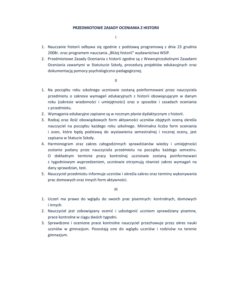 PRZEDMIOTOWE ZASADY OCENIANIA Z HISTORII I 1. Nauczanie historii odbywa się zgodnie z podstawą programową z dnia 23 grudnia 2008r. oraz programem nauczania „Bliżej historii” wydawnictwa WSiP. 2. Przedmiotowe Zasady Oceniania z historii zgodne są z Wewnątrzszkolnymi Zasadami Oceniania zawartymi w Statutucie Szkoły, procedurą projektów edukacyjnych oraz dokumentacją pomocy psychologiczno-pedagogicznej. II 1. Na początku roku szkolnego uczniowie zostaną poinformowani przez nauczyciela przedmiotu o zakresie wymagań edukacyjnych z historii obowiązującym w danym roku (zakresie wiadomości i umiejętności) oraz o sposobie i zasadach oceniania z przedmiotu. 2. Wymagania edukacyjne zapisane są w rocznym planie dydaktycznym z historii. 3. Rodzaj oraz ilość obowiązkowych form aktywności uczniów objętych oceną określa nauczyciel na początku każdego roku szkolnego. Minimalna liczba form oceniania i ocen, które będą podstawą do wystawienia semestralnej i rocznej oceny, jest zapisana w Statucie Szkoły. 4. Harmonogram oraz zakres całogodzinnych sprawdzianów wiedzy i umiejętności zostanie podany przez nauczyciela przedmiotu na początku każdego semestru. O dokładnym terminie pracy kontrolnej uczniowie zostaną poinformowani z tygodniowym wyprzedzeniem, uczniowie otrzymują również zakres wymagań na dany sprawdzian, test. 5. Nauczyciel przedmiotu informuje uczniów i określa zakres oraz terminy wykonywania prac domowych oraz innych form aktywności. III 1. Uczeń ma prawo do wglądu do swoich prac pisemnych: kontrolnych, domowych i innych. 2. Nauczyciel jest zobowiązany ocenić i udostępnić uczniom sprawdziany pisemne, prace kontrolne w ciągu dwóch tygodni. 3. Sprawdzone i ocenione prace kontrolne nauczyciel przechowuje przez okres nauki uczniów w gimnazjum. Pozostają one do wglądu uczniów i rodziców na terenie gimnazjum. IV 1. Całogodzinne sprawdziany wiedzy i umiejętności są obowiązkowe. Jeżeli uczeń z przyczyn losowych nie może napisać go z całą klasą, powinien uczynić to w ciągu dwóch tygodni od momentu powrotu do szkoły, w terminie uzgodnionym z nauczycielem. Niezaliczenie sprawdzianu równoznaczne jest z otrzymaniem oceny niedostatecznej. 2. Poprawa prac klasowych jest dobrowolna i musi odbyć się w ciągu dwóch tygodni od rozdania prac. Uczeń pisze ją tylko raz (uczeń możne poprawić jeden test w semestrze). W szczególnych przypadkach decyzję podejmuje nauczyciel. Punktacja za poprawianą pracę jest taka sama jak za pracę pierwotną. Poprawiona ocena będzie wpisana w dzienniku lekcyjnym zamiast oceny poprawianej. 3. Każdy uczeń ma prawo do wykorzystania różnych form aktywności w celu poprawienia oceny. 4. Bieżące kartkówki pisemne obejmują treść trzech ostatnich lekcji. 5. Z kartkówek i odpowiedzi ustnych uczeń poprawić może tylko oceny niedostateczne. 6. Uczeń jest zobowiązany do prowadzenia zeszytu ćwiczeń i zeszytu przedmiotowego oraz udostępniania go nauczycielowi do wglądu. V 1. Narzędziami pomiaru osiągnięć uczniów są: Forma aktywności Skala ocen Sprawdziany 1-6 Testy 1-6 Osiągnięcia w konkursach przedmiotowych (etap wyższy niż 5-6 szkolny), w konkursach o zasięgu wojewódzkim i ogólnopolskim Osiągnięcia w konkursach na poziomie szkolnym 4-6 Kartkówki 1-5 Odpowiedzi ustne 1-6 Prace domowe 1-6 Praca na lekcji (indywidualna, grupowa) 1-5 Aktywność na lekcji (częste zgłaszanie i udzielanie 1-6 poprawnych odpowiedzi, przygotowanie do lekcji) Prowadzenie zeszytu przedmiotowego i zeszytu ćwiczeń 1-5 Projekty edukacyjne przedmiotowe 1-6 Inna aktywność (dodatkowe prace pisemne; wykonywanie „+”(3”+”=5) dodatkowych zadań, pomocy naukowych, itp.) „-„(3”-„=1) 1-6 Waga oceny 5 4 5 2 3 3 2 1 2 1 4 1 2. Nauczyciel informuje uczniów o wadze sprawdzianu, test, kartkówki przed jej napisaniem. 3. System procentowy oceny sprawdzianów, testów: 30% i mniej –niedostateczna (1) 31%-50% - dopuszczająca (2) 51%-74% - dostateczna (3) 75%-90% - dobra (4) 91%-97% - bardzo dobra (5) 98%-100% - celująca (6). 4. Uczniowie posiadający orzeczenie o potrzebie kształcenia specjalnego mogą korzystać z możliwości pisania sprawdzianów, testów i kartkówek dostosowanych do ich możliwości (zawierających zakres materiału na ocenę dopuszczającą). Skala procentowa ocen jest wtedy stosowana j.w. VI 1. Uczeń może dwa razy w semestrze zgłosić nieprzygotowanie do lekcji (brak pracy domowej, zeszytu, podręcznika, ćwiczenia) nie dotyczy to zapowiedzianych form sprawdzania (sprawdzianów, kartkówek). Zostanie to zaznaczone minusem („-„). 2. Zgłoszenie nieprzygotowania powinno odbyć się przed rozpoczęciem lekcji. VII 1. O wystawionych ocenach semestralnych i końcowo rocznych uczeń i jego rodzice (opiekunowie) jest informowany na tydzień przed klasyfikacją. W przypadku zagrożenia oceną niedostateczną uczeń i jego rodzice (opiekunowie) informowanie są pisemnie na miesiąc przed klasyfikacją. 2. Na ocenę semestralną i końcowo roczną uczeń pracuje systematycznie, nie ma możliwości zmiany oceny w wyniku jednorazowego przygotowania się z określonej części materiału. 3. Ocenę końcowo roczną wystawia się na podstawie ocen uzyskanych przez ucznia w drugim semestrze oraz średniej ważonej za pierwszy semestr z wagą 5. 4. Uczeń nie jest klasyfikowany z przedmiotu, jeżeli brak podstaw do ustalenia oceny klasyfikacyjnej z powodu nieobecności ucznia na zajęciach edukacyjnych przez połowę czasu przeznaczonego na te zajęcia w szkolnym planie nauczania. 5. Jeżeli uczeń otrzymał ocenę niedostateczną za I semestr zobowiązany jest do zaliczenia materiału z tego semestru w terminie wyznaczonym przez nauczyciela. Zakres wiadomości i umiejętności uczeń otrzymuje pisemnie. 6. Inne kwestie nie ujęte w PZO regulowane są przez Statut Szkoły. Opracowała: Małgorzata Jasińska
