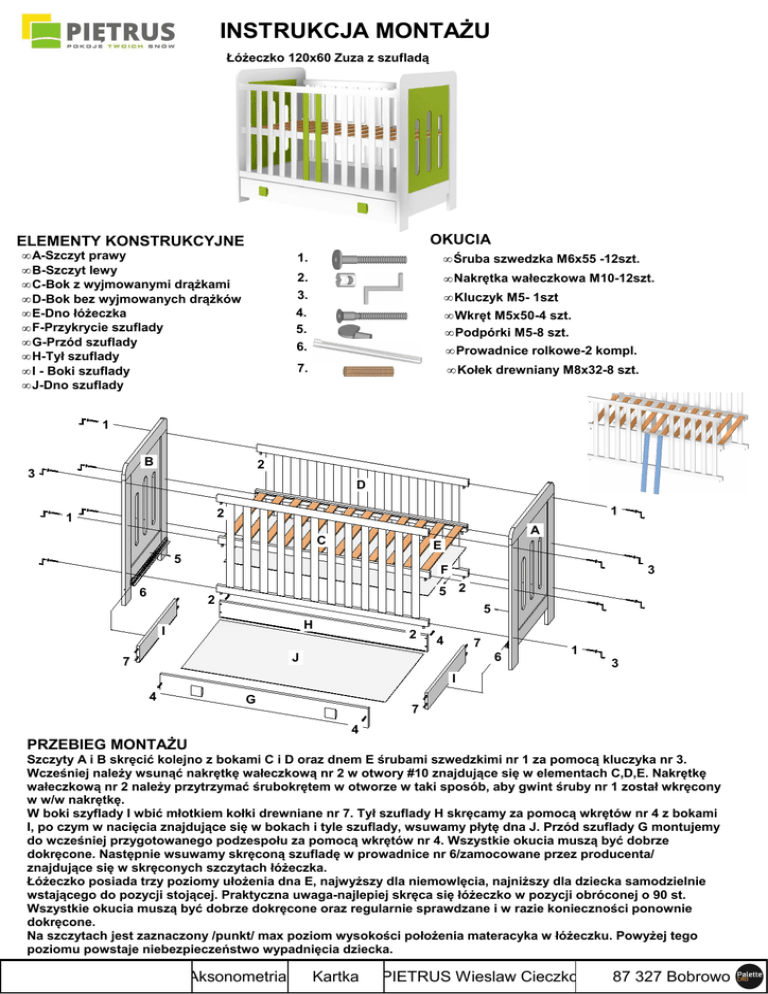 INSTRUKCJA MONTAŻU Łóżeczko 120x60 Zuza z szufladą OKUCIA ELEMENTY KONSTRUKCYJNE • • • • • • • • • • A-Szczyt prawy B-Szczyt lewy C-Bok z wyjmowanymi drążkami D-Bok bez wyjmowanych drążków E-Dno łóżeczka F-Przykrycie szuflady G-Przód szuflady H-Tył szuflady I - Boki szuflady J-Dno szuflady 1 1. • Śruba szwedzka M6x55 -12szt. 2. 3. • Nakrętka wałeczkowa M10-12szt. 4. 5. 6. • Wkręt M5x50-4 szt. • Podpórki M5-8 szt. 7. • Kołek drewniany M8x32-8 szt. • Kluczyk M5- 1szt • Prowadnice rolkowe-2 kompl. 1 B 2 3 B D 1 2 1 A C E 5 6 F 3 5 2 2 5 H I 2 4 7 6 J 7 1 3 I 4 G 7 4 PRZEBIEG MONTAŻU Szczyty A i B skręcić kolejno z bokami C i D oraz dnem E śrubami szwedzkimi nr 1 za pomocą kluczyka nr 3. Wcześniej należy wsunąć nakrętkę wałeczkową nr 2 w otwory #10 znajdujące się w elementach C,D,E. Nakrętkę wałeczkową nr 2 należy przytrzymać śrubokrętem w otworze w taki sposób, aby gwint śruby nr 1 został wkręcony w w/w nakrętkę. W boki szyflady I wbić młotkiem kołki drewniane nr 7. Tył szuflady H skręcamy za pomocą wkrętów nr 4 z bokami I, po czym w nacięcia znajdujące się w bokach i tyle szuflady, wsuwamy płytę dna J. Przód szuflady G montujemy do wcześniej przygotowanego podzespołu za pomocą wkrętów nr 4. Wszystkie okucia muszą być dobrze dokręcone. Następnie wsuwamy skręconą szufladę w prowadnice nr 6/zamocowane przez producenta/ znajdujące się w skręconych szczytach łóżeczka. Łóżeczko posiada trzy poziomy ułożenia dna E, najwyższy dla niemowlęcia, najniższy dla dziecka samodzielnie wstającego do pozycji stojącej. Praktyczna uwaga-najlepiej skręca się łóżeczko w pozycji obróconej o 90 st. Wszystkie okucia muszą być dobrze dokręcone oraz regularnie sprawdzane i w razie konieczności ponownie dokręcone. Na szczytach jest zaznaczony /punkt/ max poziom wysokości położenia materacyka w łóżeczku. Powyżej tego poziomu powstaje niebezpieczeństwo wypadnięcia dziecka. Aksonometria Kartka PIETRUS Wieslaw Cieczko 87 327 Bobrowo