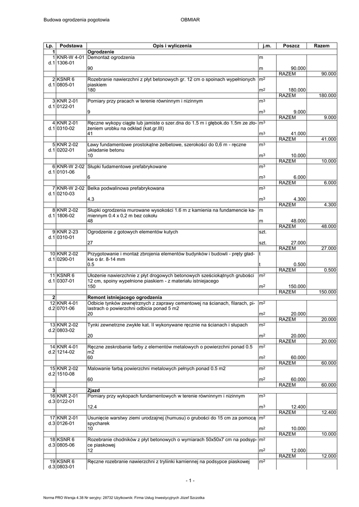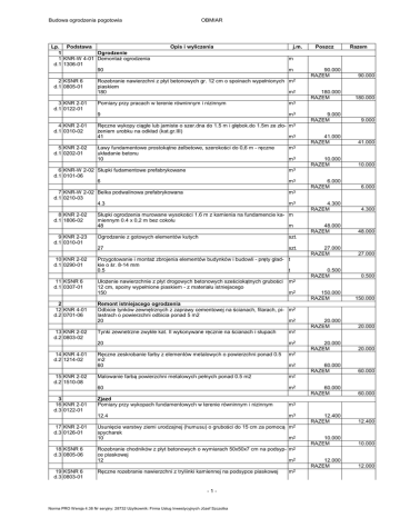 Budowa ogrodzenia pogotowia Lp. Podstawa 1 Ogrodzenie 1 KNR-W 4-01 Demontaż ogrodzenia d.1 1306-01 90 2 KSNR 6 d.1 0805-01 3 KNR 2-01 d.1 0122-01 4 KNR 2-01 d.1 0310-02 5 KNR 2-02 d.1 0202-01 OBMIAR Opis i wyliczenia j.m. m Rozebranie nawierzchni z płyt betonowych gr. 12 cm o spoinach wypełnionych m2 piaskiem 180 m2 Pomiary przy pracach w terenie równinnym i nizinnym m3 9 m3 Ręczne wykopy ciągłe lub jamiste o szer.dna do 1.5 m i głębok.do 1.5m ze zło- m3 żeniem urobku na odkład (kat.gr.III) 41 m3 Ławy fundamentowe prostokątne żelbetowe, szerokości do 0,6 m - ręczne układanie betonu 10 m3 7 KNR-W 2-02 Belka podwalinowa prefabrykowana d.1 0210-03 4.3 m3 10 KNR 2-02 d.1 0290-01 11 KSNR 6 d.1 0307-01 2 12 KNR 4-01 d.2 0701-06 13 KNR 2-02 d.2 0803-02 14 KNR 4-01 d.2 1214-02 15 KNR 2-02 d.2 1510-08 3 16 KNR 2-01 d.3 0122-01 17 KNR 2-01 d.3 0126-01 18 KSNR 6 d.3 0805-06 19 KSNR 6 d.3 0803-01 m3 m3 Słupki ogrodzenia murowane wysokości 1.6 m z kamienia na fundamencie ka- m miennym 0.4 x 0,2 m bez cokołu 48 m Ogrodzenie z gotowych elementów kutych szt. 27 szt. Przygotowanie i montaż zbrojenia elementów budynków i budowli - pręty gład- t kie o śr. 8-14 mm 0.5 t Ułożenie nawierzchnie z płyt drogowych betonowych sześciokątnych grubości 12 cm, spoiny wypełnione piaskiem - z materiału istniejacego 150 m2 Tynki zewnetrzne zwykłe kat. II wykonywane ręcznie na ścianach i słupach m2 20 m2 Ręczne zeskrobanie farby z elementów metalowych o powierzchni ponad 0.5 m2 60 m2 Malowanie farbą powierzchni metalowych pełnych ponad 0.5 m2 m2 60 m2 m2 Zjazd Pomiary przy wykopach fundamentowych w terenie równinnym i nizinnym m3 12.4 m3 Usunięcie warstwy ziemi urodzajnej (humusu) o grubości do 15 cm za pomocą m2 spycharek 10 m2 Rozebranie chodników z płyt betonowych o wymiarach 50x50x7 cm na podsyp- m2 ce piaskowej 12 m2 -1- Norma PRO Wersja 4.38 Nr seryjny: 28732 Użytkownik: Firma Usług Inwestycyjnych Józef Szczotka 90.000 180.000 RAZEM 180.000 9.000 RAZEM 9.000 41.000 RAZEM 41.000 10.000 RAZEM 10.000 6.000 RAZEM 6.000 4.300 RAZEM 4.300 48.000 RAZEM 48.000 27.000 RAZEM 27.000 0.500 RAZEM 0.500 150.000 RAZEM 150.000 20.000 RAZEM 20.000 20.000 RAZEM 20.000 60.000 RAZEM 60.000 60.000 RAZEM 60.000 12.400 RAZEM 12.400 10.000 RAZEM 10.000 12.000 RAZEM 12.000 m2 Remont istniejacego ogrodzenia Odbicie tynków zewnętrznych z zaprawy cementowej na ścianach, filarach, pi- m2 lastrach o powierzchni odbicia ponad 5 m2 20 m2 Ręczne rozebranie nawierzchni z tryliinki kamiennej na podsypce piaskowej 90.000 RAZEM m3 m3 9 KNR 2-23 d.1 0310-01 Razem m 6 KNR-W 2-02 Słupki fudamentowe prefabrykowane d.1 0101-06 6 8 KNR 2-02 d.1 1806-02 Poszcz m2 Budowa ogrodzenia pogotowia Lp. Podstawa OBMIAR Opis i wyliczenia 10.8 20 KNR-W 2-01 Roboty ziemne wykonywane koparkami przedsiębiernymi o pojemności łyżki d.3 0201-05 0.25 m3 w gruncie kat. III z transportem urobku samochodami samowyładowczymi na odległość do 1 km 12.4 21 KNR 2-37/ d.3 GEO 050103 23 KSNR 6 d.3 0403-03 24 KSNR 6 d.3 0401-01 25 KSNR 6 d.3 0404-03 26 KSNR 6 d.3 0606-03 27 KSNR 6 d.3 0302-04 28 KSNR 6 d.3 0307-01 29 KSNR 6 d.3 0307-05 30 KSNR 4 d.3 0205-04 Poszcz 10.800 RAZEM Razem 10.800 m3 m3 12.400 RAZEM 12.400 3.100 RAZEM 3.100 6.200 RAZEM 6.200 6.700 RAZEM 6.700 4.000 RAZEM 4.000 12.000 RAZEM 12.000 8.000 RAZEM 8.000 31.000 RAZEM 31.000 10.000 RAZEM 10.000 6.000 RAZEM 6.000 7.500 RAZEM 7.500 Ręczne wykonanie zagęszczonej warstwy piasku na gotowym podtorzu; piasek m3 dostarczany samochodami samowyładowczymi m3 3.1 22 KNR 2-37/ d.3 GEO 050103 j.m. m2 Mechaniczne wykonanie zagęszczonej warstwy tłucznia na gotowym podtorzu; m3 tłuczeń (kliniec) dostarczany samochodami samowyładowczymi 6.2 m3 Krawężniki betonowe najazdowe z wykonaniem ław betonowych na podsypce piaskowej 6.7 m Krawężniki betonowe wystające o wymiarach 15x30 cm bez ław na podsypce piaskowej 4 m Obrzeża betonowe o wymiarach 30x8 cm na podsypce piaskowej, spoiny wypełnione piaskiem 12 m m m m Ścieki z elementów betonowych gr. 15 cm na podsypce cementowo-piaskowej m 8 m Nawierzchnie z kostki o wysokości 8 cm na podsypce cementowo-piaskowej m2 31 m2 Nawierzchnie z płyt drogowych betonowych sześciokątnych grubości 12 cm, spoiny wypełnione piaskiem - z materiału istniejacego 10 m2 m2 Nawierzchnie z płyt drogowych betonowych kwadratowych grubości 7 cm, spo- m2 iny wypełnione piaskiem - z materiału istniejacego 6 m2 Instalacja odwodnienia z korytek ściekowych - rurociągi z PCW o śr. 160mm m 7.5 m -2- Norma PRO Wersja 4.38 Nr seryjny: 28732 Użytkownik: Firma Usług Inwestycyjnych Józef Szczotka