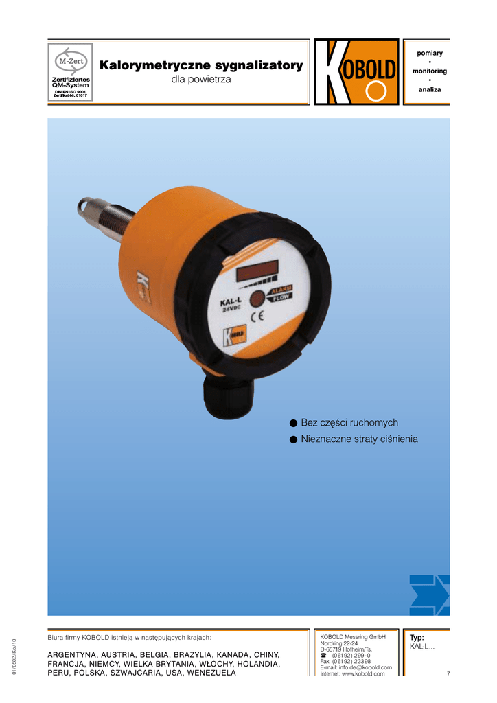 pomiary • monitoring • analiza Kalorymetryczne sygnalizatory dla powietrza ● Bez cz´Êci ruchomych 01/ 0502 / Ko / 10 ● Nieznaczne straty ciÊnienia Biura firmy KOBOLD istniejà w nast´pujàcych krajach: ARGENTYNA, AUSTRIA, BELGIA, BRAZYLIA, KANADA, CHINY, FRANCJA, NIEMCY, WIELKA BRYTANIA, W¸OCHY, HOLANDIA, PERU, POLSKA, SZWAJCARIA, USA, WENEZUELA KOBOLD Messring GmbH Nordring 22-24 D-65719 Hofheim/Ts. (0 61 92 ) 2 99 - 0 Fax (0 61 92 ) 2 33 98 E-mail: [email protected] Internet: www.kobold.com Typ: KAL-L... 7 Kalorymetryczne sygnalizatory typ KAL-L dla powietrza Przeznaczenie Dane techniczne: Elektroniczne sygnalizatory przep∏ywu KAL-L.. s∏u˝à do ciàg∏ego monitorowania przep∏ywu powietrza i mediów gazowych. Konstrukcja urzàdzenia zapewnia ∏atwy monta˝ w kana∏ach wentylacyjnych przy niewielkich stratach ciÊnienia. Zasilanie: Temperatura otoczenia: Temperatura medium: Maksymalne ciÊnienie: Opóênienie: Zakres prze∏àczania: Dzia∏anie Elektroniczne sygnalizatory i przep∏ywomierze KAL-L... dzia∏ajà w oparciu o zasad´ kalorymetrycznà. Czujnik pomiarowy ogrzewany jest do temperatury o kilka stopni wy˝szej ni˝ temperatura medium. Przep∏ywajàca ciecz powoduje sch∏adzanie czujnika. SzybkoÊç procesu ch∏odzenia jest proporcjonalna do pr´dkoÊci przep∏ywu. Drugi czujnik pomiarowy mierzy temperatur´ medium. Modu∏ elektroniczny porównuje rezystancje obu czujników pomiarowych za pomocà mostka Wheastone’a. JeÊli aktualna pr´dkoÊç przep∏ywu odbiega od wartoÊci nastawionej to aktywowane jest wyjÊcie alarmowe. Obszar stosowania ● Systemy klimatyzacji ● Instalacje wyciàgowe ● Instalacje napowietrzania Wymiary 24 VAC/DC – 15%, +10% -10°C ... 60°C -25°C ... 120°C 8 bar maks. 30 sekund 1 do 20 m/sekund´ (przy 20°C, 1 bar) (zakres ograniczony dla innych warunków ciÊnienia i temperatury) Dok∏adnoÊç prze∏àczania: ± 10% mierzonej wartoÊci PowtarzalnoÊç: ± 1% mierzonej wartoÊci Gradient temperatury: 30 K/min. (przy 8 m/s, 90°C) Czas reakcji: 1 ... 60 sekund, programowalny Wskaênik: wskaênik trendu z 8 diodami LED Programowanie punktu sygnalizacji: za pomocà potencjometru, Wskaênik wyjÊcia: dwukolorowe diody LED WyjÊcie: przekaênik, zestyk prze∏àczny WartoÊç znamionowa zestyku: maks. 250 VAC / 1000VA Pràd obcià˝enia: maks. 4 A Stopieƒ ochrony: IP 65 Materia∏ obudowy: Poliamid wzmocniony w∏óknami szklanymi Materia∏ czujnika pomiaru: Niklowany mosiàdz Przy∏àcze elektryczne 176 7 SW 41 oko∏o 70 Ø 15 24 VAC/DC 100 ok. 45 G 1/2" 1/2" NPT Rp 1/2" SW 24 PG 13,5 SW 25 Zamawianie Przy∏àcze procesowe Nr zamówieniowy Bez przy∏àcza – g∏adki trzon D=15 mm KAL L8100 WK Mufa przesuwna G 1/2” KAL L81G1 WK Mufa przesuwna Rp 1/2” KAL L81R1 WK Mufa przesuwna 1/2” NPT KAL L81N1 WK Z zaciskiem zgodnym DIN 43 743 KAL L81FL WK Przy∏àcze elektryczne PG=PG 13,5 ST=z∏àczka M12x1 8 www.kobold.com Zastrzegamy sobie prawo do zmian 01/ 0502 / Ko / 10 Przyk∏ad zamówienia: KAL L81FL WK ST