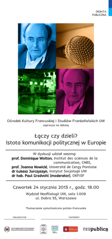 DEBATA PUBLICZNA Ośrodek Kultury Francuskiej i Studiów Frankofońskich UW zaprasza na debatę Łączy czy dzieli? Istota komunikacji politycznej w Europie W dyskusji udział wezmą: prof. Dominique Wolton, Institut des sciences de la communication, CNRS, prof. Joanna Nowicki, Université de Cergy Pontoise dr Łukasz Jurczyszyn, Instytut Socjologii UW dr hab. Paul Gradvohl (moderator), OKFiSF Czwartek 24 stycznia 2013 r., godz. 18.00 Wydział Neofilologii UW, sala 1.008 ul. Dobra 55, Warszawa Tłumaczenie symultaniczne polsko-francuskie ORGANIZATOR PARTNERZY ORGANIZATOR PARTNERZY Śledząc interakcje między aktorami świata politycznego można odnieść wrażenie, że zaostrzenie konfliktu i antagonizmów stało się istotą współczesnych demokracji w Europie. Czy zatem jest jeszcze możliwe tworzenie „pozytywnych” komunikatów politycznych? Na to i inne pytania będą próbowali odpowiedzieć specjaliści komunikacji społecznej, socjologowie oraz politolodzy na przykładzie Polski, Francji, a także Rosji. Prof. Dominique Wolton – socjolog, dyrektor Instytutu Nauk Komunikacji przy CNRS (Centre national de la recherche scientifique). Specjalizuje się w komunikacji politycznej, bada konsekwencje polityczne i kulturowe globalizacji informacji i komunikacji internetowej. Założyciel i redaktor naczelny pisma naukowego Hermès. Prof. Joanna Nowicki – profesor komunikacji i informacji na Wydziale Humanistycznym Uniwersytetu Cergy-Pontoise. Publikacje prof. Joanny Nowickiej dotyczą relacji Wschód/Zachód, wyobraźni zbiorowej Europejczyków, tożsamości pogranicza i współegzystencji kultur. dr Łukasz Jurczyszyn - pracownik Akademii Humanistycznej im. A. Gieysztora w Pułtusku, współtwórca Zespołu Analizy Ruchów Społecznych w Paryżu. Badał konflikty i ruchy społeczne, w szczególności rasizm i nacjonalizm w Polsce, Francji i Rosji. dr hab. Paul Gradvohl (moderator) – Dyrektor Ośrodka Kultury Francuskiej i Studiów Frankofońskich UW. OŚRODEK KULTURY FRANCUSKIEJ I STUDIÓW FRANKOFOŃSKICH Siedziba ul. Krakowskie Przedmieście 26/28 00-927 Warszawa Biuro ul. Dobra 55 00-312 Warszawa e-mail: [email protected], tel. 22 826 77 91 www.okf.uw.edu.pl PRZY WSPARCIU PARTNER STRATEGICZNY PARTNER PARTNER MEDIALNY