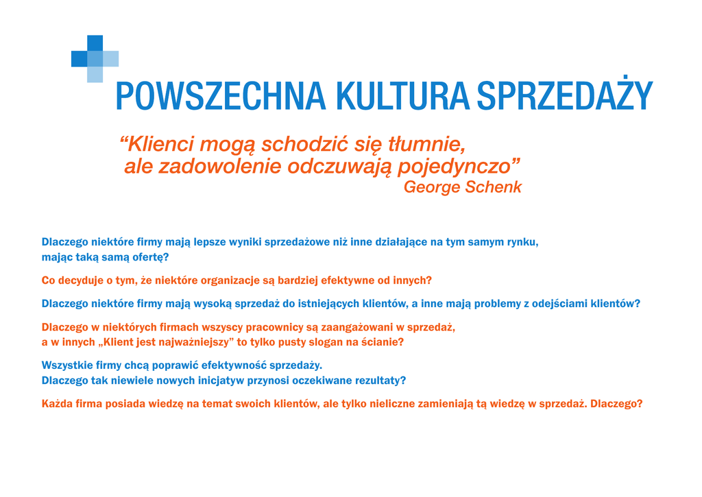 Dlaczego niektóre firmy mają lepsze wyniki sprzedażowe niż inne działające na tym samym rynku, mając taką samą ofertę? Co decyduje o tym, że niektóre organizacje są bardziej efektywne od innych? Dlaczego niektóre firmy mają wysoką sprzedaż do istniejących klientów, a inne mają problemy z odejściami klientów? Dlaczego w niektórych firmach wszyscy pracownicy są zaangażowani w sprzedaż, a w innych „Klient jest najważniejszy” to tylko pusty slogan na ścianie? Wszystkie firmy chcą poprawić efektywność sprzedaży. Dlaczego tak niewiele nowych inicjatyw przynosi oczekiwane rezultaty? Każda firma posiada wiedzę na temat swoich klientów, ale tylko nieliczne zamieniają tą wiedzę w sprzedaż. Dlaczego? Naszym zdaniem firmy osiągają wysokie wyniki sprzedażowe dzięki liderom, którzy mają wizję i umiejętności oddziaływania na organizację żeby strategię, efektywność operacyjną, postawy pracowników i relacje z klientem połączyć w jeden spójny, powszechny i angażujący system. Innymi słowy wdrożyć kulturę korporacyjną ukierunkowaną na sprzedaż. Wiele firm, może również Twoja, właśnie tak określą swoją kulturę. Często jednak potencjał sprzedaży nie jest w pełni wyzwolony, bo w przepływie kultury sprzedażowej występują wąskie gardła, albo brakuje jakiegoś elementu. „Klient jest najważniejszy” deklarują firmy, ale czy relacja firmy z klientem jest zarządzana na każdym etapie rozwoju klienta i w każdym punkcie styku z organizacją? Firmy rozbudowują siły sprzedaży, ale kto jest właścicielem wiedzy o kliencie, firma, pracownicy czy agenci? Firmy rosną i działają, jak odseparowane od siebie „silosy”, czy klient ma wrażenie, że obsługuje go nie jedna, ale wiele firm? Wiele firm usprawnia swoje procesy w oparciu o rekomendacje konsultantów, ale w dłuższej perspektywie zmiany nie działają? Firmy planują inwestycje w zasoby technologiczne, ale czy rzeczywiście istniejąca infrastruktura nie jest wystarczająca do wzmocnienie sprzedaży? Czy inwestycje są powiązane ze wzrostem sprzedaży? Nasze podejście, jest odwróceniem podejścia większości firm doradczych, które najwięcej czasu poświęcają na diagnozę, a wdrożenie ograniczają do przygotowania planu. My szybko diagnozujemy wąskie gardła i uzgadniamy plan działania, aby jak najszybciej przejść do etapu wdrożenia, w którym wspólnie, bezpośrednio współpracując z klientem realizujemy prace. Tym samym zapewniamy trwałość wprowadzonych zmian. Naszym celem, jest poprawa sytuacji klienta i rzeczywisty wzrost sprzedaży. Mamy pełne przekonanie do swoich umiejętności i nie boimy się uzależnienia swojego wynagrodzenia od realnie osiągniętych celów oraz poziomu satysfakcji klienta. Nie proponujemy cyklu szkoleń, ani typowego projektu doradczego kończącego się tylko rekomendacjami. My proponujemy trwałą zmianę oraz realne i mierzalne zwiększenie sprzedaży, poprzez wyzwolenie w firmie kultury korporacyjnej nastawionej na klienta. Nasze wynagrodzenie nie jest uzależnione od czasu poświęconego na pracę, ale od wartości, jaką przynosimy klientowi, np. procent zwiększenia sprzedaży. Praktycznie podejście Zaufanie Jesteśmy konsultantami, mającymi wieloletnie doświadczenie Pracujemy tylko z klientami, którym ufamy i którzy nam ufają. na wysokich stanowiskach kierowniczych w “realnym świecie”, Połowa naszego wynagrodzenia zależy od klienta. w takich organizacjach, jakim doradzamy. Na etapie wdrożenia możemy występować w roli interim managerów Pozwala nam to na wypracowanie praktycznych rozwiązań i bezpośrednio zarządzać wprowadzanymi zmianami. i na efektywny udział we wdrożeniu. Odpowiedzialność i zaangażowanie Całościowość i systemowość Nasz model wynagradzania “wymusza” na nas podejmowanie Tradycyjni konsultanci w zarządzeniu przywiązują małą wagę odpowiedzialnych działań. Podejmujemy się zadań, które wiemy do tzw. miękkich aspektów w organizacji. Doradcy HR często zapominają, jak wykonać. Nie zobowiązujemy się do niczego, czego nie moglibyśmy że biznes to nie tylko szczęśliwi pracownicy, ale przed wszystkim zysk wykonać, wykonujemy wszystko, do czego się zobowiązujemy. dla właścicieli. Firmy szkoleniowe, czasami nie przywiązują wagi do umieszczenia wizji i umiejętności w szerszym kontekście organizacyjnym. Nasze podejście to zarówno równowaga elementów miękkich i twardych, oraz ich wzajemne powiązania. Mierzymy w Wasz cel Specjalizuję się w zarządzaniu zmianą, budowaniu kultury korporacyjnej oraz zaangażowania pracowników. Pracowałem w międzynarodowych firmach doradczych Spencer Stuart, Boston Consulting Group, KPMG. Byłem szefem HR w BRE Banku i pracowałem na wyższych stanowiskach kierowniczych w Banku BPH i Telefonii Dialog. Ukończyłem psychologię na Uniwersytecie Wrocławskim oraz Handel Zagraniczny na Akademii Ekonomicznej we Wrocławiu. Nie uznaję pseudo dylematu – „robić dobrze, czy robić dobre rzeczy?” – oczywiście, robić dobrze dobre rzeczy. Artur Żurek +48 695 100 008 [email protected] Moją specjalnością jest zarządzanie relacjami z klientami oraz budowanie kultury organizacyjnej opartej o efektywność procesową. Pracowałem w międzynarodowych korporacjach telekomunikacyjnych i finansowych na wysokich stanowiskach kierowniczych. W Bankach BPH, Citi Credit Agricole oraz Polkomtel S.A. W ramach PPC doradzałem m.in. Bank Austria, UniCredit oraz Grupie Telenor. Ukończyłem Politechnikę Warszawską oraz uzyskałem dyplom MBA ze Szkoły Biznesu PW w ramach wpólnego programu z HEC i London Business School. Wyznaję maksymę: „Celuj w niebiosa. Jak się nie uda to i tak wylądujesz między gwizdami.” Adil Abdelwahab +48 697 878 751 [email protected]