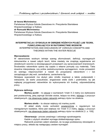 Problemy ogólne i przedmiotowe / General and subject – matter dr Iwona Michniewicz Państwowa Wyższa Szkoła Zawodowa im. Prezydenta Stanisława Wojciechowskiego w Kaliszu dr Romuald Michniewicz Państwowa Wyższa Szkoła Zawodowa im. Prezydenta Stanisława Wojciechowskiego w Kaliszu INTERPRETACJA I DYSKUSJA W OBRĘBIE RÓŻNYCH POJĘĆ LUB TEORII, FUNKCJONUJĄCYCH W RATOWNICTWIE WODNYM INTERPRETATION AND DISCUSSION OF VARIOUS CONCEPTS AND THEORIES WITHIN THE WATER RESCUE Wprowadzenie W ratownictwie wodnym istnieje szereg sformułowań, definicji, wymaganych dokumentów a nawet całych teorii, które niestety nie znajdują wyjaśnienia ani określonych wzorów w obowiązujących przepisach czy opracowaniach branżowych. Środowisko ratowników opiera się często o własne pomysły czy materiały. Taka dowolna interpretacja, czy próba zadośćuczynienia wymaganiom, może prowadzić do szeregu nieporozumień a nawet do przypisania ratownikom i / lub zarządzającym złej woli, zaniedbania, zaniechania itp. Niniejsza wypowiedź ma służyć jako źródło inspiracji a także podpowiedź i wskazanie, że warto poszukiwać, angażować wiele osób i podmiotów, by jak najlepiej przygotować ratowników do wykonywania ich trudnej, odpowiedzialnej pracy. Wybrane definicje Martwy punkt – to obszar o wymiarach 1metr X 2 metry (co dyktowane jest powierzchnią, jaką zajmuje dorosła osoba, leżąca na dnie), którego z przyczyn obiektywnych, nie obserwuje żaden ratownik pełniący dyżur na obiekcie. Martwa strefa – to obszar większy niż martwy punkt. W skład strefy może wchodzić powierzchnia o regularnym lub nieregularnym kształcie, która jest większa niż 1metr X 2 metry, której z przyczyn obiektywnych, nie obserwuje żaden ratownik pełniący dyżur na obiekcie [1, s. 105]. Obserwacja - proces uważnego i celowego spostrzegania. Każde z użytych określeń wymaga dokładniejszego opisu. Ratownik powinien zatem wiedzieć, że na jego podstawowy obowiązek w miejscu pracy, składa się następujący zestaw wymagań: 25 Po pierwsze to proces, czyli czynność wykonywana płynnie i stale, w jakiejś ramie czasowej. Nie można tego traktować jako krótkiego, jednorazowego aktu, polegającego na chwilowym zatrzymaniu wzroku na wybranym elemencie lub „omieceniu” wzrokiem obszaru wodnego (tzw. rzut oka). Po drugie mowa jest o uważnym prowadzeniu tej czynności. Uważnie, to znaczy ze skupieniem, koncentracją, z nastawieniem na wychwycenie ewentualnych zagrożeń. Uważnie coś robić, oznacza tyle, że należy przykładać do tego pewną wagę, czyli, że jest to istotne, że wymaga dołożenia starań, wysiłku i skupienia. Po trzecie obserwacja ma być celowa. Rozumieć to należy w ten sposób, że ma czemuś służyć, że wykonuje się ją z konkretnym założeniem, w określonym celu. Oczywiście chodzi o to, żeby zauważyć sytuację zagrożenia i odpowiednio na nią zareagować – podjąć stosowne czynności profilaktyczne (bo takie jest główne zadanie zatrudnianych ratowników) wobec osób mających problemy w wodzie. Po czwarte – spostrzeganie, czyli zauważanie. Nie chodzi o to, by mieć głowę (wzrok) skierowaną w stronę obserwowanej przestrzeni. Chodzi o to, by widzieć to, co się dzieje na danym obszarze. Spostrzeganie – to rejestrowanie, dostrzeganie i przetwarzanie sygnałów, w celu skutecznego zapobiegania skutkom wypadków [1. s.10,11]. Stanowisko ratownicze – to odpowiednio zorganizowana i wyposażona strefa, w której ratownik wodny, realizuje swoje obowiązki zawodowe (pełni funkcję, sprawuje dyżur ratowniczy). Wyjaśnienie takiego określenia jest następujące: samo określenie funkcjonuje w zapisach prawa – w kilku wersjach brzmieniowych: stanowisko do obserwacji, stanowisko ratownicze i stanowisko ratunkowe, podwyższone stanowisko ratownicze. Przy założeniu, że wszystkie one są tożsame – nadal nie jest jasne, jak rozumieć zawartość znaczeniową tego pojęcia. Czy stanowisko jest miejscem, w którym (w danym momencie) przebywa ratownik? Czy raczej zorganizowanym punktem, z odpowiednim wyposażeniem i oznaczeniem? A może jest to umowna przestrzeń, zapewniająca zespołowi ratowników realizację zadań, do których zostali zatrudnieni na danym obiekcie? Skąd tyle wątpliwości? Otóż. Jeśli potraktować stanowisko ratownicze jako miejsce, gdzie przebywa w danym momencie ratownik, to na przykład na kąpielisku nadmorskim, gdzie wymagana jest trzyosobowa obsada ratownicza, musiałyby być trzy maszty z kompletem flag – w tym jeden na łodzi (na której zgodnie z przepisami musi pozostawać jeden z członków zespołu). Ta sama sytuacja dotyczy ratowników pozostających na lądzie. Przy każdym z nich (aby uznać, że są na stanowisku), poza wspomnianym masztem, winna być tuba elektroakustyczna, lornetka i środki łączności. Trudno sobie wyobrazić, że ratownik mógłby w jakikolwiek sposób przez cały dyżur, nosić te przedmioty ze sobą (maszt z kompletem flag, tubę, lornetkę, środek łączności, gwizdek, gong lub syrenę). Zatem uznanie, że stanowisko, to miejsce w którym pozostaje ratownik nie znajduje uzasadnienia w logice i realnej 26 praktyce ratowniczej. Poza tym każdorazowe opuszczenie np. podwyższonego stanowiska ratowniczego (potocznie nazywanego wieżą) – wymuszałoby twierdzenie, że ratownik nie był na stanowisku. Skoro zaś np. środki łączności przypisane są do stanowiska (a nie do ratownika – jak np. rzutka czy inne elementy wyposażenia), to jeśli ratownik zejdzie ze stanowiska – środki łączności muszą zostać przy tym stanowisku. Tak więc pozostali członkowie zespołu mogą się w takim momencie połączyć co najwyżej z krzesłem, wieżą lub parasolem, przy którym przytwierdzony (pozostawiony) będzie odbiornik. Czy więc stanowiskiem ratowniczym można określić odpowiednio oznakowany i wyposażony punkt, w obrębie wyznaczonego obszaru wodnego? Do takieg