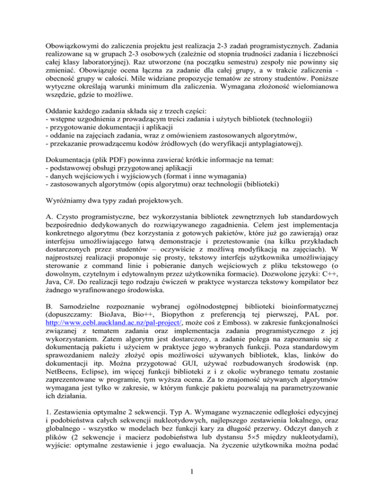 Obowiązkowymi do zaliczenia projektu jest realizacja 2-3 zadań programistycznych. Zadania realizowane są w grupach 2-3 osobowych (zależnie od stopnia trudności zadania i liczebności całej klasy laboratoryjnej). Raz utworzone (na początku semestru) zespoły nie powinny się zmieniać. Obowiązuje ocena łączna za zadanie dla całej grupy, a w trakcie zaliczenia obecność grupy w całości. Mile widziane propozycje tematów ze strony studentów. Poniższe wytyczne określają warunki minimum dla zaliczenia. Wymagana złożoność wielomianowa wszędzie, gdzie to możliwe. Oddanie każdego zadania składa się z trzech części: - wstępne uzgodnienia z prowadzącym treści zadania i użytych bibliotek (technologii) - przygotowanie dokumentacji i aplikacji - oddanie na zajęciach zadania, wraz z omówieniem zastosowanych algorytmów, - przekazanie prowadzącemu kodów źródłowych (do weryfikacji antyplagiatowej). Dokumentacja (plik PDF) powinna zawierać krótkie informacje na temat: - podstawowej obsługi przygotowanej aplikacji - danych wejściowych i wyjściowych (format i inne wymagania) - zastosowanych algorytmów (opis algorytmu) oraz technologii (biblioteki) Wyróżniamy dwa typy zadań projektowych. A. Czysto programistyczne, bez wykorzystania bibliotek zewnętrznych lub standardowych bezpośrednio dedykowanych do rozwiązywanego zagadnienia. Celem jest implementacja konkretnego algorytmu (bez korzystania z gotowych pakietów, które już go zawierają) oraz interfejsu umożliwiającego łatwą demonstracje i przetestowanie (na kilku przykładach dostarczonych przez studentów – oczywiście z możliwą modyfikacją na zajęciach). W najprostszej realizacji proponuje się prosty, tekstowy interfejs użytkownika umożliwiający sterowanie z command linie i pobieranie danych wejściowych z pliku tekstowego (o dowolnym, czytelnym i edytowalnym przez użytkownika formacie). Dozwolone języki: C++, Java, C#. Do realizacji tego rodzaju ćwiczeń w praktyce wystarcza tekstowy kompilator bez żadnego wyrafinowanego środowiska. B. Samodzielne rozpoznanie wybranej ogólnodostępnej biblioteki bioinformatycznej (dopuszczamy: BioJava, Bio++, Biopython z preferencją tej pierwszej, PAL por. http://www.cebl.auckland.ac.nz/pal-project/, może coś z Emboss). w zakresie funkcjonalności związanej z tematem zadania oraz implementacja zadania programistycznego z jej wykorzystaniem. Zatem algorytm jest dostarczony, a zadanie polega na zapoznaniu się z dokumentacją pakietu i użyciem w praktyce jego wybranych funkcji. Poza standardowym sprawozdaniem należy złożyć opis możliwości używanych bibliotek, klas, linków do dokumentacji itp. Można przygotować GUI, używać rozbudowanych środowisk (np. NetBeens, Eclipse), im więcej funkcji biblioteki z i z okolic wybranego tematu zostanie zaprezentowane w programie, tym wyższa ocena. Za to znajomość używanych algorytmów wymagana jest tylko w zakresie, w którym funkcje pakietu pozwalają na parametryzowanie ich działania. 1. Zestawienia optymalne 2 sekwencji. Typ A. Wymagane wyznaczenie odległości edycyjnej i podobieństwa całych sekwencji nukleotydowych, najlepszego zestawienia lokalnego, oraz globalnego - wszystko w modelach bez funkcji kary za długość przerwy. Odczyt danych z plików (2 sekwencje i macierz podobieństwa lub dystansu 5×5 między nukleotydami), wyjście: optymalne zestawienie i jego ewaluacja. Na życzenie użytkownika można podać 1 sekwencje kodujące RNA, które są przez program automatycznie translowane zgodnie z kodem genetycznym na aminokwasowe, składane jako aminokwasowe (a więc przy użyciu macierzy 21×21), a wynik znów przedstawiamy jako dopasowanie w alfabecie RNA (a więc złożenie de facto kodonów sekwencji wejściowych). Liniowe dopasowanie dwóch sekwencji, Liniowe dopasowanie dwóch sekwencji II 2. Zestawienia optymalne 2 sekwencji II. Typ A. Wymagane wyznaczenie podobieństwa całych sekwencji nukleotydowych i najlepszego zestawienia globalnego a) w modelu z dowolną (zadaną w kodzie, nie koniecznie liniową!) funkcją kary za przerwy b) w modelu bez funkcji kary, ale algorytmem o liniowej złożoności pamięciowej (np. Hirschberga). Odczyt danych z plików (2 sekwencje i macierz podobieństwa między nukleotydami), wyjście: optymalne zestawienie i jego ewaluacja. Liniowe dopasowanie dwóch sekwencji, materiały dodatkowe 3. Typ B. Podobne do dwóch poprzednich, ale z użyciem wybranej biblioteki tj. własnoręczna implementacja algorytmów zestawiania lub translacji jest zabroniona. Liniowe dopasowanie dwóch sekwencji, Liniowe dopasowanie dwóch sekwencji II 4. Zestawienia wielu sekwencji. Typ A. Dla zadanego wielodopasowania ciągów nukleotydowych i macierzy podobieństwa wyznaczyć macierz profilu i słowo konsensusowe. Dla dwóch wielodopasowań: zestawić je w jedno przez złożenie (optymalne, globalne, bez funkcji kary za przerwy, macierz podobieństwa liter jest dana) ich profili. Wreszcie: progressive multialigning podanych sekwencji w jedno wielodopasowanie poprzez klasteryzację i zestawienie profili. Strategia wyboru sklejanych pod-dopasowań: dowolna prosta np. UPGMA (tj. guide tree nie wymagane). Wielodopasowanie zbioru sekwencji 5. Zestawienia wielu sekwencji i profile. Typ B. Podobnie jak w przedostatnim: zademonstrować we własnym programie funkcje biblioteki służące do tworzenia i obróbki tym razem wielodopasowań i profili sekwencji. Wielodopasowanie zbioru sekwencji 6. Wykrywanie motywu zadanego w postaci wyrażenia regularnego PROSITE w sekwencji. Typ A. Sprawdzić, czy motyw występuje w podanej sekwencji, a jeśli tak to na których pozycjach. Nie można używać żadnych gotowych funkcji operujących na wyr. regularnych – algorytm implementujemy sami. Uwaga: w formacie PROSITE zabraniamy zagnieżdżonych nawiasów. Slajdy z wykładu 7. Sekwencjonowanie przez hybrydyzację. Typ A. Dany jest multizbiór słów tej samej długości k nad alfabetem