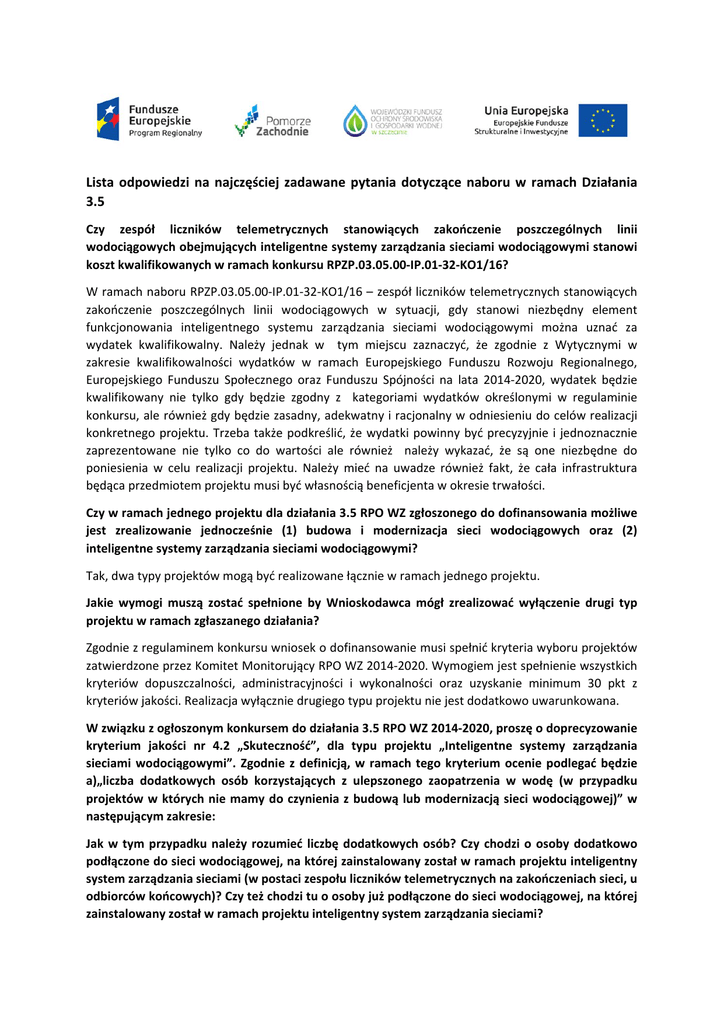 Lista odpowiedzi na najczęściej zadawane pytania dotyczące naboru w ramach Działania 3.5 Czy zespół liczników telemetrycznych stanowiących zakończenie poszczególnych linii wodociągowych obejmujących inteligentne systemy zarządzania sieciami wodociągowymi stanowi koszt kwalifikowanych w ramach konkursu RPZP.03.05.00‐IP.01‐32‐KO1/16? W ramach naboru RPZP.03.05.00‐IP.01‐32‐KO1/16 – zespół liczników telemetrycznych stanowiących zakończenie poszczególnych linii wodociągowych w sytuacji, gdy stanowi niezbędny element funkcjonowania inteligentnego systemu zarządzania sieciami wodociągowymi można uznać za wydatek kwalifikowalny. Należy jednak w tym miejscu zaznaczyć, że zgodnie z Wytycznymi w zakresie kwalifikowalności wydatków w ramach Europejskiego Funduszu Rozwoju Regionalnego, Europejskiego Funduszu Społecznego oraz Funduszu Spójności na lata 2014‐2020, wydatek będzie kwalifikowany nie tylko gdy będzie zgodny z kategoriami wydatków określonymi w regulaminie konkursu, ale również gdy będzie zasadny, adekwatny i racjonalny w odniesieniu do celów realizacji konkretnego projektu. Trzeba także podkreślić, że wydatki powinny być precyzyjnie i jednoznacznie zaprezentowane nie tylko co do wartości ale również należy wykazać, że są one niezbędne do poniesienia w celu realizacji projektu. Należy mieć na uwadze również fakt, że cała infrastruktura będąca przedmiotem projektu musi być własnością beneficjenta w okresie trwałości. Czy w ramach jednego projektu dla działania 3.5 RPO WZ zgłoszonego do dofinansowania możliwe jest zrealizowanie jednocześnie (1) budowa i modernizacja sieci wodociągowych oraz (2) inteligentne systemy zarządzania sieciami wodociągowymi? Tak, dwa typy projektów mogą być realizowane łącznie w ramach jednego projektu. Jakie wymogi muszą zostać spełnione by Wnioskodawca mógł zrealizować wyłączenie drugi typ projektu w ramach zgłaszanego działania? Zgodnie z regulaminem konkursu wniosek o dofinansowanie musi spełnić kryteria wyboru projektów zatwierdzone przez Komitet Monitorujący RPO WZ 2014‐2020. Wymogiem jest spełnienie wszystkich kryteriów dopuszczalności, administracyjności i wykonalności oraz uzyskanie minimum 30 pkt z kryteriów jakości. Realizacja wyłącznie drugiego typu projektu nie jest dodatkowo uwarunkowana. W związku z ogłoszonym konkursem do działania 3.5 RPO WZ 2014‐2020, proszę o doprecyzowanie kryterium jakości nr 4.2 „Skuteczność”, dla typu projektu „Inteligentne systemy zarządzania sieciami wodociągowymi”. Zgodnie z definicją, w ramach tego kryterium ocenie podlegać będzie a)„liczba dodatkowych osób korzystających z ulepszonego zaopatrzenia w wodę (w przypadku projektów w których nie mamy do czynienia z budową lub modernizacją sieci wodociągowej)” w następującym zakresie: Jak w tym przypadku należy rozumieć liczbę dodatkowych osób? Czy chodzi o osoby dodatkowo podłączone do sieci wodociągowej, na której zainstalowany został w ramach projektu inteligentny system zarządzania sieciami (w postaci zespołu liczników telemetrycznych na zakończeniach sieci, u odbiorców końcowych)? Czy też chodzi tu o osoby już podłączone do sieci wodociągowej, na której zainstalowany został w ramach projektu inteligentny system zarządzania sieciami? Jeżeli Wnioskodawca będzie realizował projekt tylko w ramach jednego typu tj. Inteligentne systemy zarządzania sieciami wodociągowymi, tzn. że do sieci wodociągowej nie zostaną podłączone nowy osoby. Dlatego też, w tym przypadku mowa jest jedynie o osobach już podłączonych do sieci wodociągowej, które dzięki realizacji projektu będą korzystały z ulepszonego zaopatrzenia w wodę. Jak w tym przypadku rozumieć ulepszone zaopatrzenie w wodę? Czy instalacja inteligentnego systemu zarządzania sieciami (w postaci zespołu liczników telemetrycznych na zakończeniach sieci, u odbiorców końcowych) stanowi ulepszone zaopatrzenie w wodę? Proszę o rozwinięcie tego zagadnienia. Przez ulepszone zaopatrzenie w wodę, osiągnięte dzięki inteligentnemu systemowi zarządzania sieciami wodociągowymi, należy rozumieć w szczególności systemy, które umożliwiają przedsiębiorstwom wodociągowym sterowanie ciśnieniem i strumienia objętości wody, monitorować jakość wody, wykrywać i zdalnie lokalizować wycieki. Jednym z elementów systemu może być zespołu liczników telemetrycznych na zakończeniach sieci, u odbiorców końcowych. Czy: a) Zagospodarowanie terenu przepompowni wody oraz w okolicy stacji uzdatnia wody, b) odtwarzanie nawierzchni utwardzonych, c) odtworzenie chodników, d) odtworzenie nawierzchni drogowych, e) roboty elektryczne związane z rozbudową ujęcia wody i budową stacji uzdatniania wody, f) ogrodzenie i zagospodarowanie terenu wokół stacji uzdatniania wody , g) koszt dobudowy budynku chlorowni, koszt remontu budynku chlorowni, h) remont budynku technologicznego hali filtrów, i) remont budynku administracyjno‐biurowego, j) wykonanie płyty fundamentowej pod zbiornik wody czystej, k) studnie głębinowe‐ wykonanie, l) wykonanie zbiornika wody czystej, jest kosztem niekwalifikowanym? – konkurs RPZP.03.05.00‐IP.01‐32‐KO1/16. W ramach naboru RPZP.03.05.00‐IP.01‐32‐KO1/16: a), e), f) ‐ Wydatki muszą być zasadne, adekwatne i racjonalne w odniesieniu do celów realizacji konkretnego projektu, b),c),d) ‐ Zgodnie z § 7 ust. 2 lit. f regulaminu naboru wydatkiem kwalifikowalnym jest odtworzenie pasa drogowego w zakresie wynikającym z zezwolenia na zajęcia pasa drogowego, j), l) ‐ Zgodnie z § 7 ust. 3 lit. e regulaminu naboru wydatkiem niekwalifikowalnym jest budowa zbiornika zapasów wody pitnej i) – Konkurs dotyczy typów projektów „Budowy i modernizacja sieci wodociągowych” oraz „Inteligentne systemy zarządzania sieciami wodociągowymi”, remont budynków administracyjno‐ biurowych nie