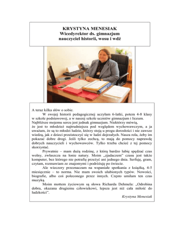 KRYSTYNA MENESIAK Wicedyrektor ds. gimnazjum nauczyciel historii, wosu i wdż A teraz kilka słów o sobie. W swojej historii pedagogicznej uczyłam 6-latki, potem 4-8 klasy w szkole podstawowej, a w naszej szkole uczniów gimnazjum i liceum. Najbliższe mojemu sercu jest jednak gimnazjum. Niektórzy mówią, że jest to młodzież najtrudniejsza pod względem wychowawczym, a ja uważam, że są to młodzi ludzie, którzy stoją u progu dorosłości i nie zawsze wiedzą, jak z dzieci przeistoczyć się w ludzi dojrzałych. Nasza rola, żeby im pokazać dobre drogi. Jeśli tylko zechcą, to mają do pomocy naprawdę dobrych nauczycieli i wychowawców. Tylko trzeba chcieć z tej pomocy skorzystać. Prywatnie – mam dużą rodzinę, z którą bardzo lubię spędzać czas wolny, zwłaszcza na łonie natury. Moim „zjadaczem” czasu jest także komputer, bez którego nie potrafię przeżyć ani jednego dnia. Serfuję, gram, czytam, rozmawiam ze znajomymi i podróżuję po świecie. Ale wieczory przeznaczam na wspaniałe spotkania z książką, 4-5 miesięcznie – to norma. Nie mam swoich ulubionych typów. Nowości, biografie, albo coś poleconego przez innych. Często umilam ten czas muzyką. Moim mottem życiowym są słowa Richarda Dehmela: „Odrobina dobra, okazana drugiemu człowiekowi, lepsza jest niż cała miłość do ludzkości”. Krystyna Menesiak
