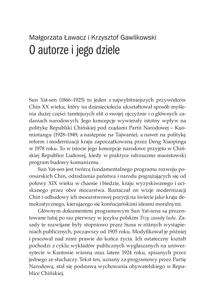 Małgorzata Ławacz i Krzysztof Gawlikowski O autorze i jego dziele Sun Yat-sen (1866–1925) to jeden z najwybitniejszych przywódców Chin XX wieku, który na dziesięciolecia ukształtował sposób myślenia dużej części tamtejszych elit o swojej ojczyźnie i o głównych zadaniach narodowych. Jego koncepcje wywierały istotny wpływ na politykę Republiki Chińskiej pod rządami Partii Narodowej – Kuo mintangu (1928–1949, a następnie na Tajwanie), a nawet na politykę reform i modernizacji kraju zapoczątkowaną przez Deng Xiaopinga w 1978 roku. To w istocie jego koncepcje narodowe przyjęto w Chińskiej Republice Ludowej, kiedy w praktyce odrzucono maoistowski program budowy komunizmu. Sun Yat-sen jest twórcą fundamentalnego programu rozwoju pocesarskich Chin, odrodzenia państwa i narodu pogrążających się od połowy XIX wieku w chaosie i biedzie, kraju wyzyskiwanego i uciskanego przez obce mocarstwa. Roztaczał on wizje modernizacji Chin i odbudowy ich mocarstwowej pozycji na świecie jako kraju demokratycznego, kierującego się konfucjańskimi ideami moralnymi. Głównym dokumentem programowym Sun Yat-sena są prezentowane tutaj po raz pierwszy w języku polskim Trzy zasady ludu. Zasady te rozwijane były stopniowo przez Suna w różnych wystąpieniach publicznych, począwszy od 1905 roku. Modyfikował je później i pracował nad nimi prawie do końca życia. Ich ostateczny kształt pochodzi z cyklu wykładów publicznych wygłaszanych na uniwersytecie w Kantonie wiosną oraz latem 1924 roku, spisanych przez jednego ze słuchaczy. Tekst ten, uznany za programowy przez Partię Narodową, stał się podstawą wychowania obywatelskiego w Republice Chińskiej. 10 Wprowadzenie Pierwsze próby przybliżenia polskiemu czytelnikowi postaci Sun Yat-sena i przeprowadzonej według jego koncepcji rewolucji, która obaliła cesarstwo (zainicjowanej 10 października 1911 roku), znanej też jako Rewolucja Xinhai (rewolucja sinhajska), podjęte zostały trzy lata temu, w stulecie tego przełomowego wydarzenia we współczesnej historii Chin. Wiosną 2011 roku w Szkole Wyższej Psychologii Społecznej w Warszawie zorganizowane zostało seminarium poświęcone tej rocznicy, a jesienią tego samego roku na Uniwersytecie Warszawskim odbyła się międzynarodowa konferencja zorganizowana wspólnie przez Katedrę Sinologii UW oraz Centrum Cywilizacji Azji Wschodniej SWPS. Wydano wtedy specjalny tom 14. (2011) czasopisma „Azja–Pacyfik” poświęcony tej rewolucji. Zamieszczono w nim wiele interesujących artykułów, w tym bezpośrednio dotyczących postaci Suna, by wymienić tylko tekst profesor Chen Yunqian z Nankinu pod tytułem Sun Yat-sen jako symbol w pamięci politycznej klas niższych we współczesnych Chinach, tekst badacza z Tajpej, doktora Pan Kuang-che, pod tytułem Sun Yat-sen i jego analiza „międzynarodowej pozycji Chin” czy szkic pióra Agnieszki Łobacz, tłumaczki prezentowanego właśnie Państwu dzieła, zatytułowany „Trzy zasady ludu” – dokument programowy Sun Yat-sena – refleksje tłumaczki. Warszawskie obchody okazały się nader inspirujące. Dwa lata później profesor Bogdan Góralczyk, jeden z ich uczestników, wydał pierwszą w Polsce biografię Suna – Sun Yat-sen. Misjonarz rewolucji (Wydawnictwo Rambler, Warszawa 2013). A obecnie możemy zaprezentować naszą publikację, w której zamieszczamy nieco skrócony tekst Trzech zasad ludu. Tłumaczenie dokonane zostało na podstawie pekińskiego dwutomowego wydania zbioru dzieł Suna – Sun Zhongshan xuanji (孫 中山選集 [Pisma wybrane Sun Yat-sena], Renmin Chubanshe, Beijing 1956). Tekst tam zamieszczony porównywano z jednym z pierwszych oficjalnych kuomintangowskich wydań dzieła, Sanminzhuyi (三民 主義, Trzy zasady ludu), które ukazało się w 1927 roku w szanghajskim wydawnictwie Shangwu Yinshuguan. Tłumaczka korzystała również z wydań tajwańskich, których jest kilka, gdzie występowały niewielkie różnice w tekstach, w przekładzie w praktyce nieistotne. O autorze i jego dziele 11 Podstawowego materiału porównawczego dostarczyło wydanie Sanminzhuyi (三民主義 [Trzy zasady ludu], Sanmin Shuju Gufen Youxian Gongsi, Taibei 1965). Korzystano także z liczącego 12 tomów tajwańskiego wydania zbioru pism Sun Yat-sena Guofu quanji (國父全集 [Pełny zbiór dzieł Ojca Narodu], Jindai Zhongguo Chubanshe, Taibei 1989, tom 1). W niewielkim stopniu korzystano natomiast z oficjalnego, kuomintangowskiego przekładu Trzech zasad na angielski (Dr. Sun Yat-sen, San min chu i – The Three Principles of the People, with Two Supplementary Chapters: 1. National Fecundity, Social Welfare and Education; 2. Health and Happiness by President Chiang Kai-shek, Government Information Office, Taipei 1990), gdyż jest to przekład mało precyzyjny i z licznymi dość dyskusyjnymi skrótami, najwyraźniej dostosowywany ideologicznie do potrzeb czytelnika zagranicznego. Skróty dokonane przez tłumaczkę oraz redaktorów dotyczyły głównie powtórzeń bądź spraw bardzo szczegółowych czy też zdezaktualizowanych. Jedynie w części trzeciej, przy przedstawianiu zasady dobrobytu ludu, były to cięcia zasadnicze, z pozostawieniem podstawowych założeń, gdyż większość proponowanych tam konkretnych rozwiązań jest już nieaktualna i mogłaby interesować przede wszystkim badaczy historii Chin. Tekst tłumaczenia Agnieszki Łobacz podlegał jeszcze szczegółowej redakcji naukowej, a poniekąd i stylistycznej, oczywiście we współpracy z tłumaczką, przez Małgorzatę Ławacz i Krzysztofa Gawlikowskiego od wielu lat studiującego (i cytującego) różne teksty Suna. Jedną z trudnych kwestii były sprawy chińskiej terminologii politycznej, która w latach 20. XX wieku dopiero się kształtowała, podobnie jak sam język dyskursu politycznego. Dlatego przy ważniejszych terminach podajemy ich oryginały chińskie i omawiamy je w przypisach. Inną kwestią była próba moder